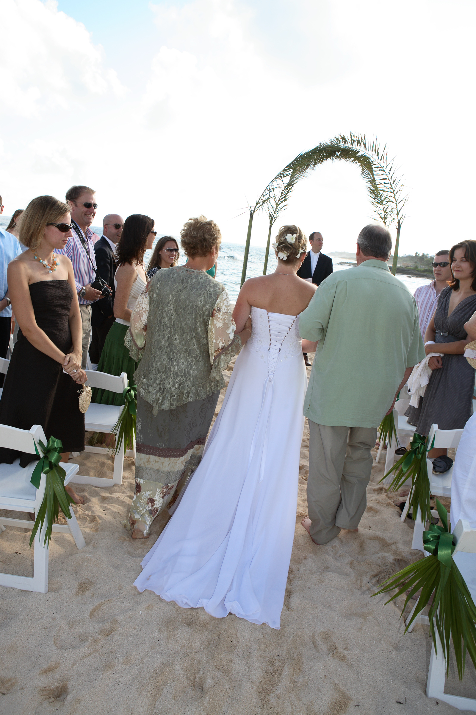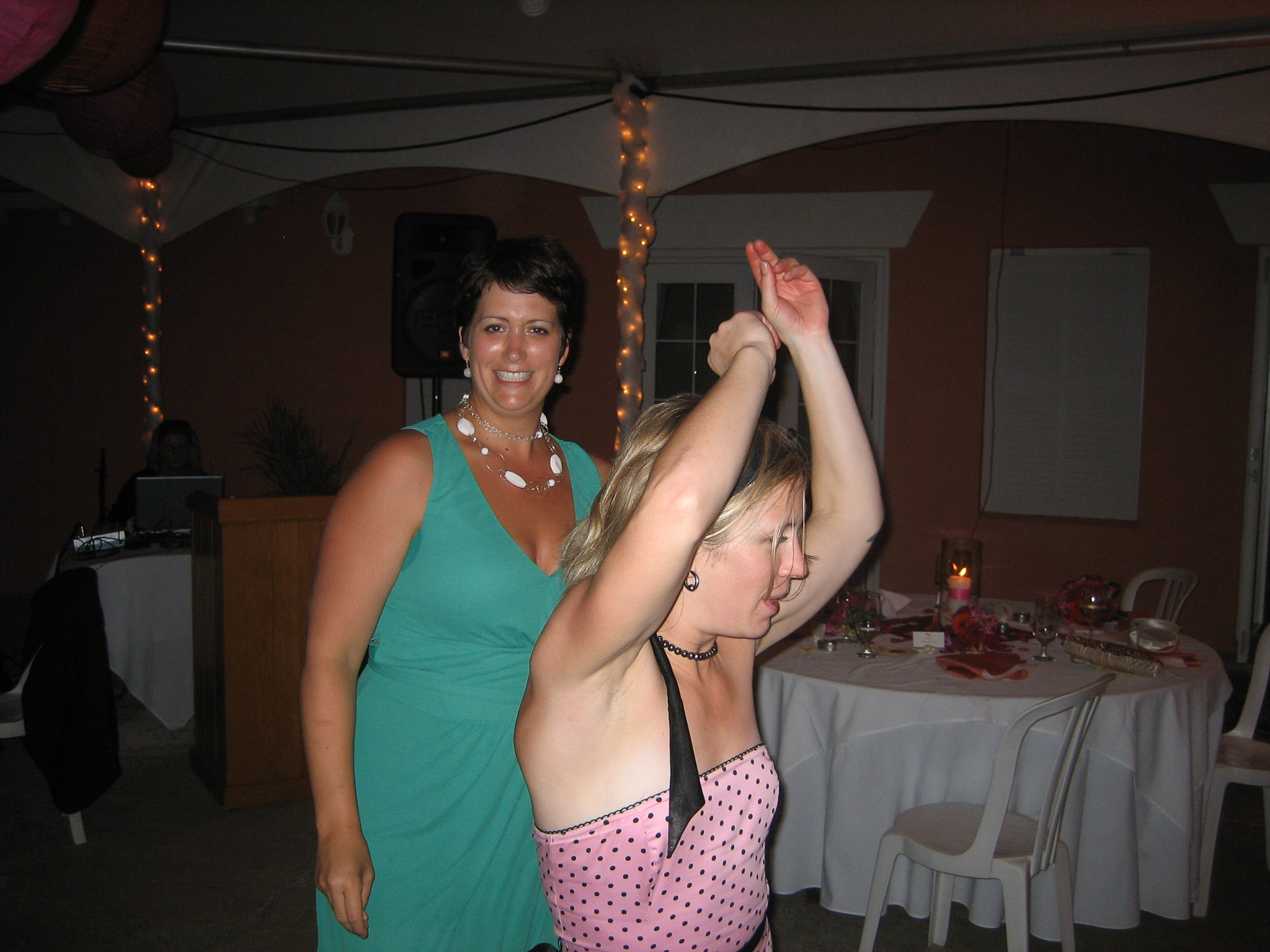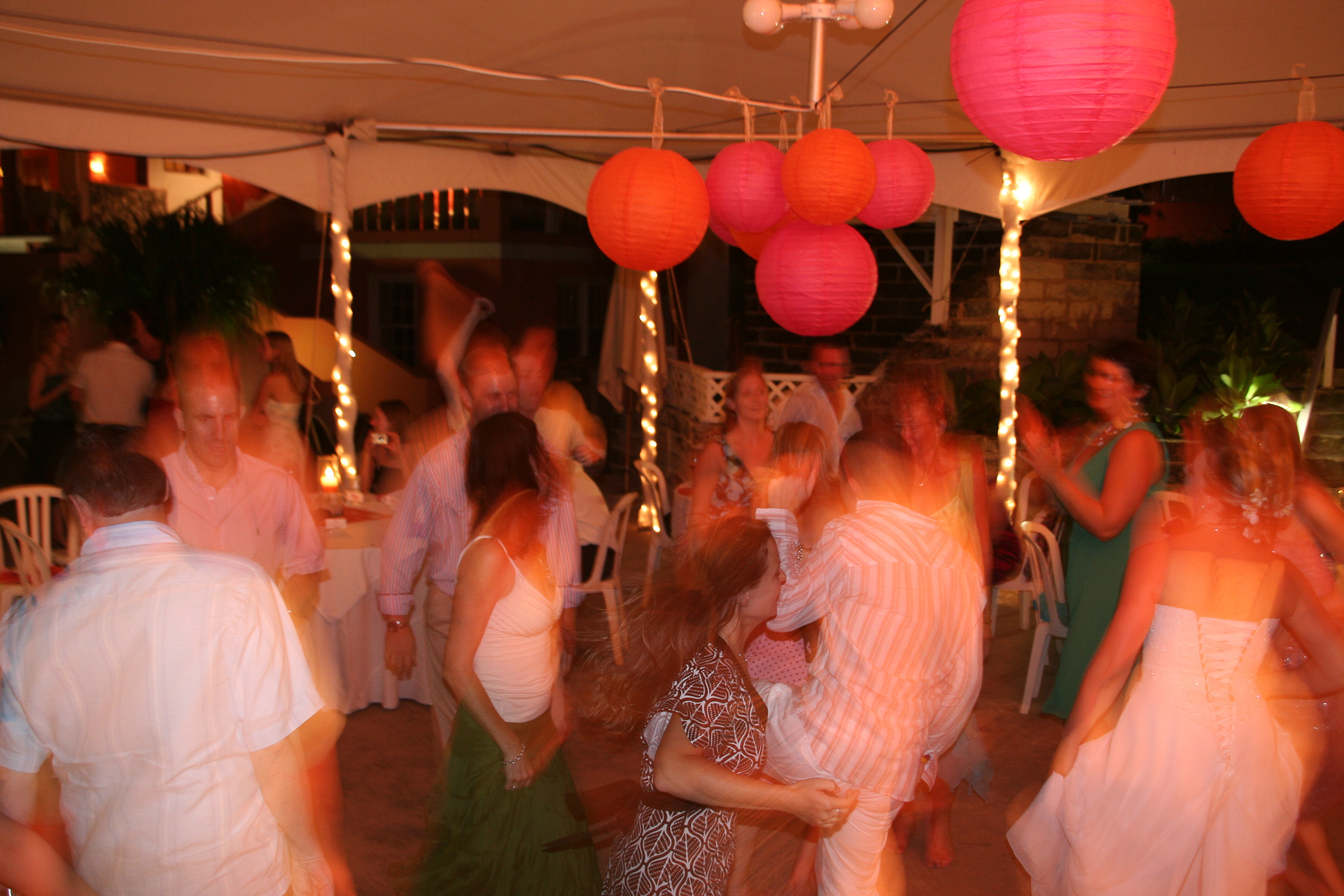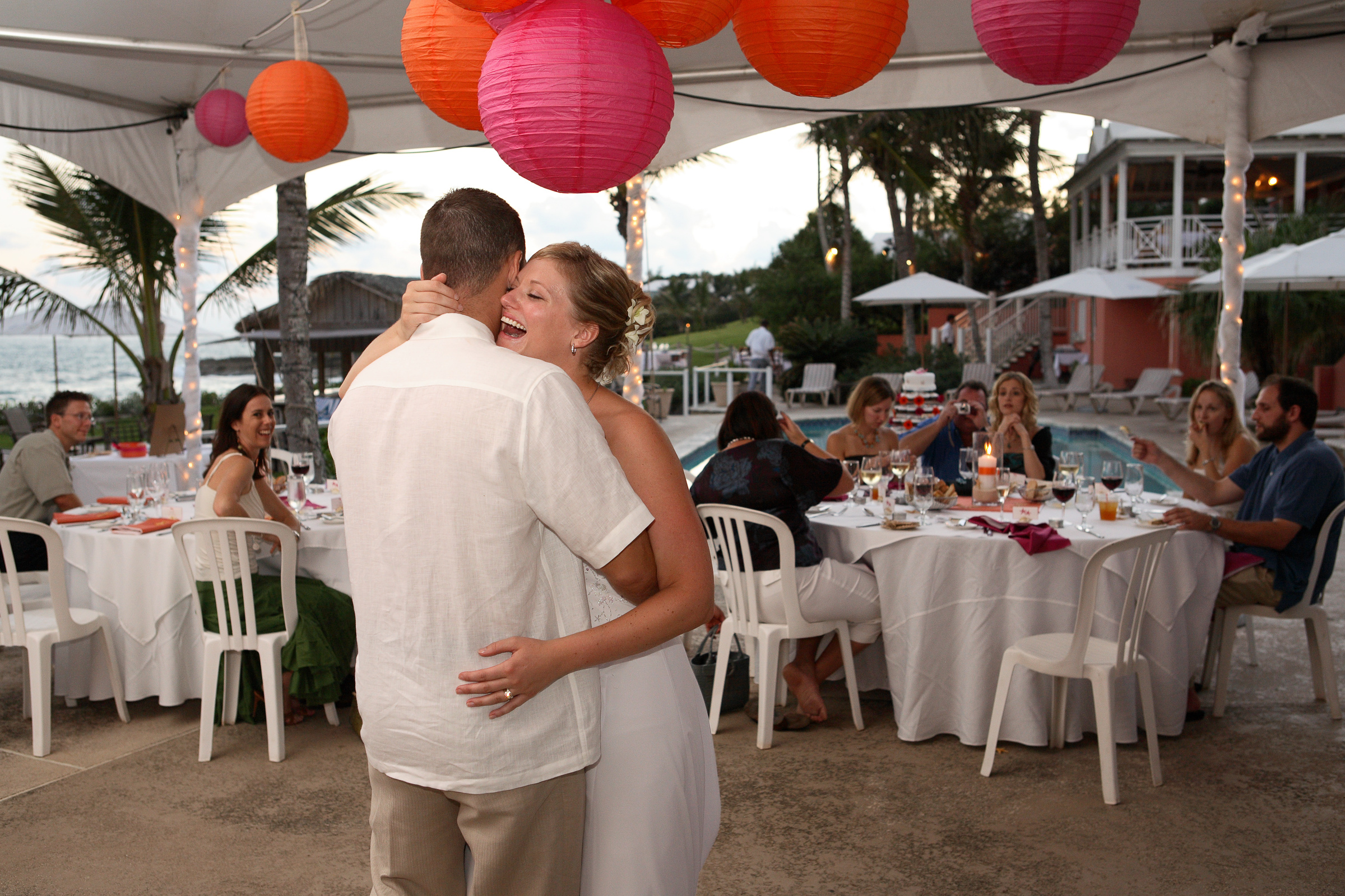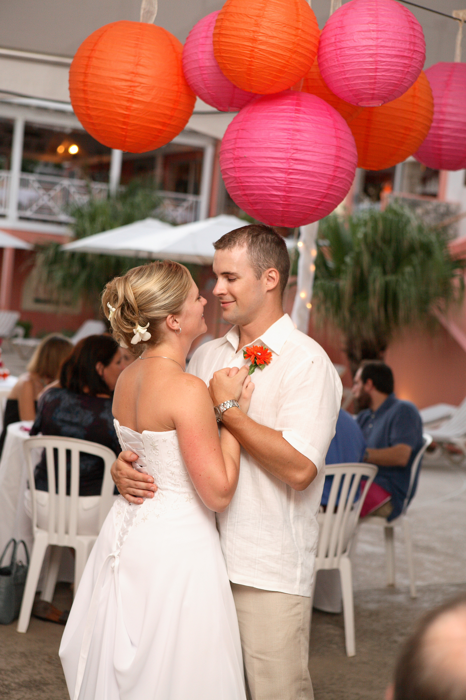 After the cocktail reception, it was over to the dinner area, a few steps away from where cocktails were served. Our colors were pink and orange, we implemented these everywhere in the dinner tent area – hanging lanterns, napkins, candle wrappers, place cards, flowers on the cake… It all worked out well, it looked fantastic, the folks at Ariel Sands did a great job. We had our official ‘first dance’ before dinner was served, in order to have better light for our pictures! (Yes, more pictures! Dinner was promptly served thereafter, we opted for a buffet-style menu and it was quite tasty! After we stuffed ourselves and had a few short and sweet speeches, it was time to put on the dancing shoes and party hat…