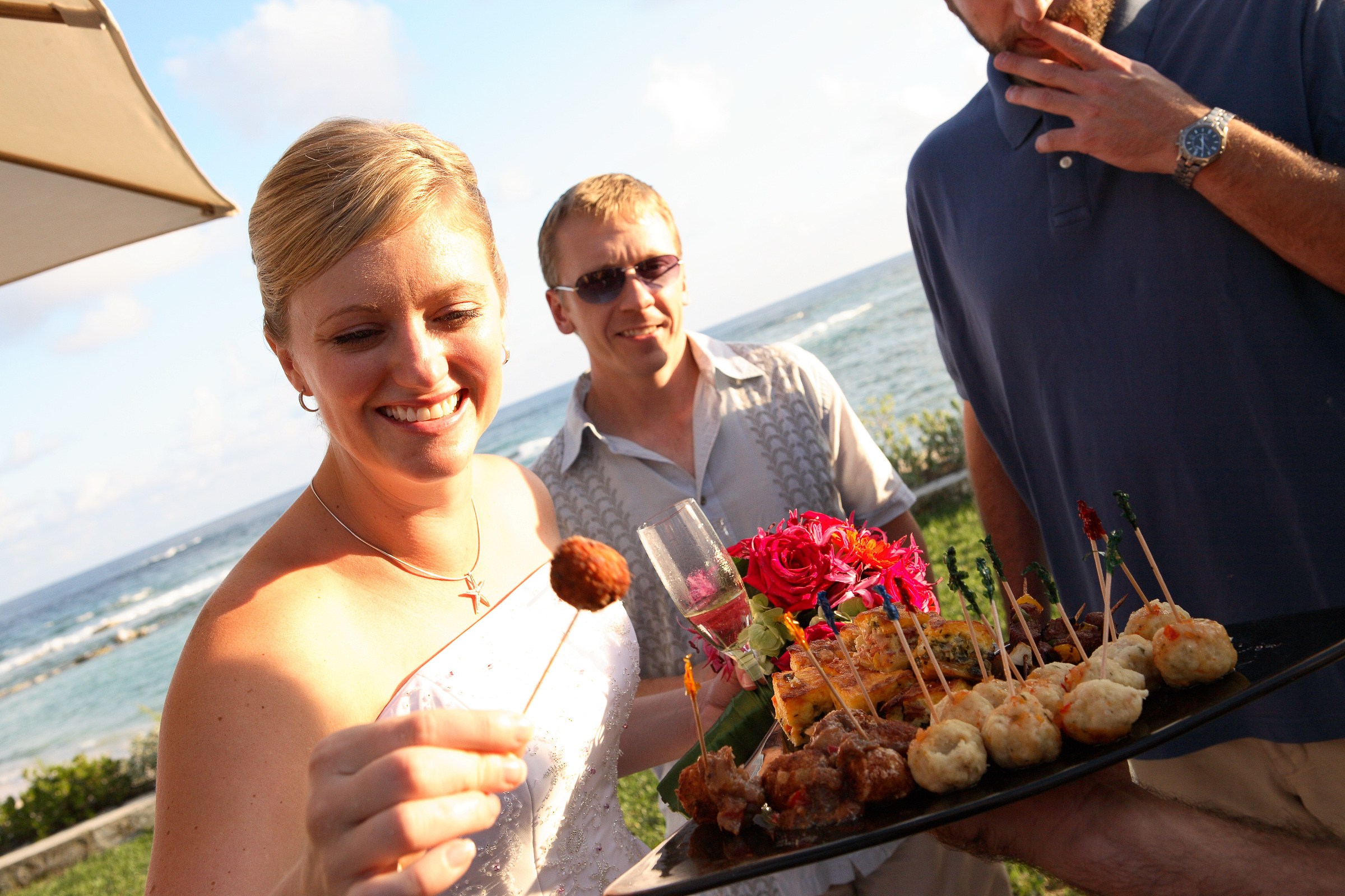 So after the initial photo shoot, we made our first official appearance as husband and wife at our cocktail reception, at the beach-side next to where the ceremony took place. All the guests were able to head up there to whet their whistles while we were getting our pictures taken – it worked out quite well for everyone! The champagne was flowing, and as responsible hosts, we had hot and cold food being served by waiters (yes, fancy!). It was a great way to get the night started.
