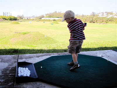 Josh and I (Daddy) often make a trip out to the Bermuda Gold Academy to smack a few golf balls and, if time permits, we play a round of mini-golf as well. Josh had received a new golf bag and some with some swanky new clubs from friends for his birthday, you can see him happily toting his backpack-style bag up to the tees at the range. Mom & Ryley were bored this morning, too, so they decided to tag along.