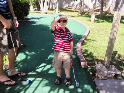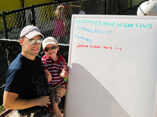 It’s taken a little bit of practise to get Josh used to putting vs. really giving it a smack as he does on the range. Typically the first few holes of the mini-golf consist of me looking for his ball off the side or ends of the course! Today was no exception, but clearly by #4 he had settled down, as he was able to get a hole in one!