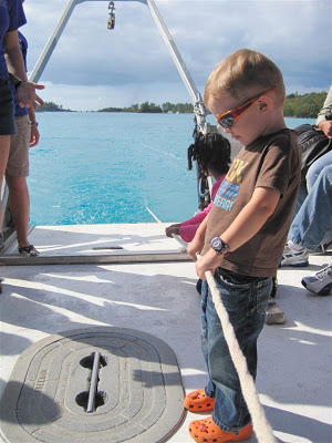 In addition to the puppet show, we got to go on a very short boat tour, where the staff explained how they do testing of this and of that (it got a little technical, even for me!); the kid-friendly portion of the tour involved throwing in a fine-mesh net into the water (to catch micro-organisms) that was attached to a rope, and dragging it behind the boat. Josh volunteered to be helpful and he and a few other kids were able to help throw the net in the water, hold the rope as it dragged behind, and then haul it back in again. It was nice to do something a little different for once here on the island!
