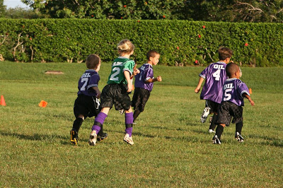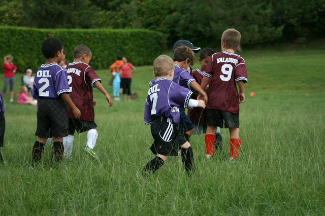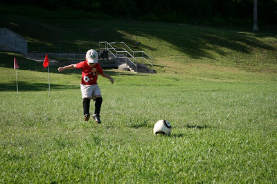 Our little sports monster was tired of playing soccer in the backyard with just Dad, so we figured we’d get him in a little soccer league this year. He’s at the bottom end of his league’s age category (4-6), but it doesn’t bother him that he’s one of the smallest kids on the field! He’s been having fun so far…