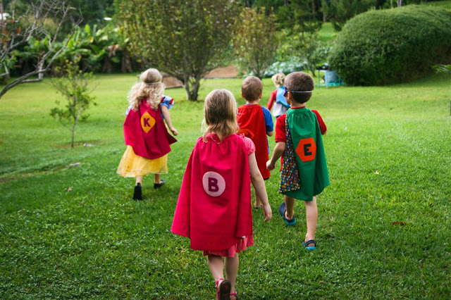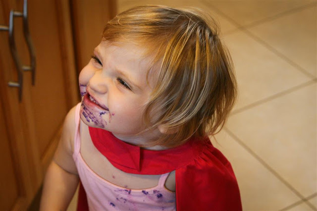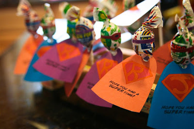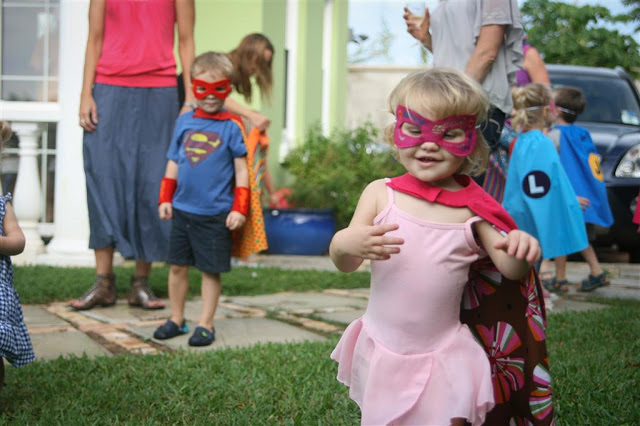For the scavenger hunt, Jenn had made up these little cards to read to the kids with clues as to where the next one was. The end of the hunt had the kids grabbing a little frozen superhero from a cooler and smashing them open on the sidewalk! The kids thought it was great, it was fun to see all the little superheroes running around the yard towards the next clue, capes all a-flutter!