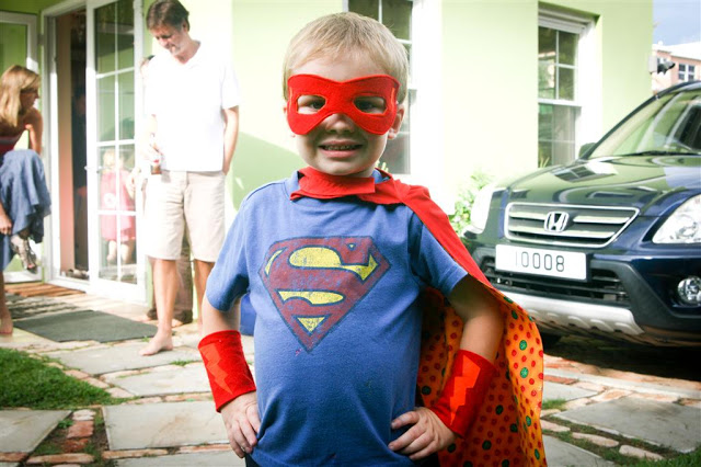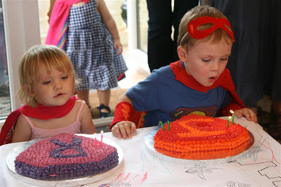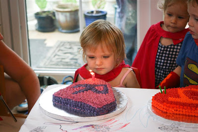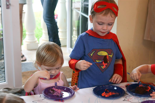 The kids each got their own cake, they were in the shape of their super ’emblem’ that was on the back of their capes. Of course, the cakes were chocolate. And surprisingly, Josh had 2 pieces (he’s usually not huge on the cake)!