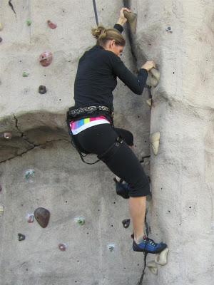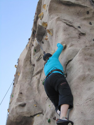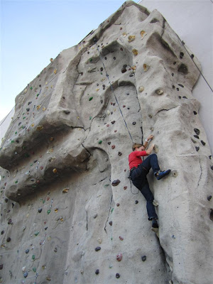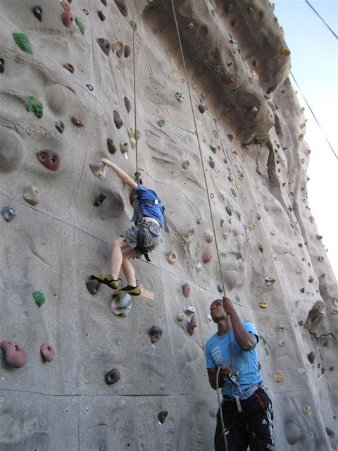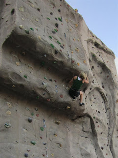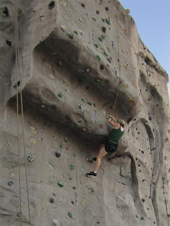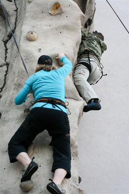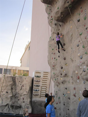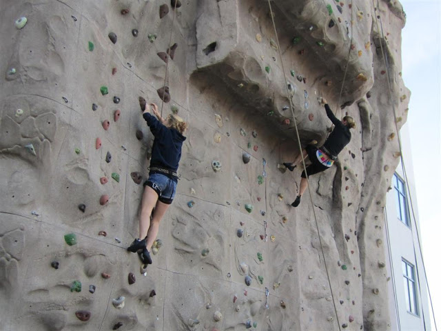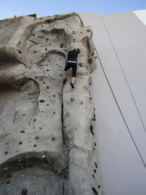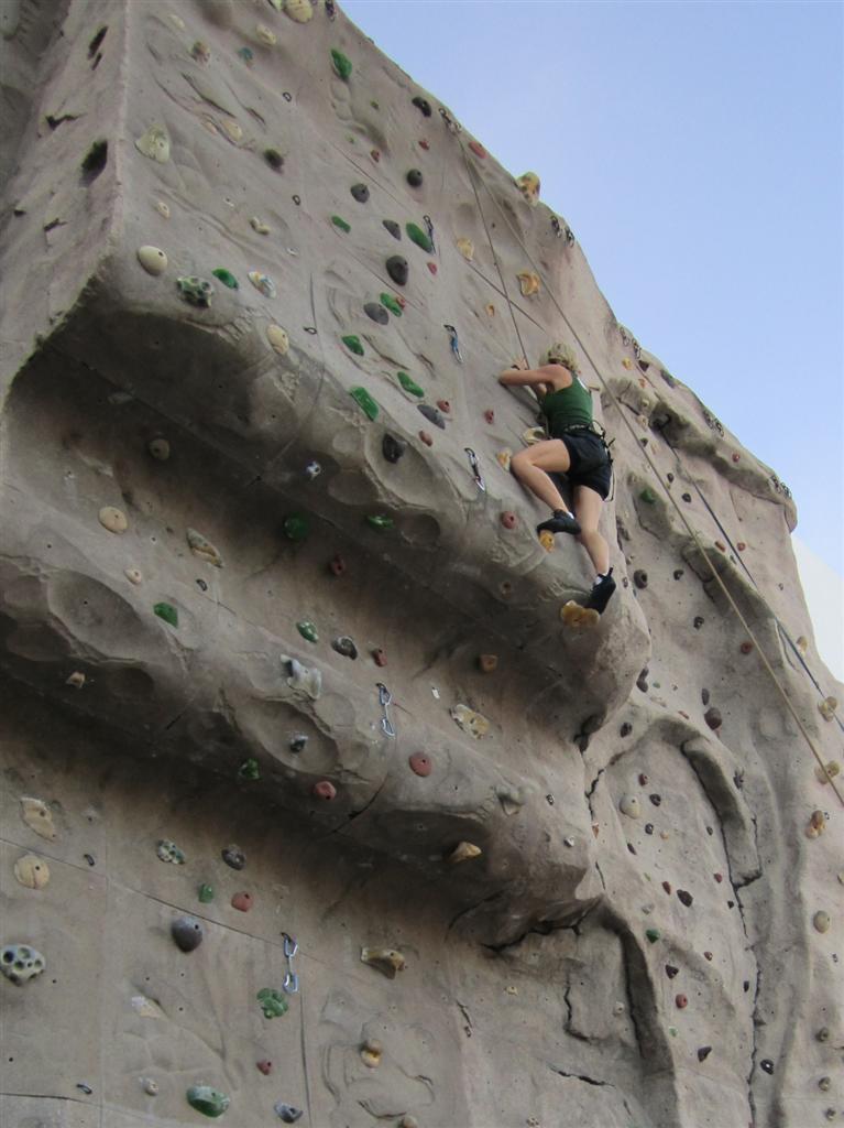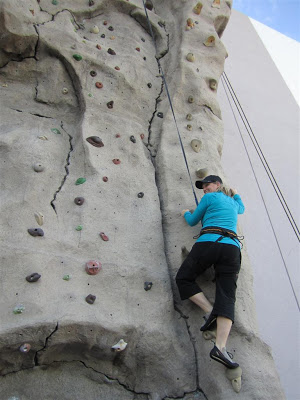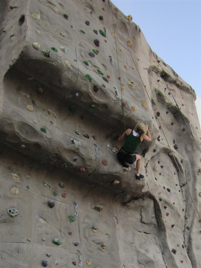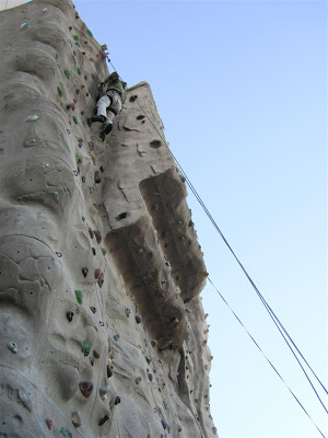 The wall itself is rumored to be about 35 feet high, there are several ‘routes’ marked by similar-colored hand and foot holds, of course some routes are easier than others! There are four rope / pulleys on the wall so that you can theoretically have four climbers going at once – we had one staff member there to start to work one of the support ropes (called ‘belaying’, I’m told), and one of the ropes had an automatic belaying device (no human required for support – perhaps slightly unnerving!), so we were going two at a time.