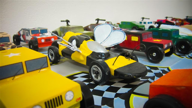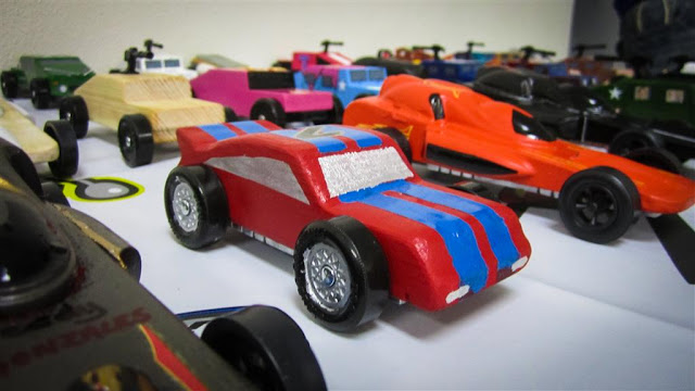 As you can see, there was quite an assortment of cars brought on the day. What they did is give the kids a choice from about three kits, each kit consisted of a block of wood vaguely in the shape of a car, some wheels, axles, and weights. What we did with them after that was up to us. Generally speaking most of the dads just painted up the block of wood and stuck on the wheels and as much weight as possible – I took a little extra time and molded the wood a bit with my electric sander and a saw to make the kids’ cars a little different than the rest, which they enjoyed!