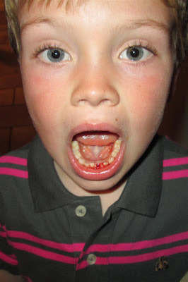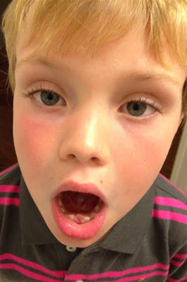 Just a quick one to let you know that Josh finally lost his first tooth yesterday! He has had a very loose tooth for a while (lower front one in the middle), we have actually been able to see the new tooth poking out of his gum behind his loose one for at least a few weeks! Josh said his tooth came out when he was nudged by Cooper (the dog) and he bumped his mouth on something and voila! It fell out on the floor!