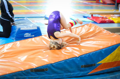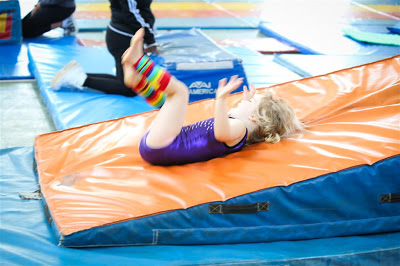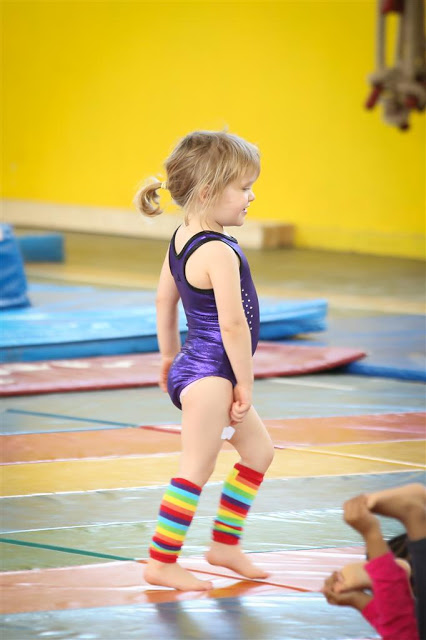 Josh and I were lucky to tag along to see her for one session one rainy Saturday morning recently, so I seized the opportunity to bring the big camera and get some pics of our little gymnast in action! Jenn got her this cute little purple leotard with sequins and all that on it, Roo loves it.
