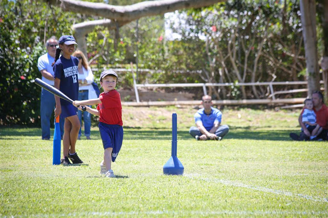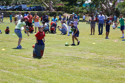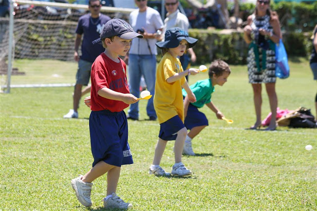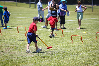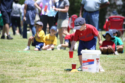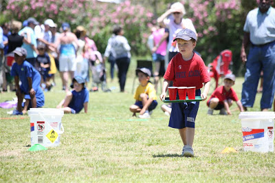 Josh did pretty well today, he had lots of fun and his best finish was a 2nd place in the egg balancing race. His best event he saved for last – it was basically tee-ball! Each kid had two hits to see who could hit the furthest, there were lines on the ground that indicated a point value. He smacked that tennis ball good and far for his team!