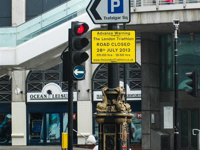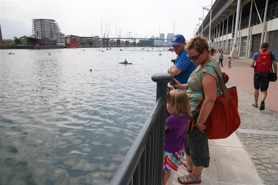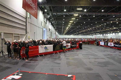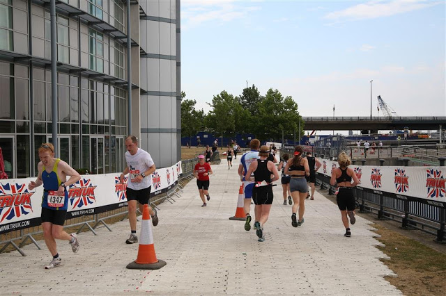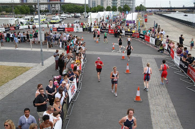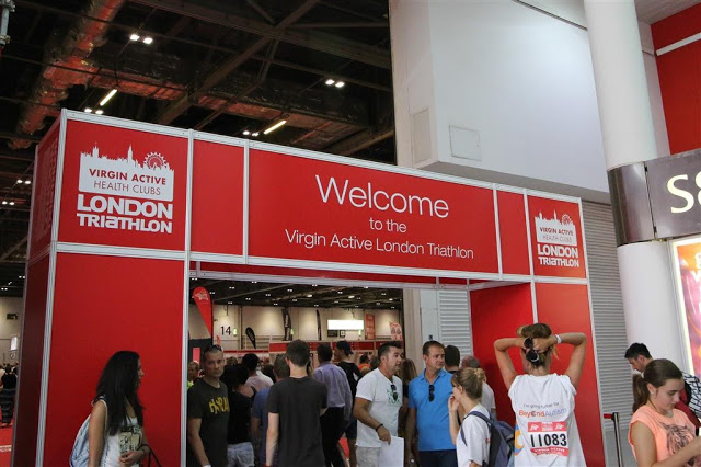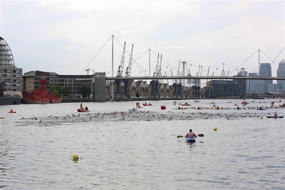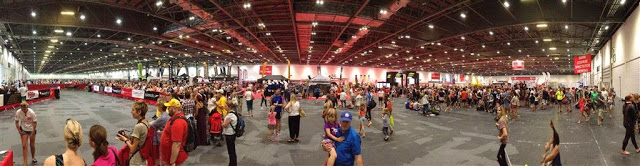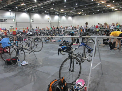 With so many participants in the race over the weekend, it was all done in stages, as you would imagine. Jenn was able to borrow a bike from a coworker in the London office, which worked out great. You can see here how big the transition area is (this is a BIG building) and as well a ‘heat’ of swimmers all lining up for their turn to walk to the start line outside alongside the water.