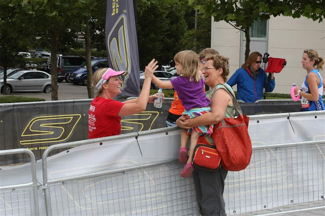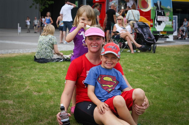 I managed to see Jenn zip by on the bike from afar from our high vantage point nearby (I yelled at the last minute and she said she heard me!), but that was the only time we saw her on the bike. As Jenn hadn’t seen any of us in a week it was a very happy and joyful high-five and hug for the Roo with some big waves and all that for Josh and the rest of the family along a stretch of road where we could actually get to the front and the kids could see her! We saw her a few more times during the run and then we gathered at her charity’s tent after the race for a proper reunion.