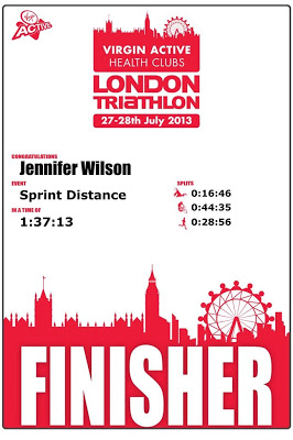 All in all it was a great experience for her she says; a few technical difficulties aside she performed admirably and pulled off a 1:37:13, good for 16th of 99 women in her age group and 116th of 734 women who did the sprint triathlon in total.