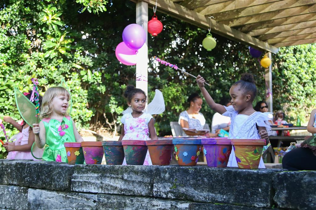 Once the pots were all done, we filled them with some dirt and planted a seed in each of them. Then we had all the girls take their newly-made fairy wands and wave them over all the pots, imparting a little of their fairy magic…