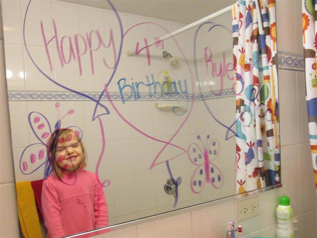 October is a pretty busy month here in the Wilson household – the culmination of the craziness this year, as most years, is Ryley’s birthday! Ryley had her 4th birthday on October 26th, a Saturday. She woke up to a similar sight as Josh did, a crazy display on the mirror in the bathroom, which tickled her fancy and got the day off to a good start!