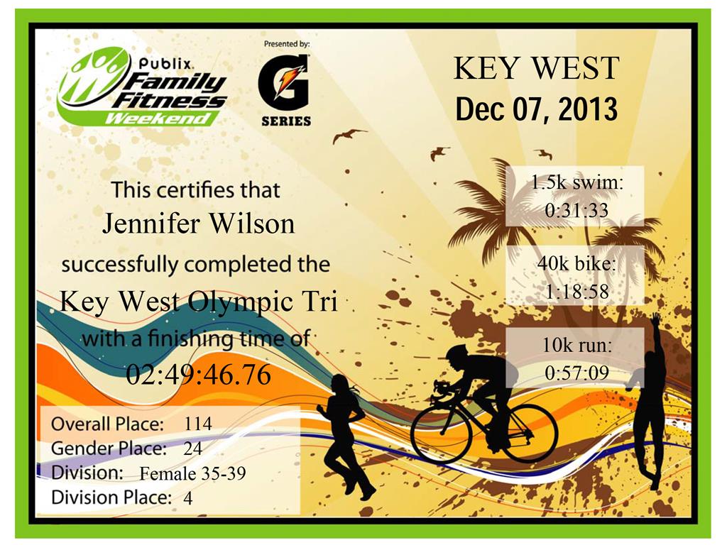 The pair were pleased with their race results, it was Kandis’ first Olympic-distance triathlon and she did really well, turning in a sub-three hour performance! Jenn’s previous Olympic race was in September of 2012 where she posted a 3:08:02 – she destroyed that time in this one, very well done! Congratulations to the two of you – results are below, as well as Jenn’s finishing certificate.
