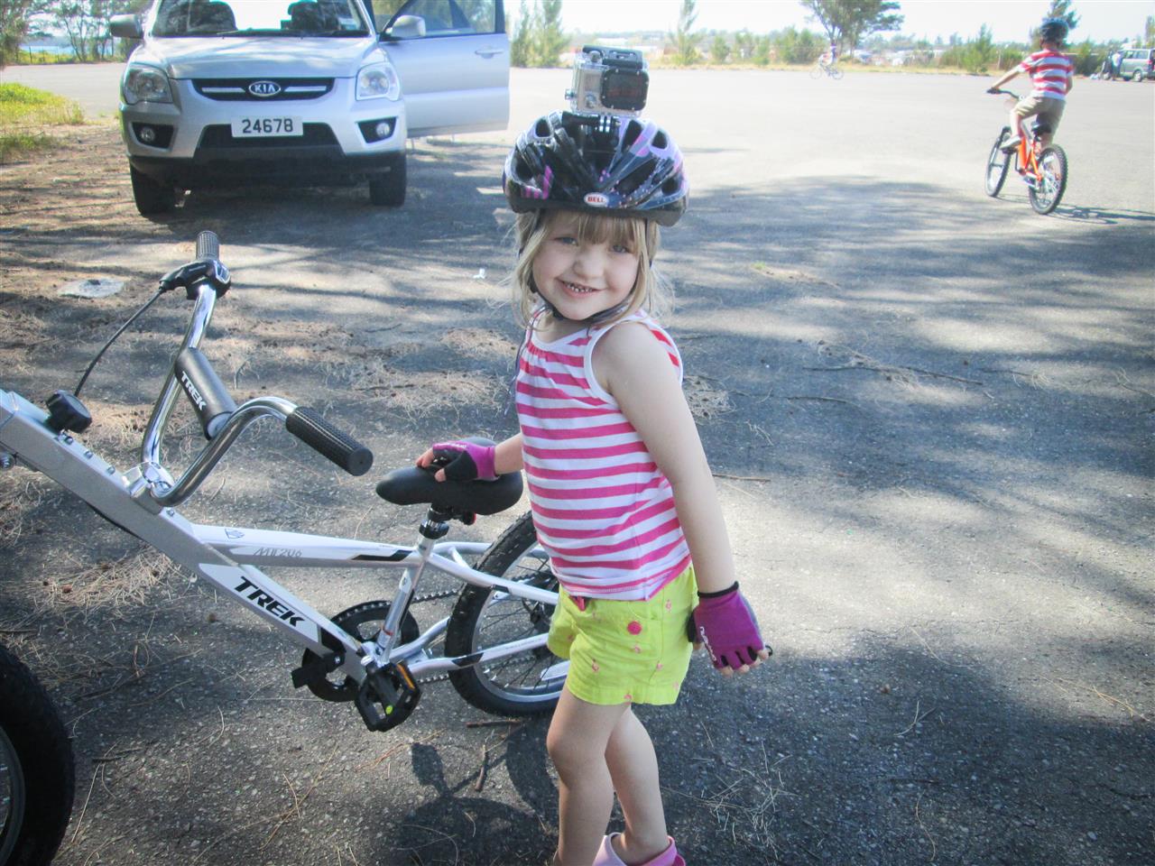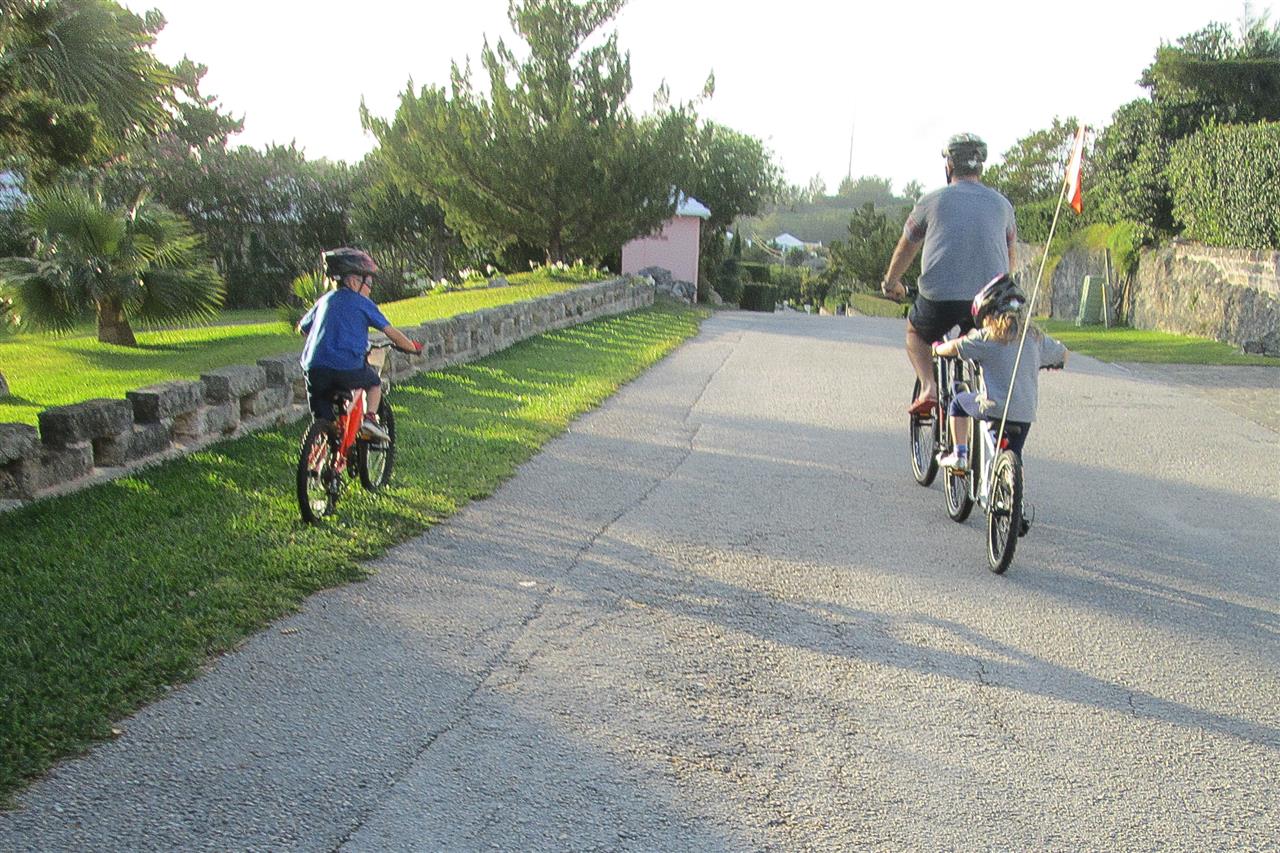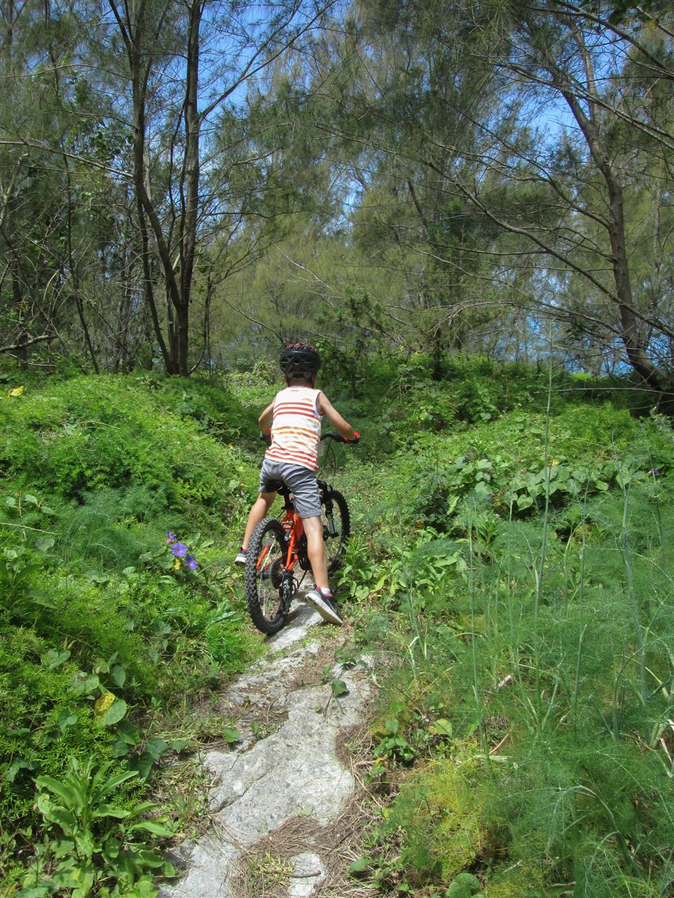 We started out just doing a few loops of our road in the evenings, Ryley really enjoyed the rides and was asking (whining?) for ‘another loop’. Our first bigger ride was out to Clearwater Beach just past the airport in St. David’s, where there are a fair amount of trails and paths suitable for Josh. Plus there is a huge parking lot for him to burn around in…!