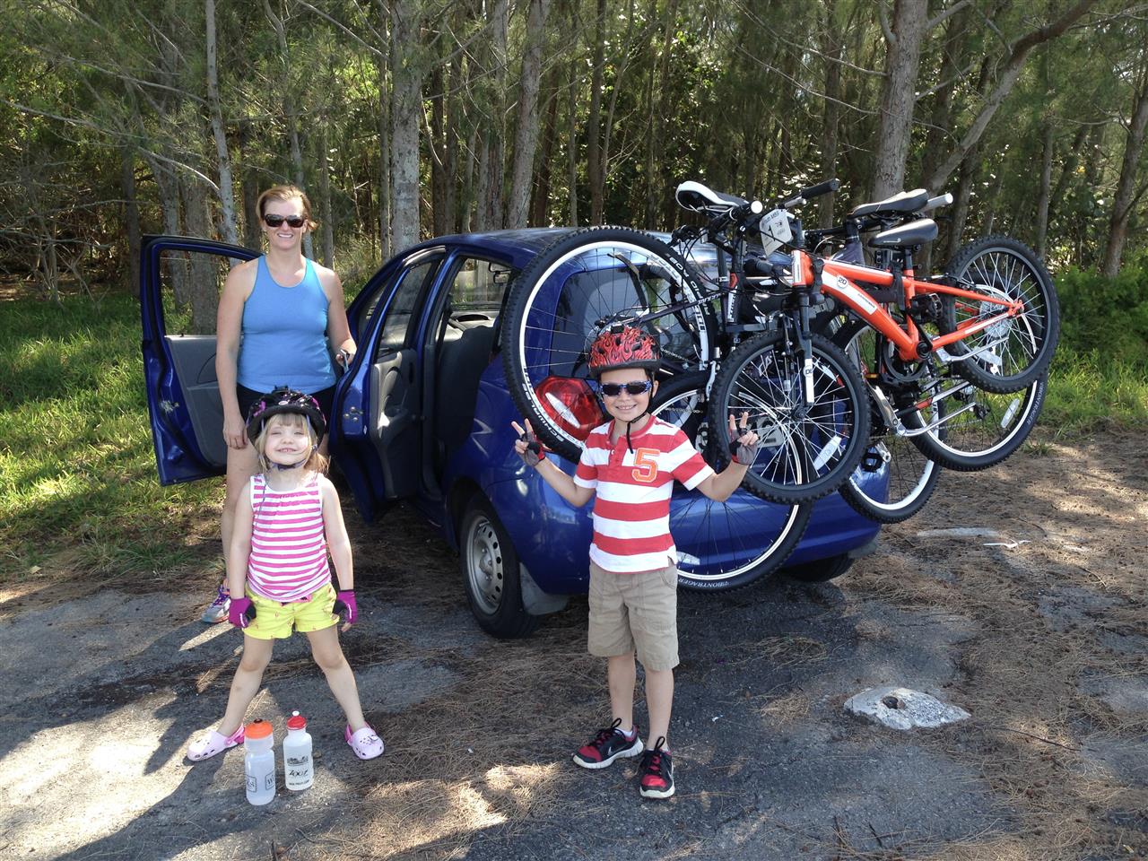We already had a bike rack on the back of our little car – now we are maxing it out. The three mountain bikes fit on the rack, we just have to squeeze the tag along between the kids in the backseat to get everything in for a bike-riding adventure!