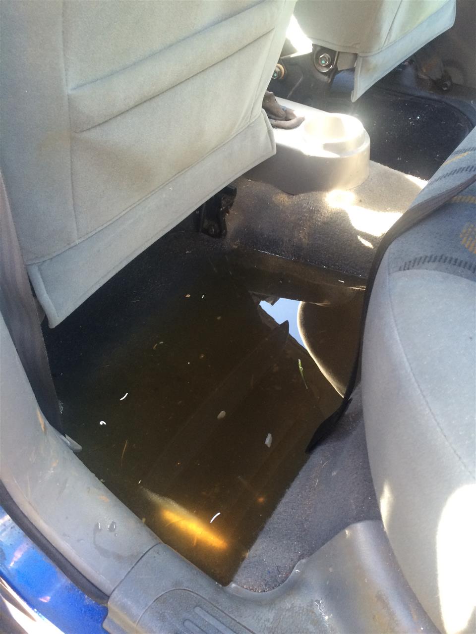 In terms of the damage to our place – this is it (above).  TS Faye did quite a number on the trees earlier (which was a point of concern as all these downed trees could be potential missiles in another storm such as Gonzalo!), so there really wasn’t much left to come down around our place.  One more small tree came down into our yard from the neighbors, but other than that our big tree in front didn’t lose any more branches, and cleanup for me entailed only picking up a few small branches from the yard and grabbing the few pieces of debris on the roof from the chimney.  We were very lucky – our neighbor to the south (you can see in the picture above as well) lost part of his roof, as did our neighbor right behind us to the east.  The only other thing was that our car apparently isn’t entirely hurricane-proof, as evidenced by this puddle in the foot well of the back seat!  Eww.  (Next time I’ll take a page out of this guy’s book.)