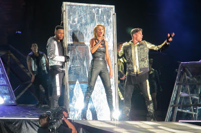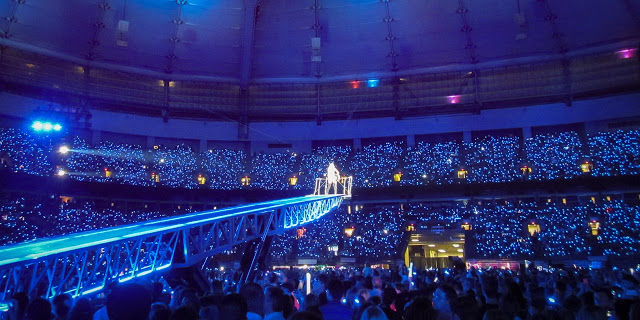 The stage setup was pretty cool – nothing too elaborate mechanically (at least it seemed that way at first…), she had a long catwalk that took her deep into the middle of her 45,000 fans packed into BC place. There were tons of lights on the main stage that produced some really interesting effects – like rain – which was oddly realistic feeling. The best lighting effect, though, was actually these LED wristbands that every single person found on their seat upon arrival – they had a bright blue, red, and white light inside and they were controlled by the lighting system, so during parts of the show there would make them all shine the same color (sometimes they were all red, sometimes all blue, etc.)… think modern day version of holding up a lighter except everyone has one! Very awesome.