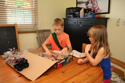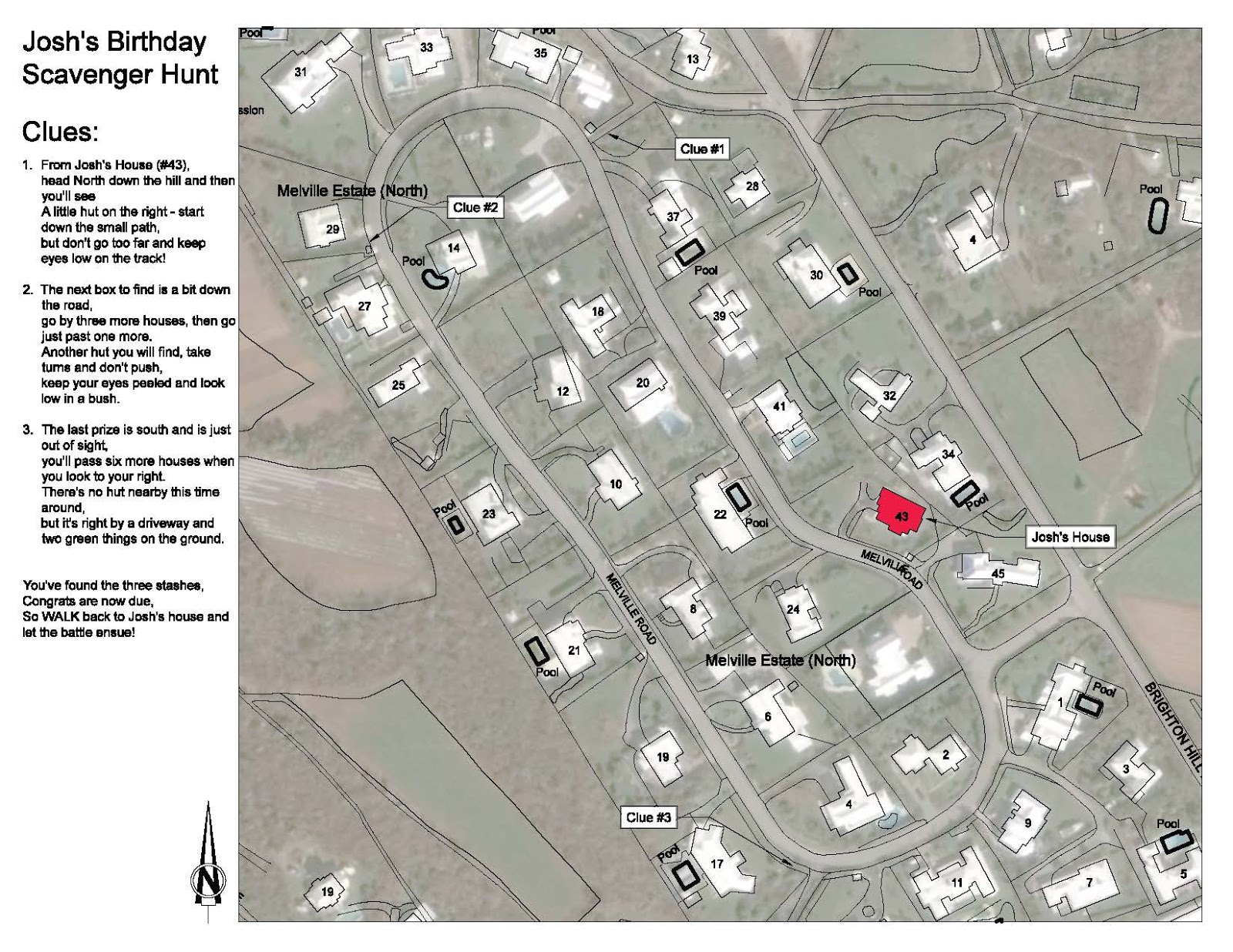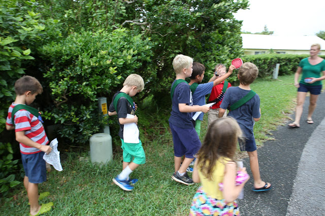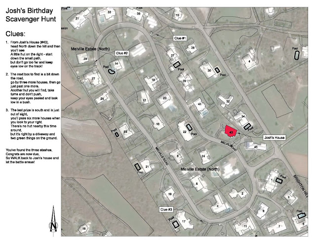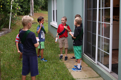We started them off with a little scavenger hunt around our quiet neighborhood – there were three packages of Nerf darts hidden around the area and they had to use a map to find them. They didn’t realize what the prizes were going to be, but once they found the first one they knew the rest.