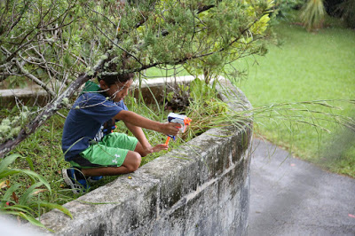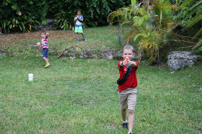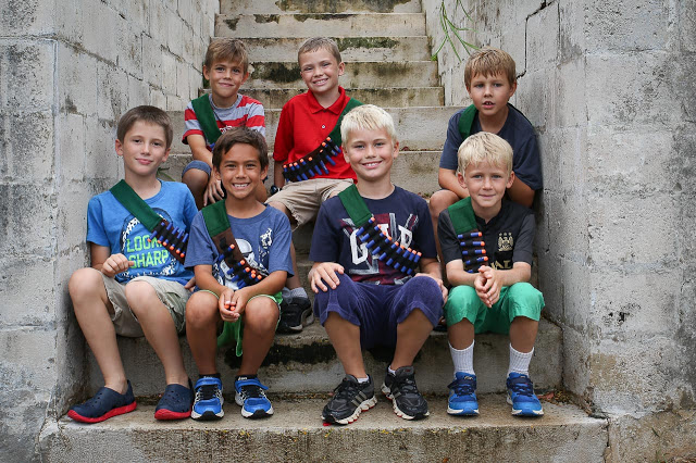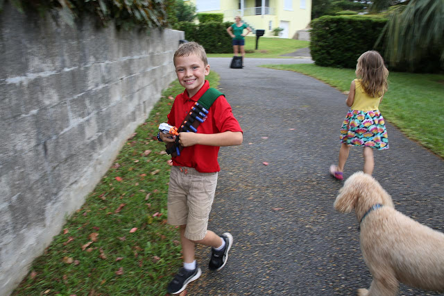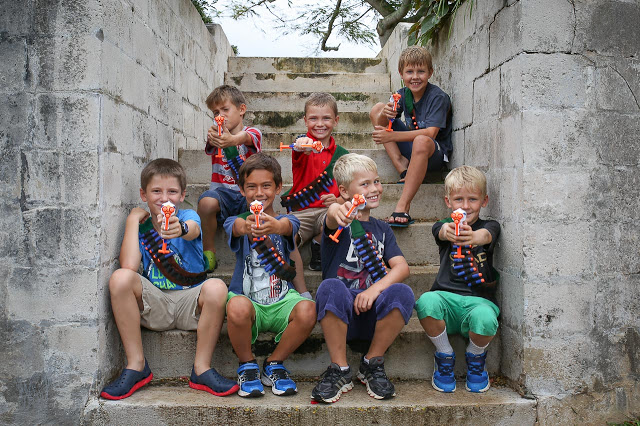Once we got back to the house, they all got little Nerf guns to use with the darts they had found and – after making them sit down for a minute for a photo – let them loose in the yard (not the entire neighborhood!) for a Nerf battle! They quickly organized teams and rules (like the many laser tag parties they had all attended recently) and off they went.