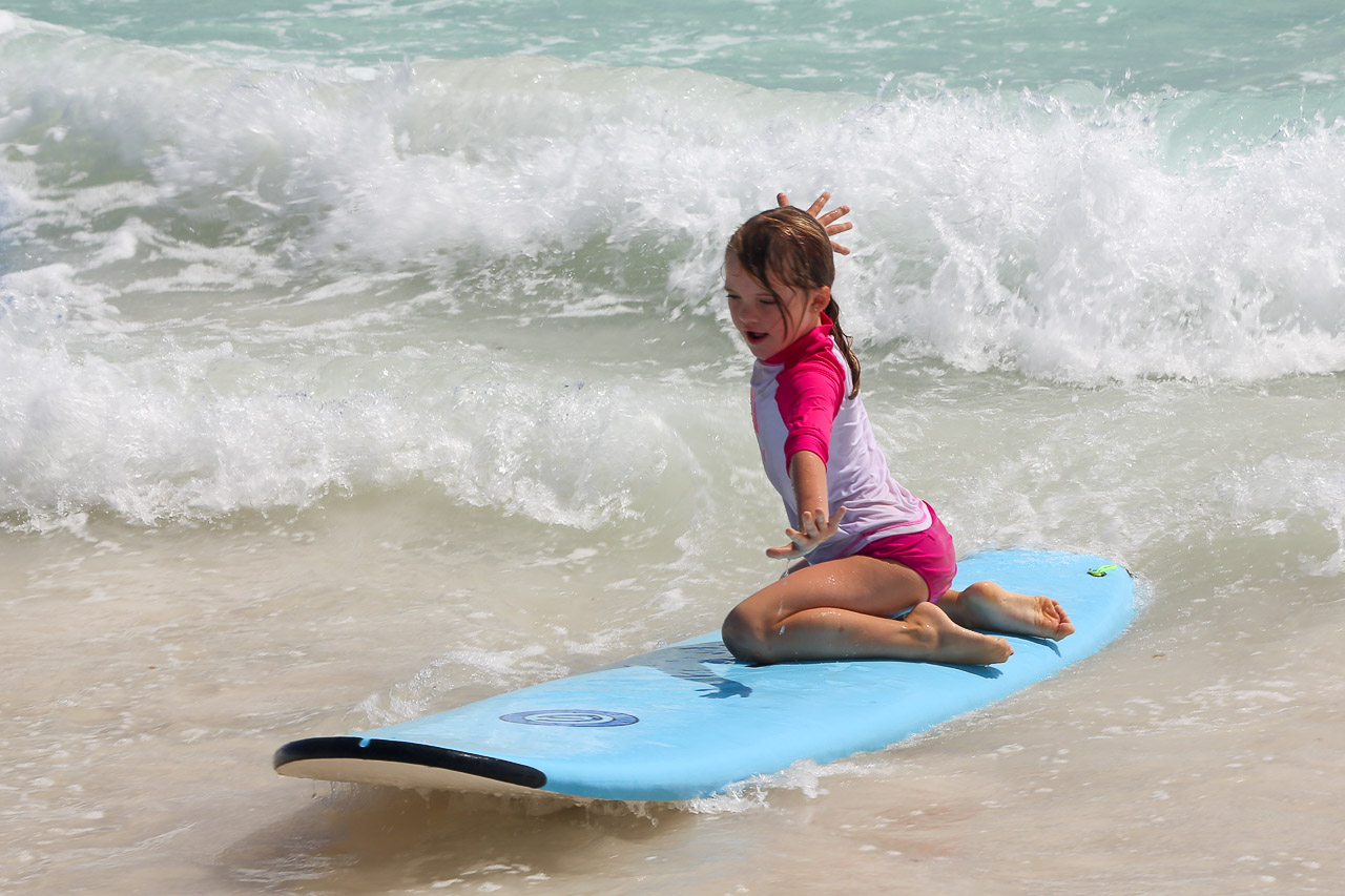 It was a pretty rough day on the water – maybe a little aggressive for our first time out – but we had fun and most of us were able to get up a few times! Josh was well prepared for his party the next weekend, and did great as the weather fully cooperated and gave us a nice calm sunny day with ideal surf conditions. He enjoyed it so much that he asked if we could come back on Sunday morning too, so the four of us did! Ryley hasn’t taken to it as much as Josh, but she was having fun on the beach and playing in the water (working up a little courage…) between her turns. She’ll get there, we have no doubt. She has the surfer girl outfits, after all.
