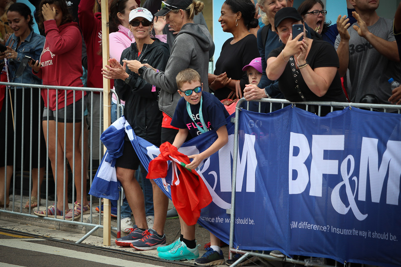 Anyway, the big day – Saturday – started with the age group race in the early morning. Jenn wasn’t participating this time around as she was busy being a TO! The men’s race started at 1pm, so the kids and I went down about 45 minutes before to secure our spot for the two elite races, the kids donned in their familiar “Go Flora Go” t-shirts and I in my newly-minted “Go Jo Go” shirt! The crowds were decent for the men’s race, but everyone was there for Flora of course, so before the women’s race at 4pm the number of spectators ballooned and the place was electric!