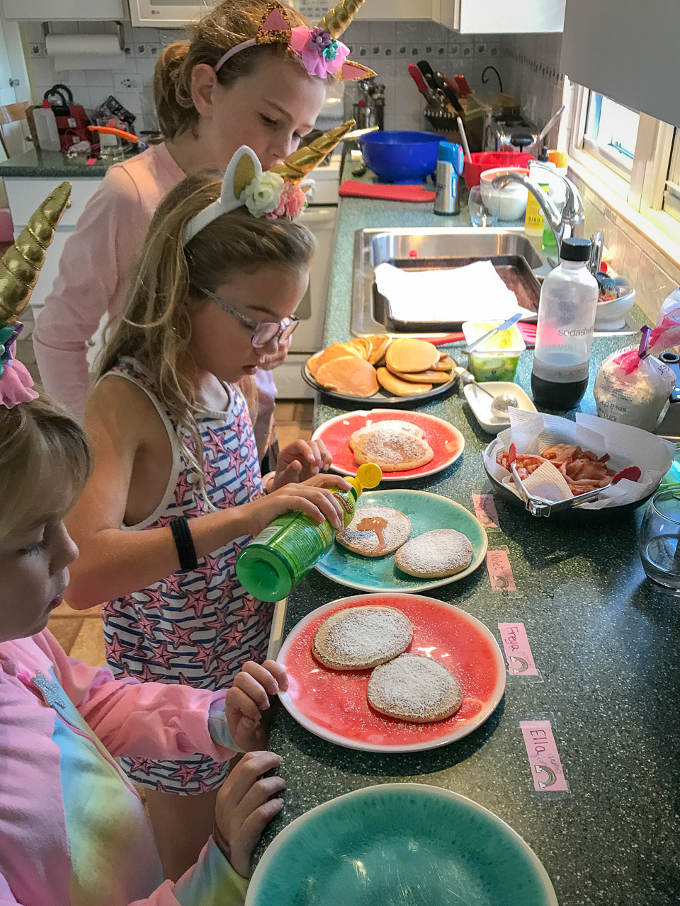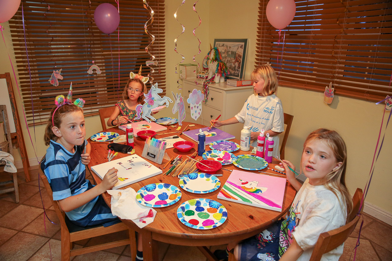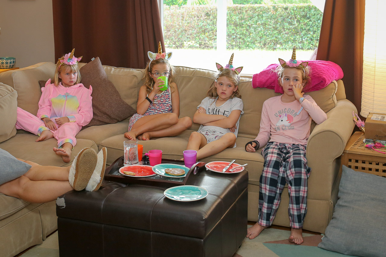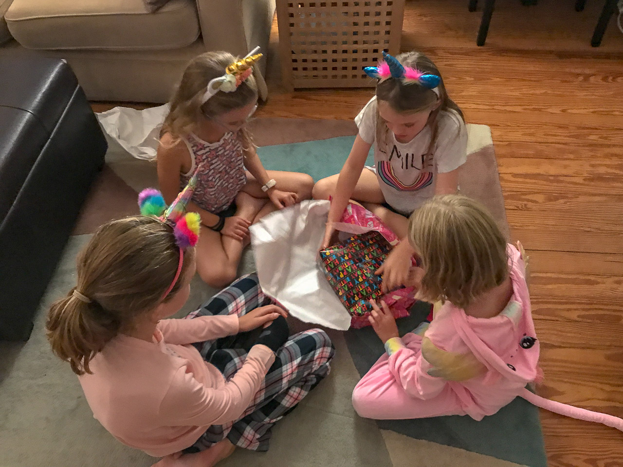 In unusual fashion, we managed to have Ryley’s party before her actual birthday, which I’m not sure if we’ve done since the kids stopped having their combination birthday parties (fact-check, please). Unicorn headbands, unicorn cake, unicorn crafts, unicorn piñata, and even a unicorn dog (Cooper also had a headband)… everything was very uni-corny. Or rather, unicorn-a-rific! 😉 Ryley opted for a sleepover with three friends this year (yes, she does sleepovers now!). After some activities and some fancy Rustico pizza, they dug into the unicorn cake, then (post-sugar high) chilled out with a movie. Ryley liked how Josh has his sleepovers in the living room so she did the same with her friends, making use of the whole couch and a mattress on the floor. The chatty girls didn’t say up too late… 😉 Pancake breakfast in the morning with some candy afterwards (they wisely waited until after eating to destroy the unicorn piñata), and that was a wrap! Good party, let’s do it again next year!