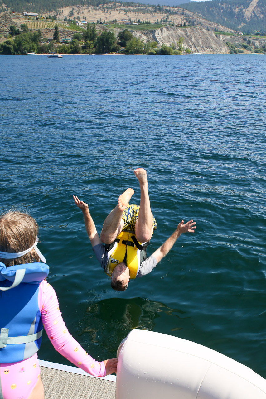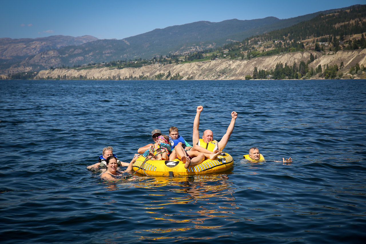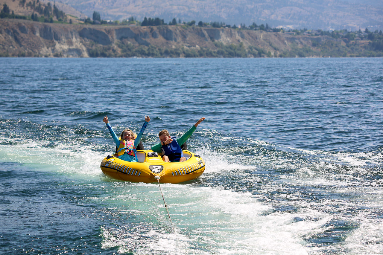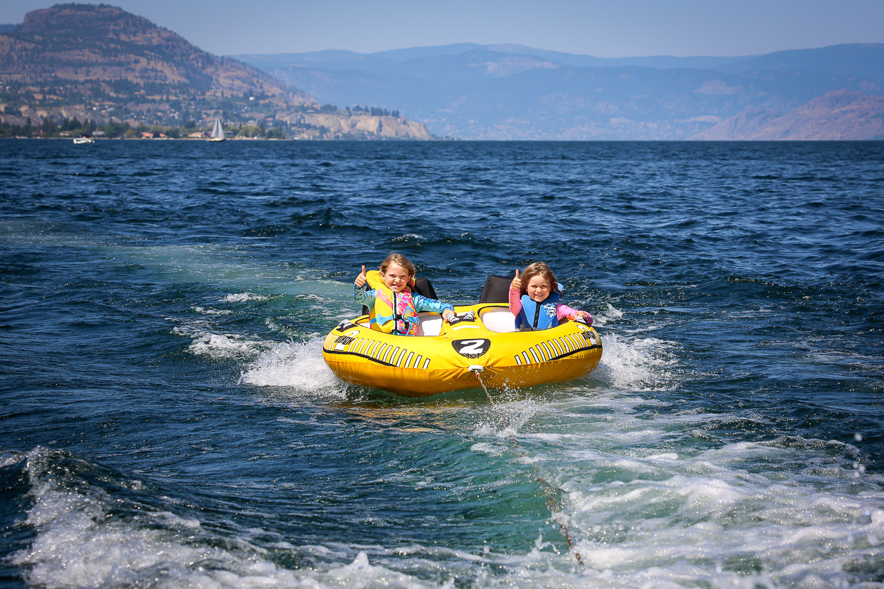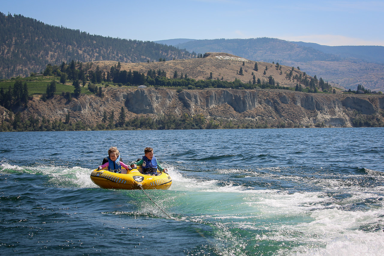 Anyway, we also went on a few adventures. Our friend Amber’s daughter babysat the kids for a day and we went with her and the rest of the ‘of age’ family members on a wonderful wine tour of the nearby Naramata area… amazing day, hit about 5-6 wineries and came back to the house with a few bottles! A day trip to Big White was also in the cards, though we didn’t get to go mountain biking due to some power issues (lifts weren’t working) – we made the best of it and did a little geo-caching instead! We also rented a boat for a change of pace another day; the kids always have a blast riding on the tube as we try to buck them off (need a more powerful boat as the kids get bigger)!