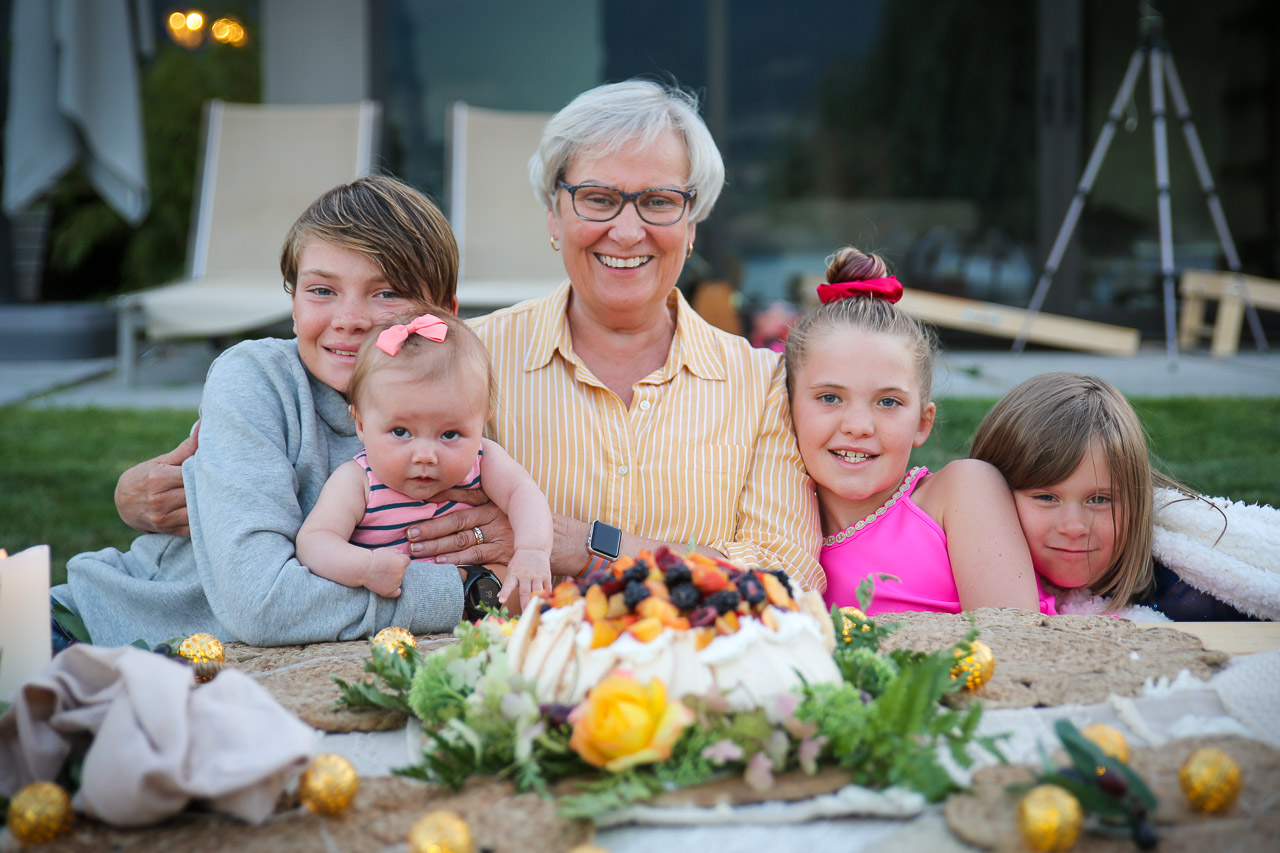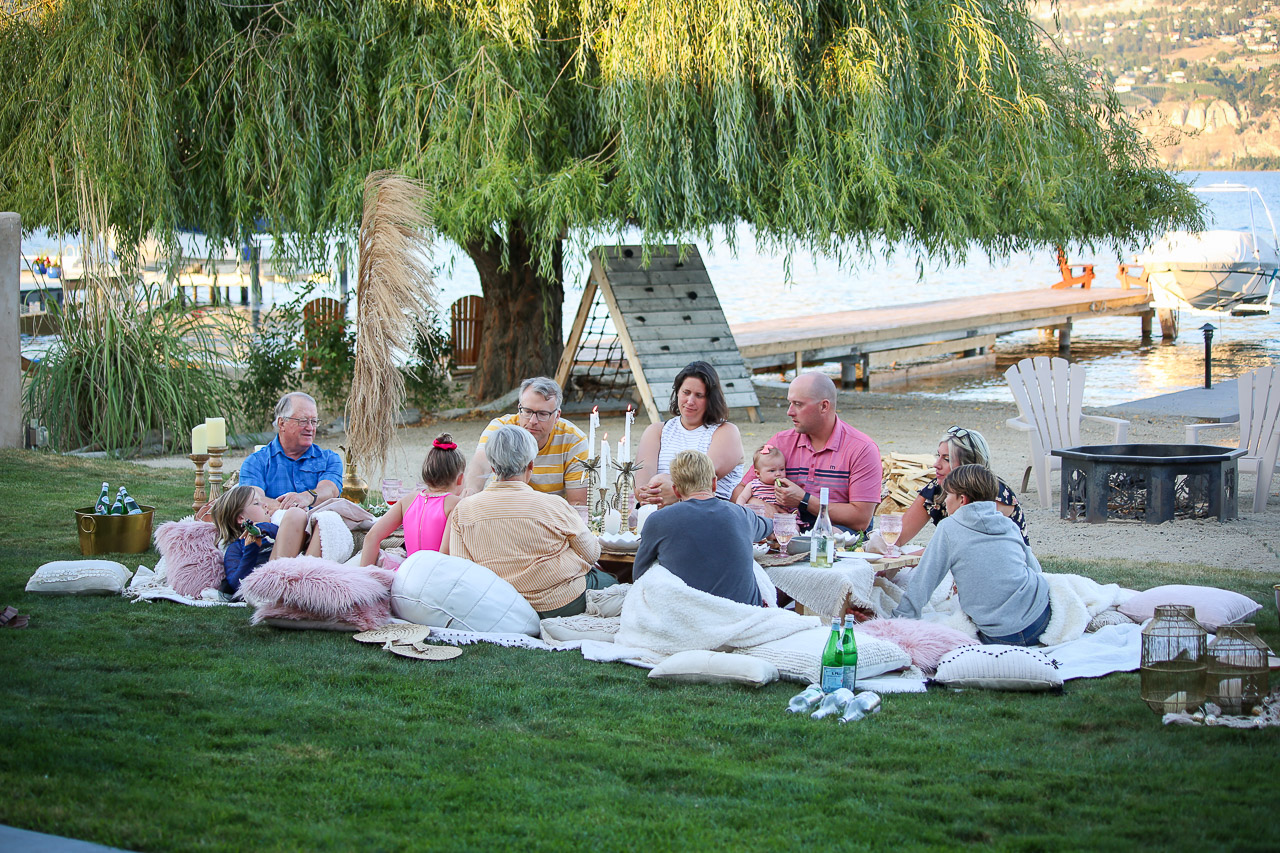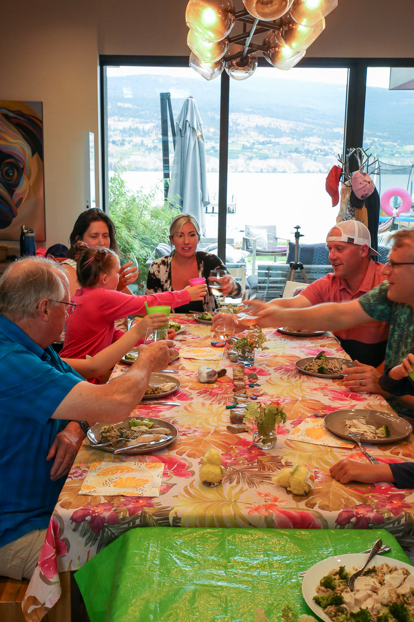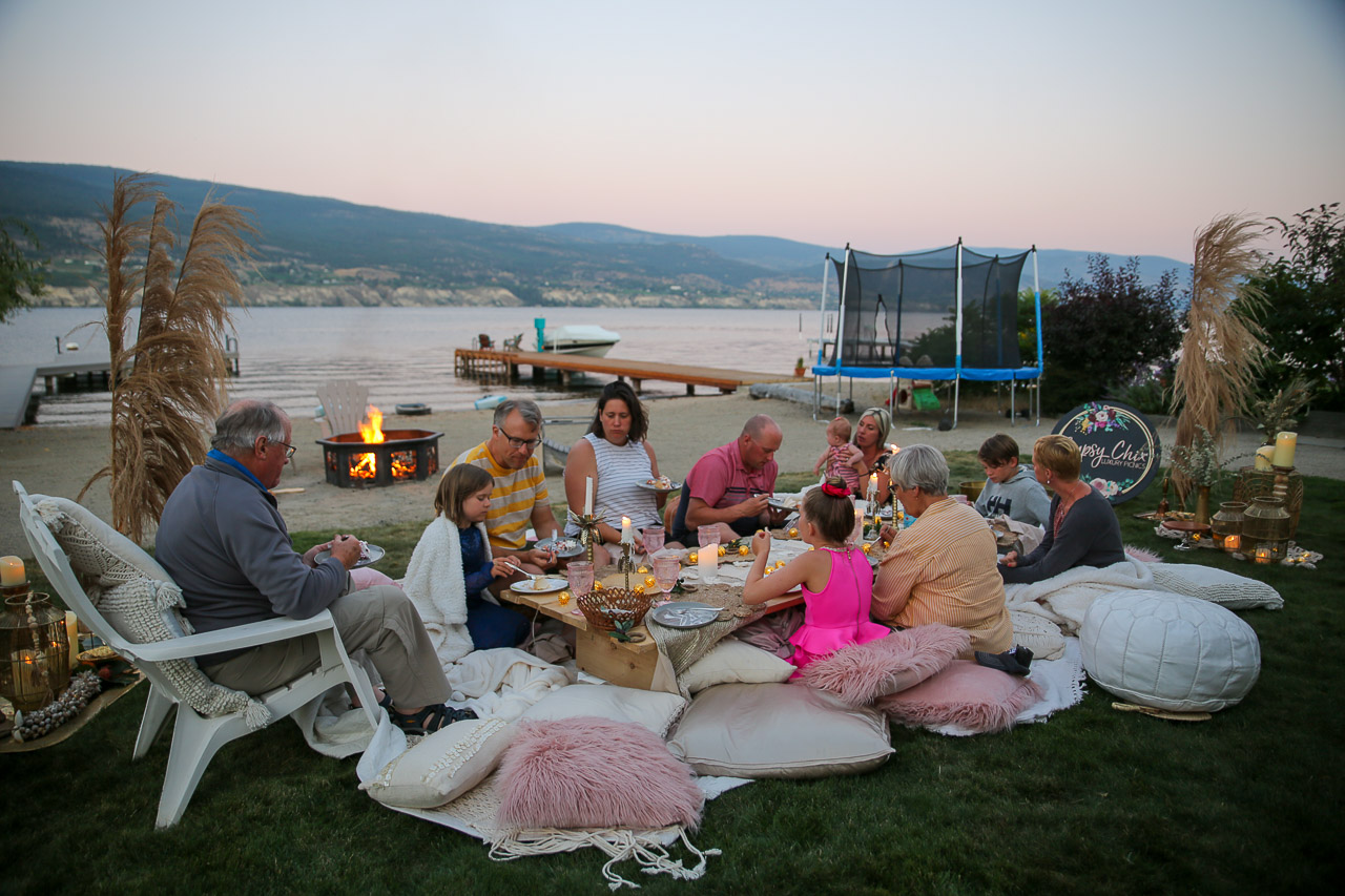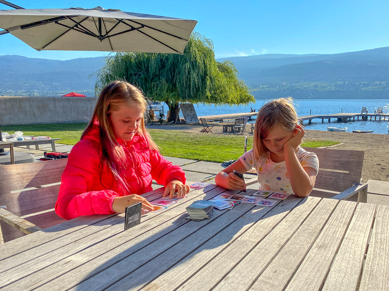 Once situated in Summerland it was time to just decompress after a long last several months of COVID-induced stress! The house was actually the same one we rented last year, a rather large and gorgeous contemporary place right on the lake. We didn’t stray too far from the house this year of course, but still found our way to a few wineries and fruit stands for some local home-grown goodness! These coupled with our usual home-cooked meals and perhaps a few cocktails were the perfect vacation recipe. The most elaborate meal we ate was actually part of the surprise 70th birthday celebration for Jenn’s mom Helen: the kids arranged for a super-fancy picnic at the house, complete with a million pillows around a low table in the yard overlooking the beach, fancy stemware and of course a meal of charcuterie boards – all set up and provided by a company called Gypsy Chix Luxury Picnics (set up was done while Jenn and Wendy were ‘distracting’ Helen at a nearby winery…!). Wendy whipped up an amazing pavlova for dessert, too, which we enjoyed before retiring to the beach fire pit and a few cocktails before bed. Not a bad birthday party I’d say! This wasn’t even the first birthday party we had this holiday – we had a little celebration for Ruby’s 7th birthday a few days earlier, complete with a wicked dragon cake (another Wendy creation) and some karaoke! These guys know how to party. 😉