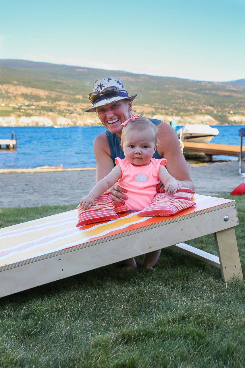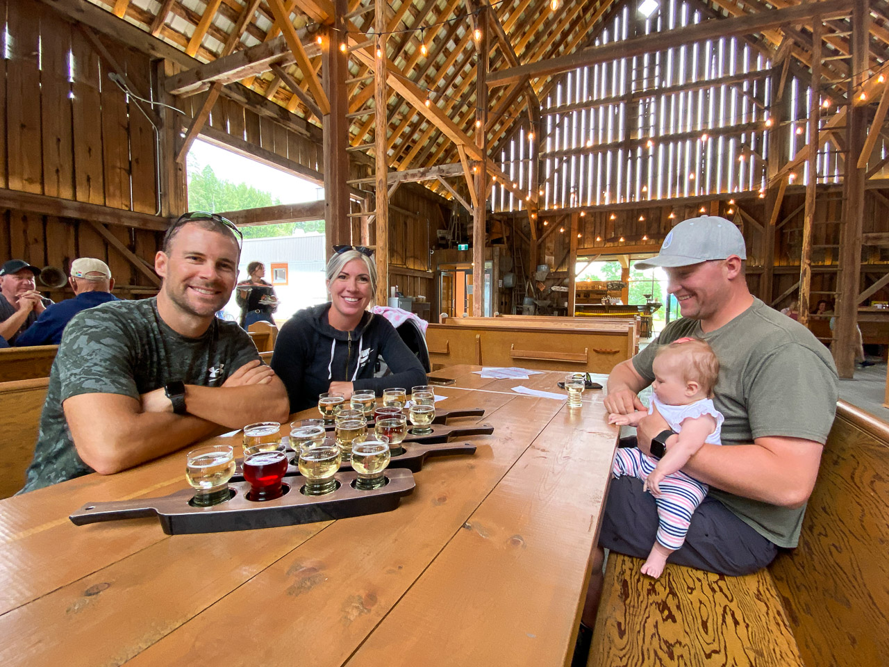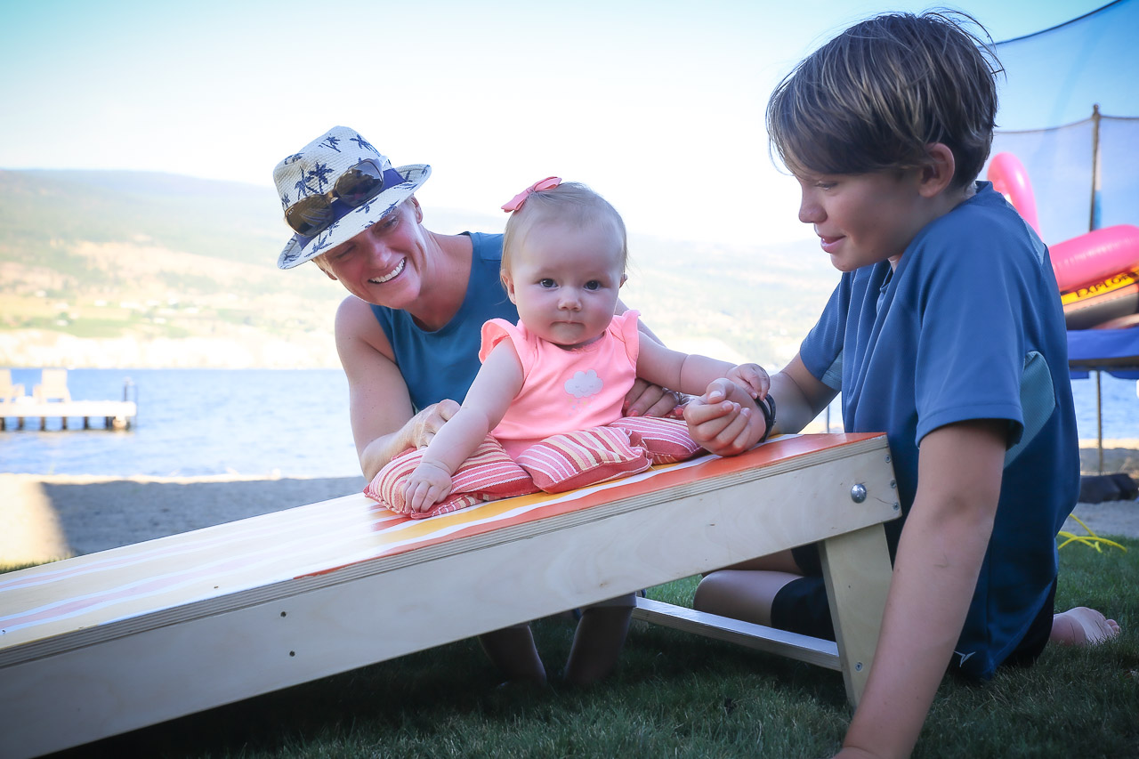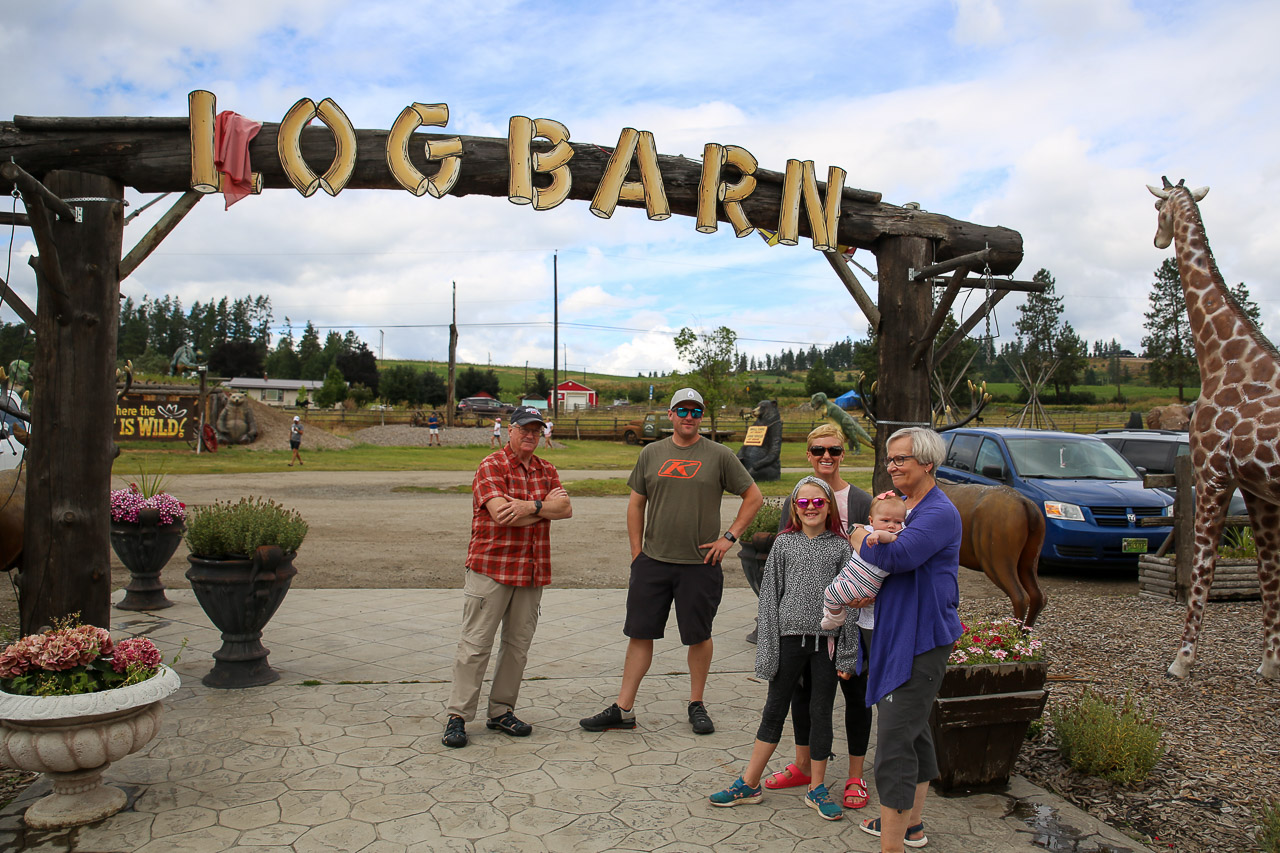 We had a nice surprise our last night in Vernon, as Jenn’s brother and gf Sarah plus new baby Denver stopped in for the night! Jenn’s family were all due to meet up in Summerland the following afternoon so we were happy to see them earlier than expected. It was late when they arrived so Denver was already asleep; the next morning you might have thought it was Christmas with all the excitement! After introductions it was time for breakfast and one last dip in the pool before packing up and heading to Summerland. We had time to kill between leaving the house by 10am and arriving at the Summerland house by 3pm, so on the way down we met up with Jenn’s folks at the Log Barn in Armstrong for a little entertainment then lunch at Farmstrong Cider, before trying out Westside Road instead of the usual highway through Kelowna (a good decision I think, never went that way before) to get down to our final destination.