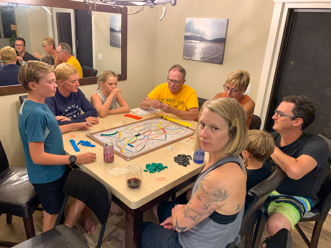 Of course, no family gathering at Nana’s place is complete without a snacky game night or two! The favorite game was Ticket to Ride; coupled with Kent’s famous margaritas it made for a long evening or two (for me at least… 😉 ). Our few days went by too quickly here as well – we squeezed in a quick game of frisbee golf before having lunch at Cass’ place, our final meal at that house as they are shortly moving to another place in Canmore! Soon after we were back on the road to Calgary to fly to Vancouver, our final vacation destination! We were happy to be able to tick a few more boxes, namely seeing Nana & Papa in their new digs and catching up with my sister and her family at their place. Now we’ll have to go back again to see their next house!
