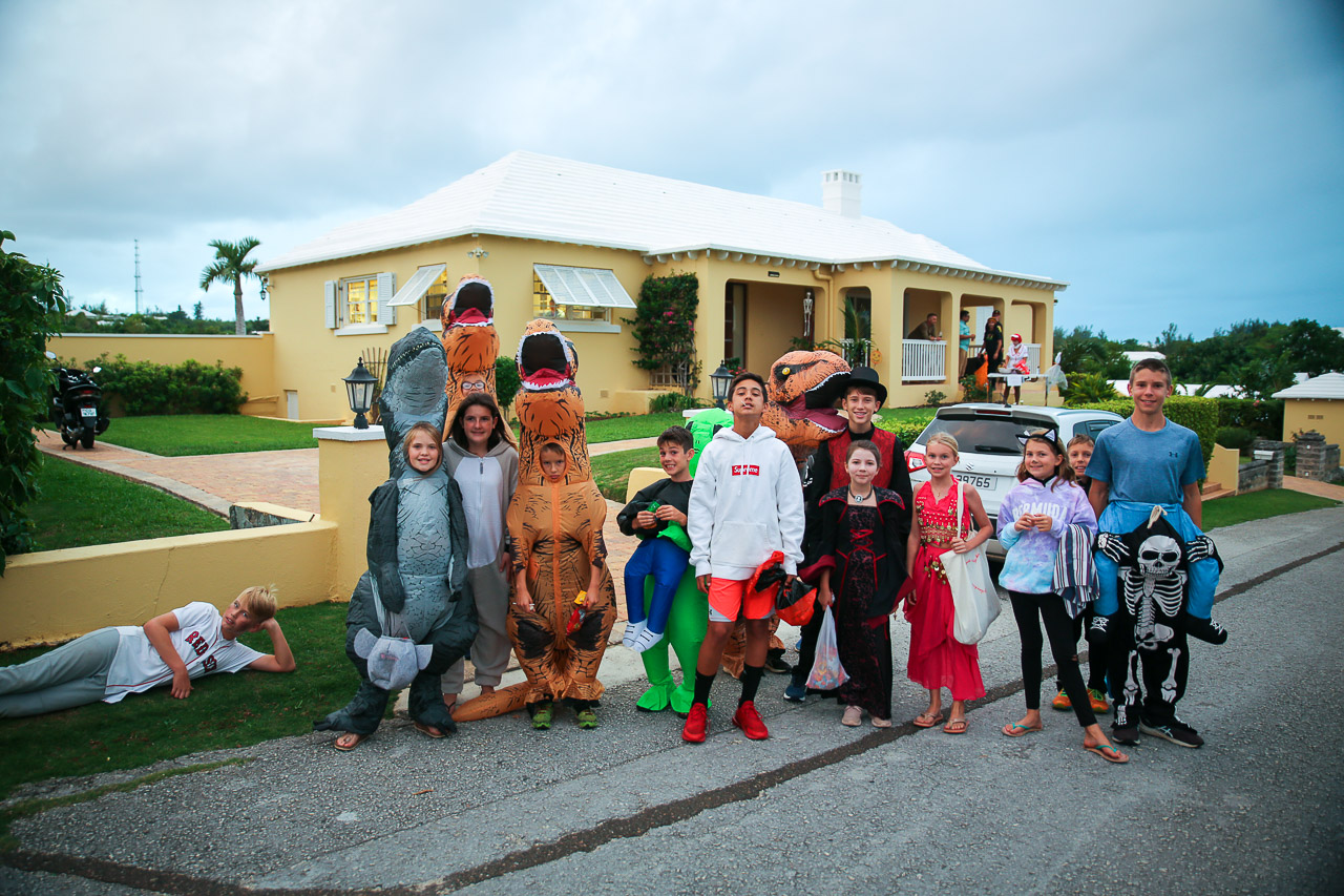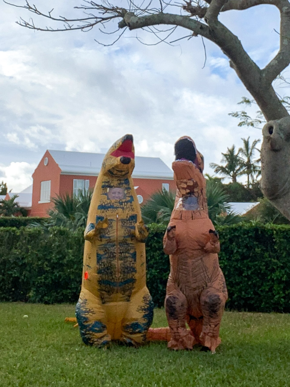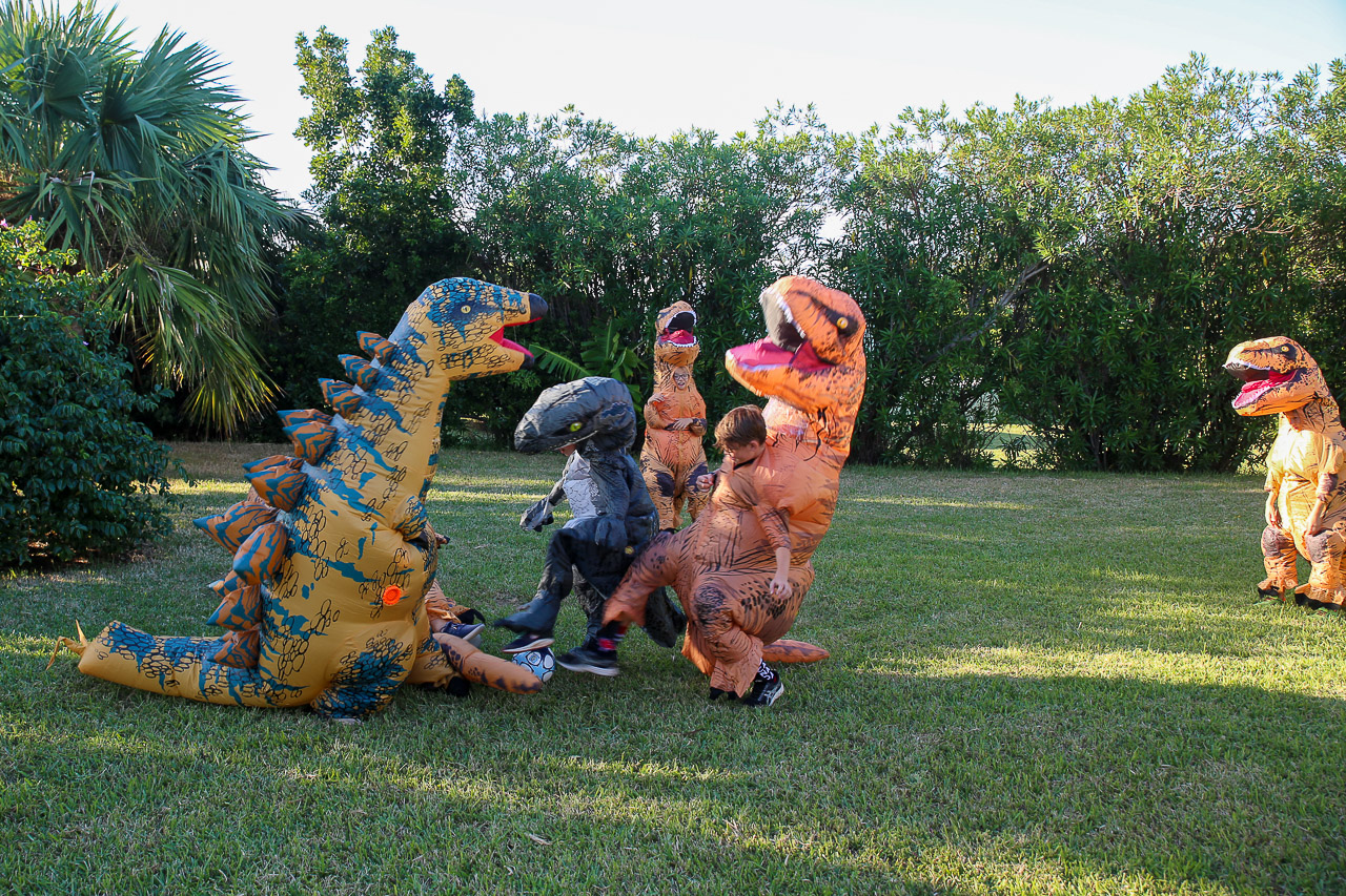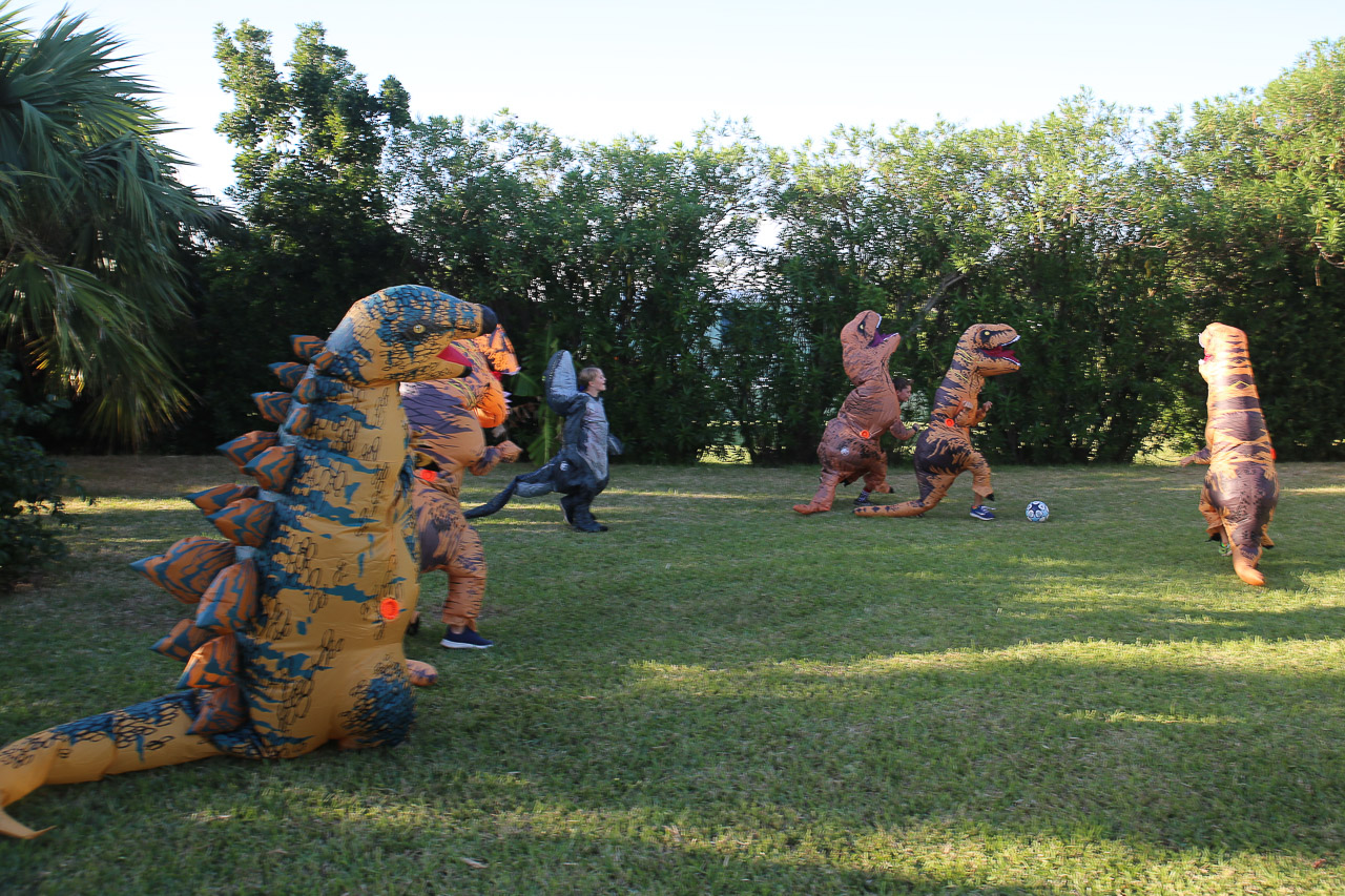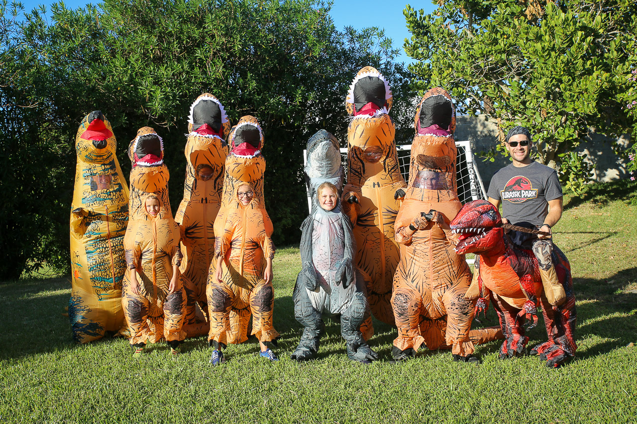 Our costume theme this year was a dinosaur family (well, three dinos – I was a dino-rider in order to keep hands and face free for beer!), there were lots of good costumes as per usual on our party guests. Some friends of ours came as a dino family as well, so we invited them back the following day to take a few photos and have a mini-game of dino soccer for hilarity’s sake!