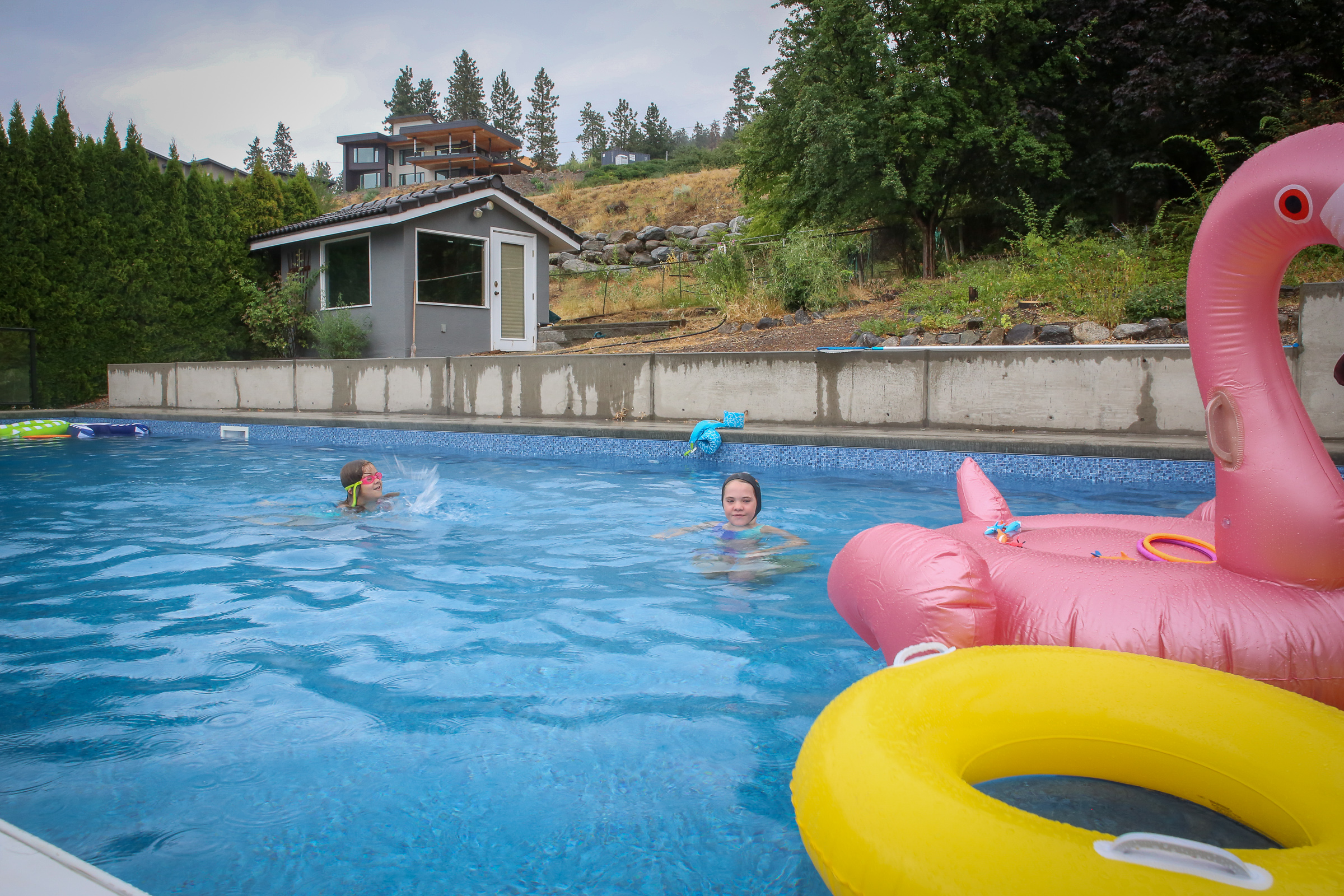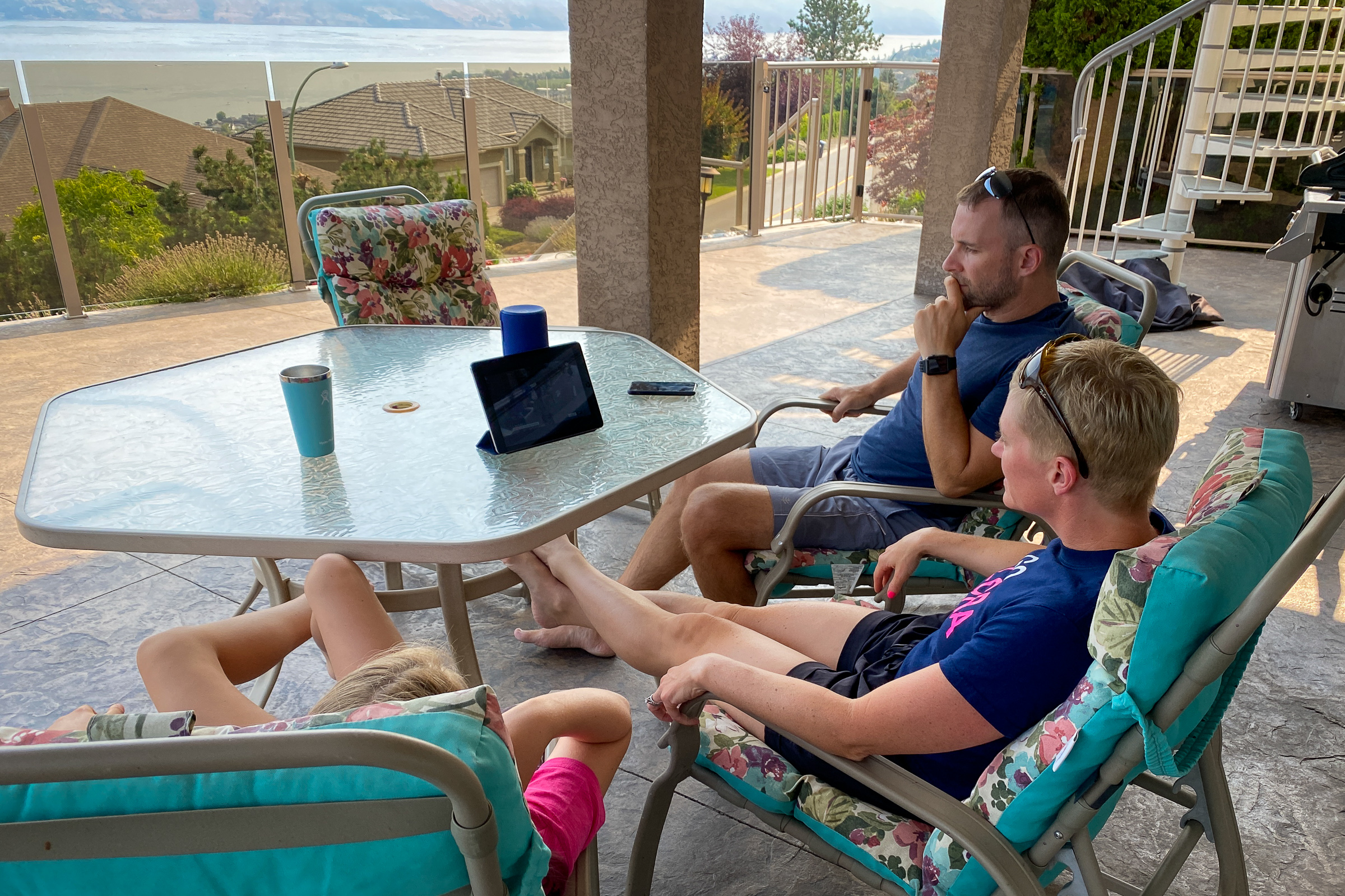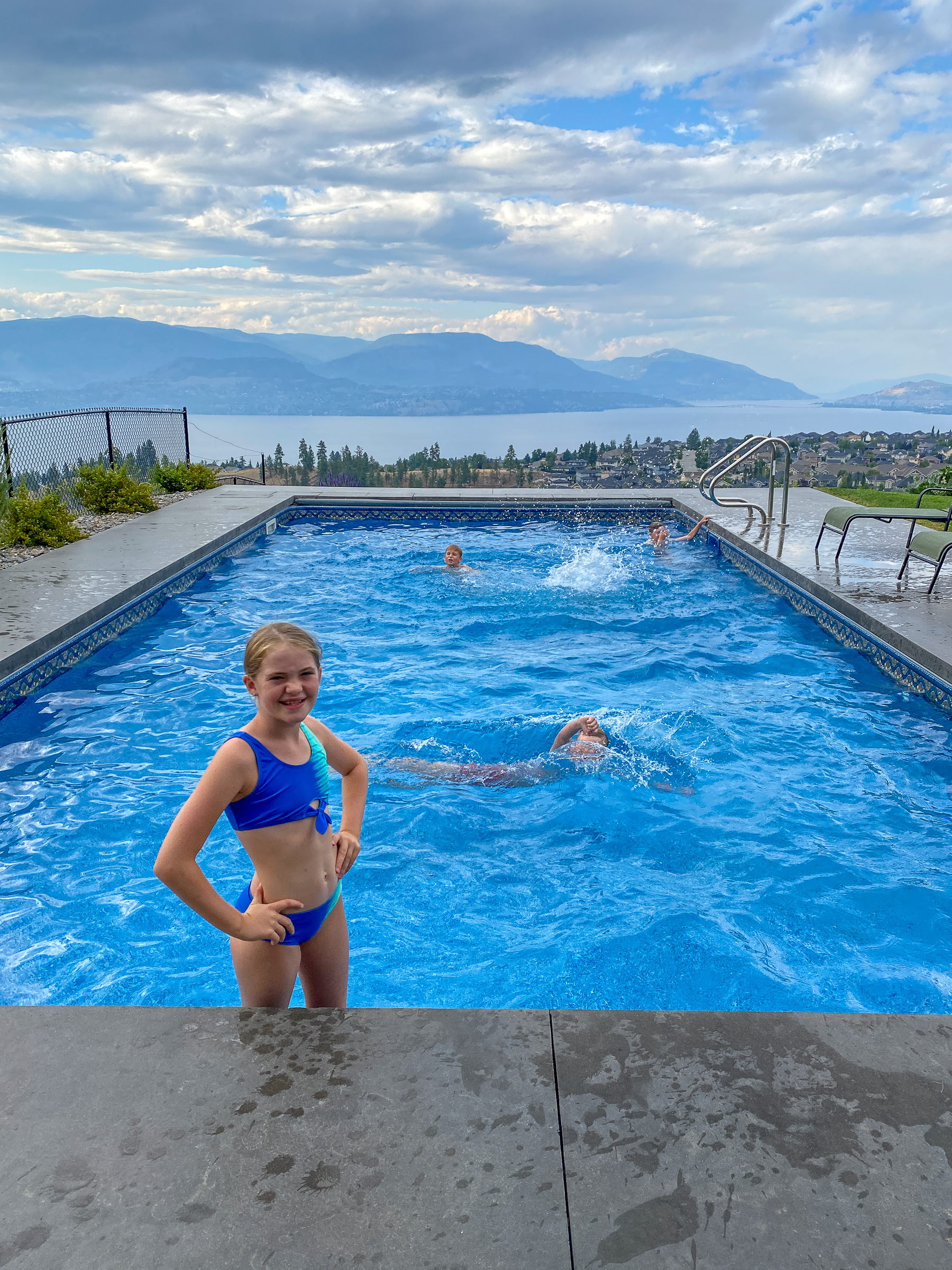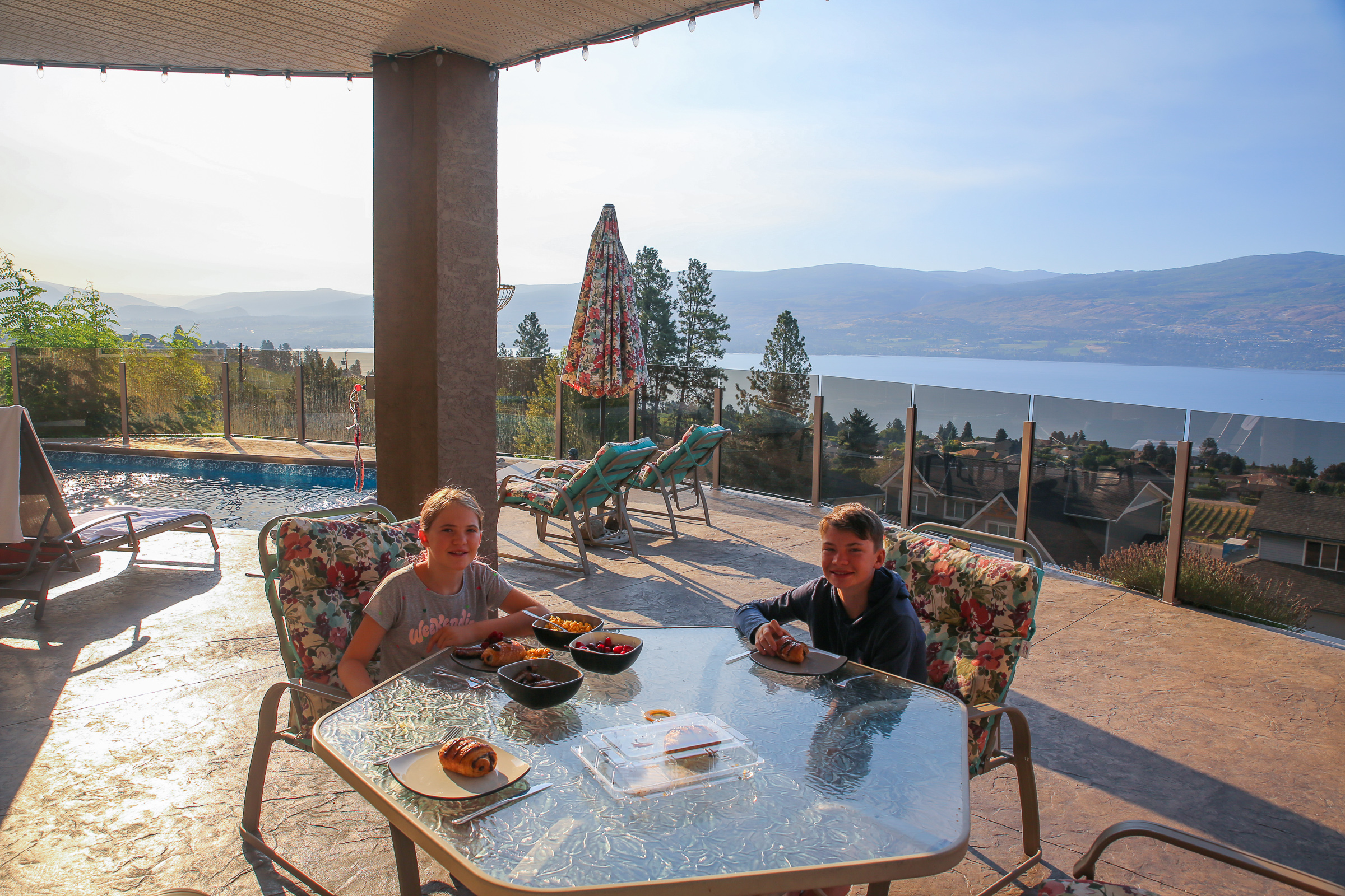 Now into August, Jenn and I continued to work on Monday, and were happy to enjoy an ever-improving view from our ‘office’ as the week went along. It was still pretty smoky when we arrived, but even on the first day we saw some lifting of the smoke as we could catch fleeting glimpses of the lake right in front of us. The next day we could see across the lake to the other shoreline, and by Wednesday afternoon the smoke was all but gone, leaving a glorious view of the Lake in front of us. Beyond our excitement at the smoke clearing, there wasn’t too much else happening during the week; work aside, it was very relaxed – our massive pool got a lot of use, the kids enjoyed the nearby pump track, and we continued our nightly routine of Olympics-watching.