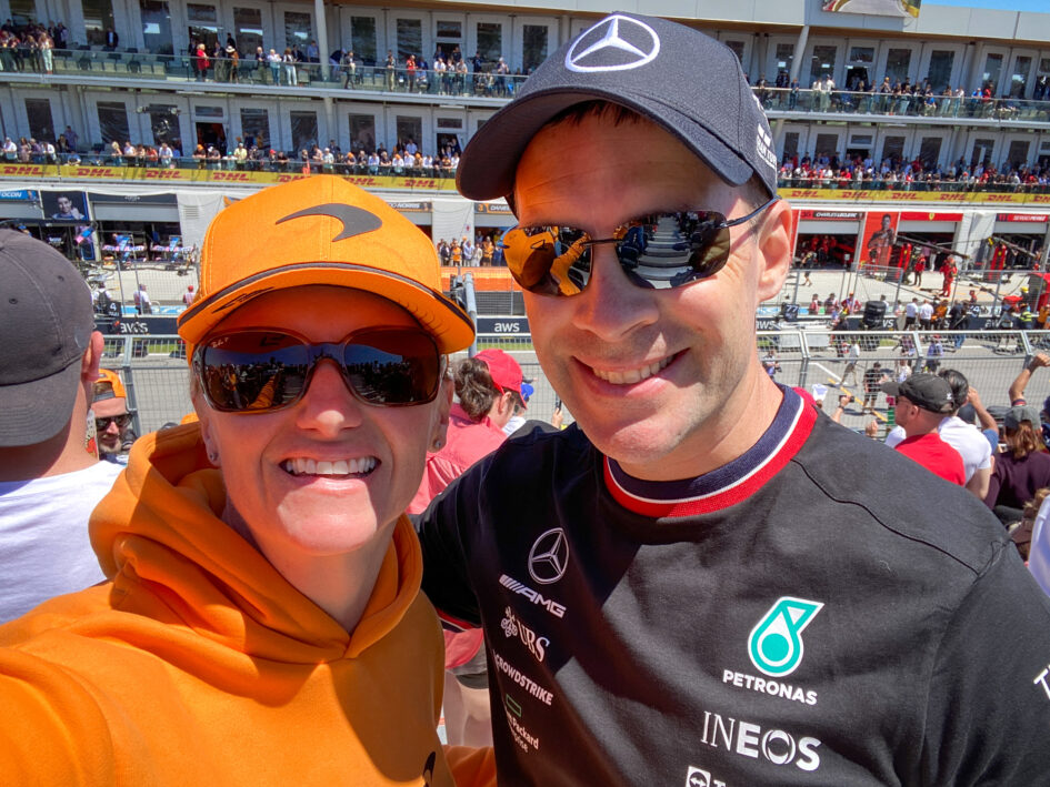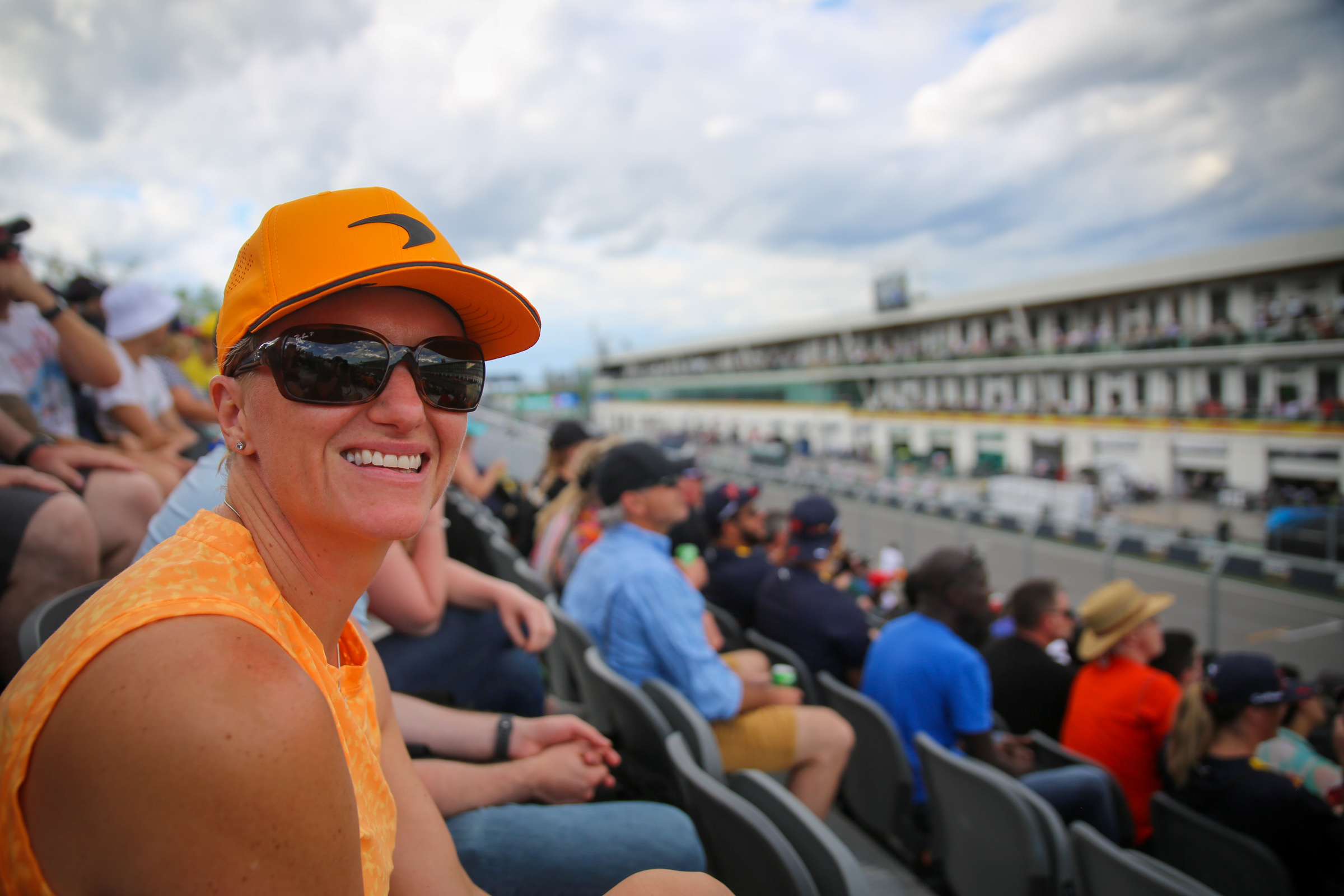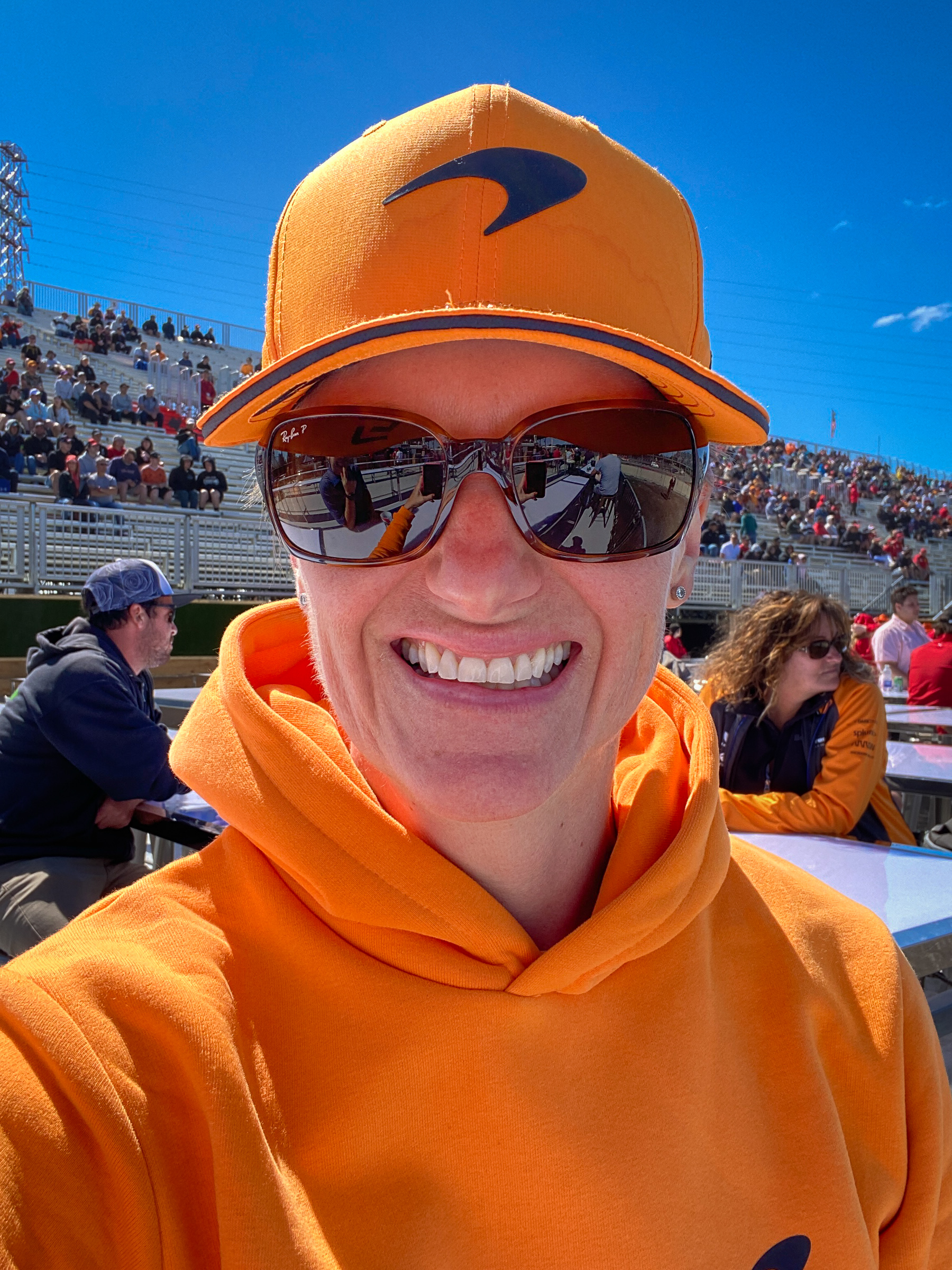 It was convenient that our seats ended up being directly across from the garage of McLaren’s Lando Norris, as he happens to be Jenn’s fave. She became more and more decked out in the team’s papaya orange (she even had her nails pre-painted – color matched to an online team photo), as the weekend progressed. I was supporting Mercedes, so by race day I was sporting a new black Merc hat and tee.