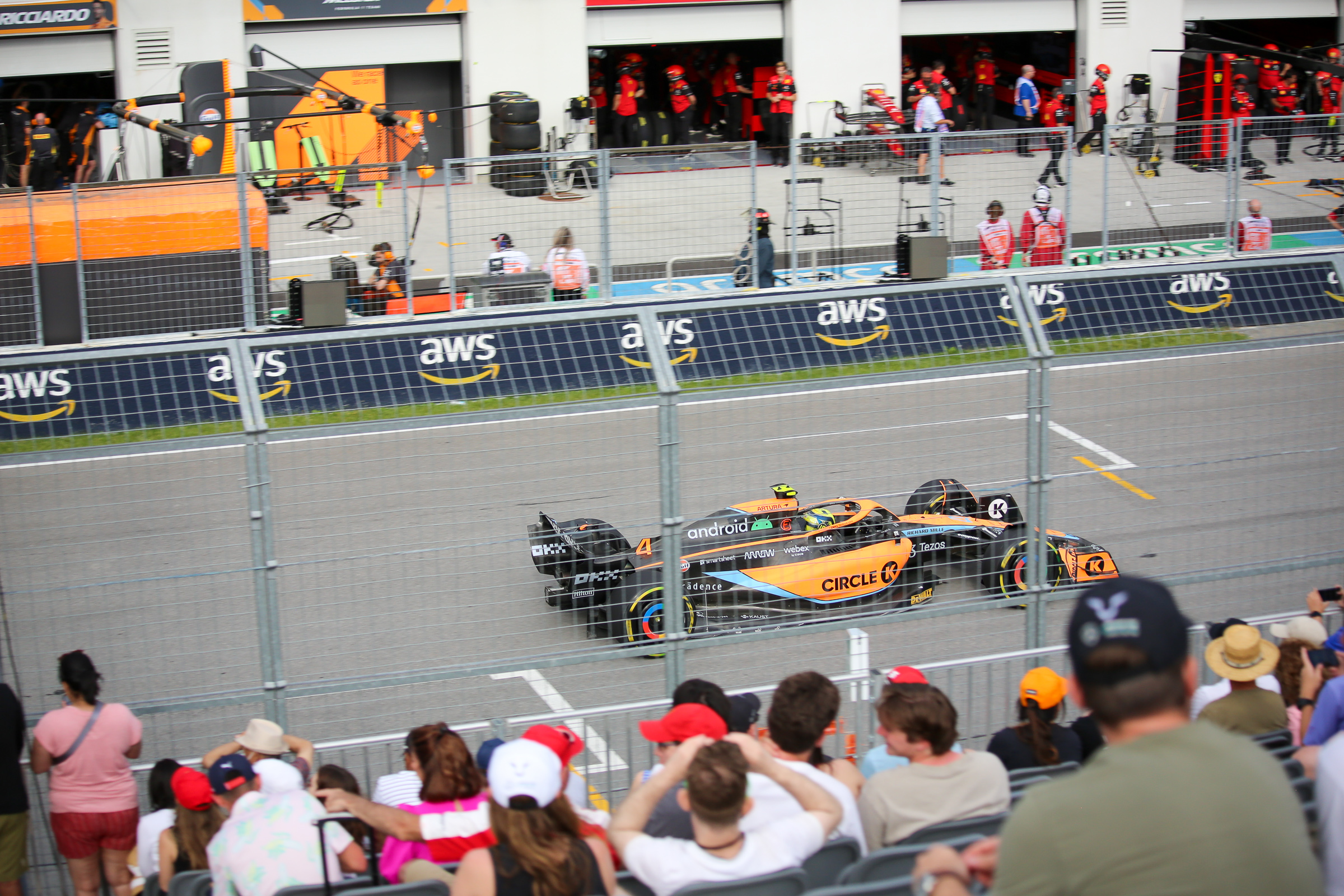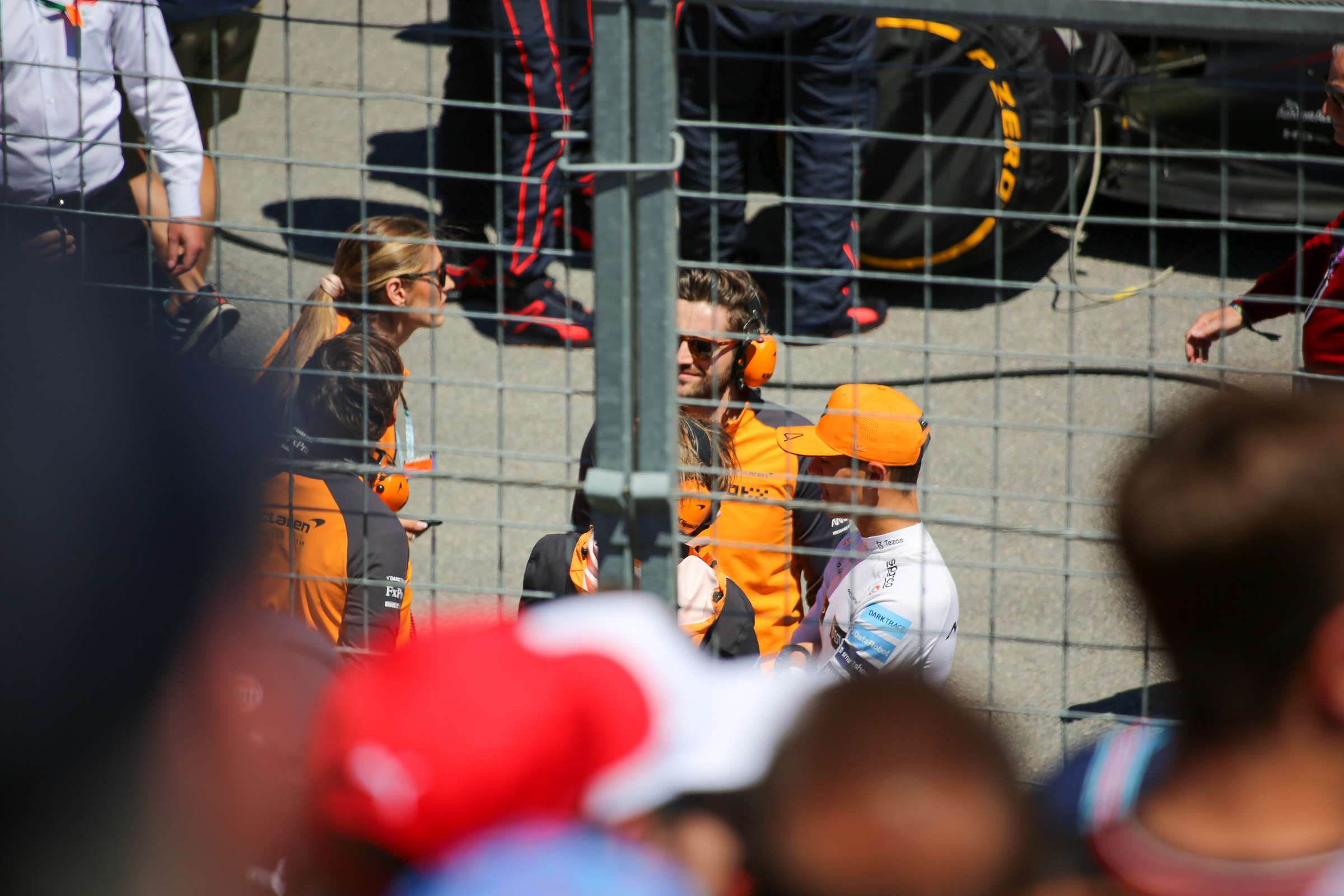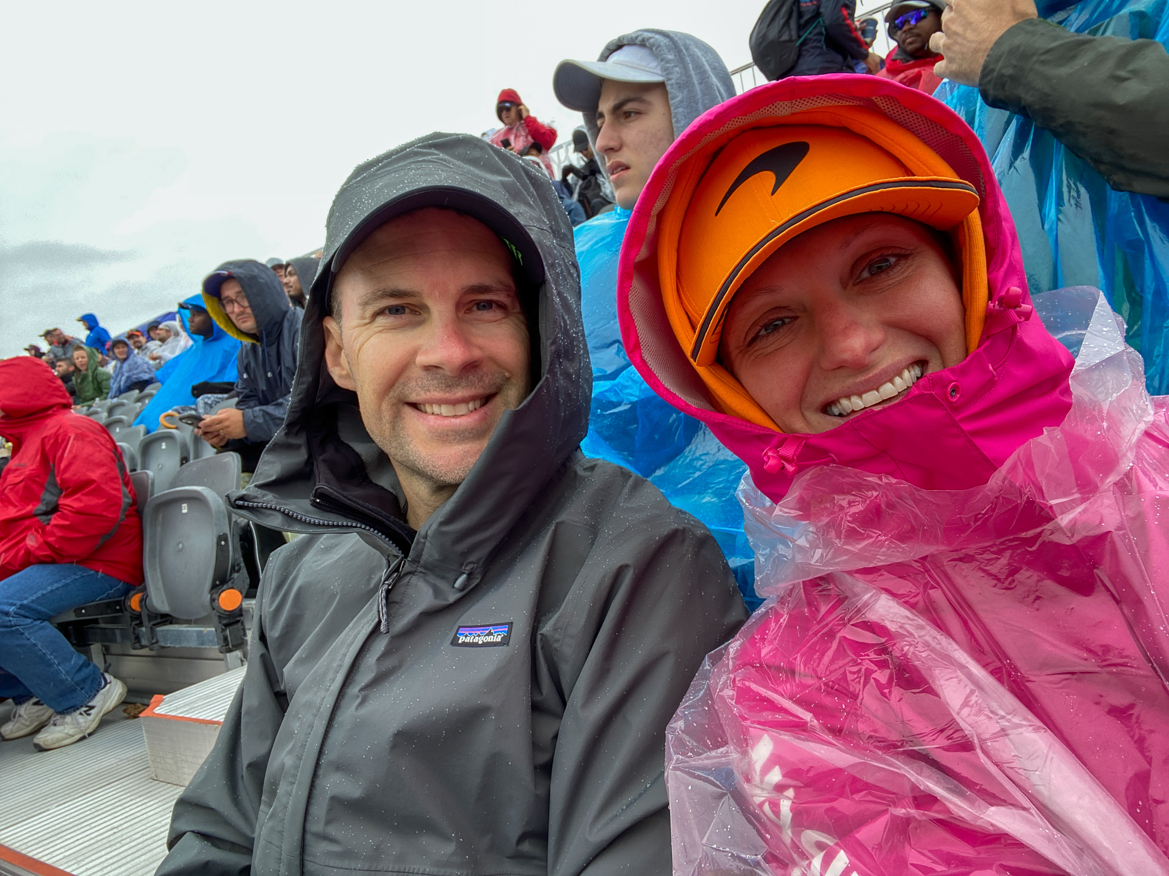 Jenn had bought a big warm McLaren hoodie on Saturday as the weather was cold (like 11°C and wet), a stark contrast to the day before when we got a bit of sunburn! We knew it would be rainy so after Friday’s sessions we hit some stores near our hotel where I bought a new rain jacket, Jenn bought about three pairs of thick socks (for her feet and hands!), a buff for her neck, and we both grabbed some cheap rain ponchos to stay dry. With her hoodie under a rain jacket and poncho, Jenn kept nice and warm (ish)! Luckily on race day she didn’t need it as we were back to warm and sunny weather, but she wore it anyway with her matching hat in full support of Lando.