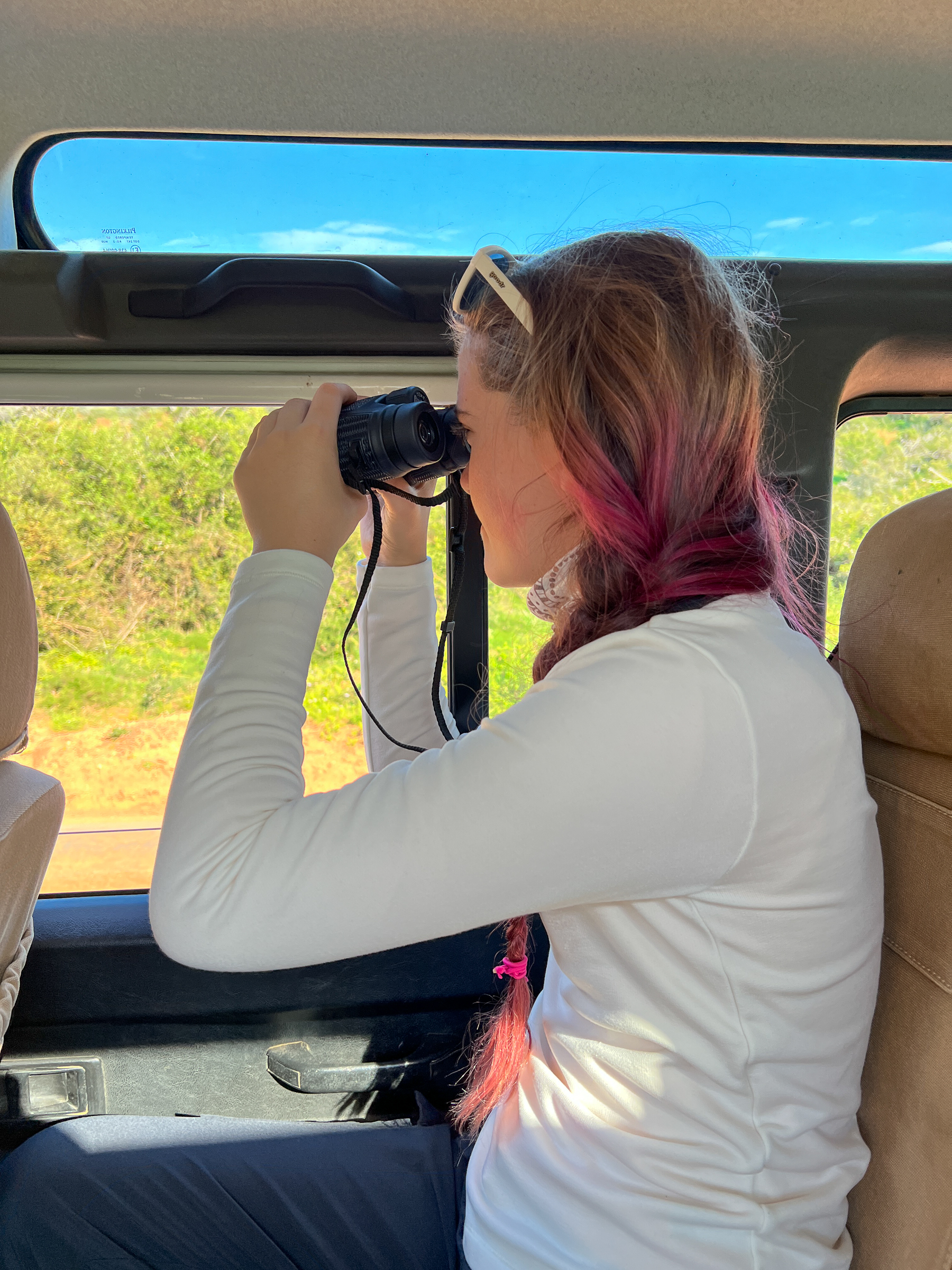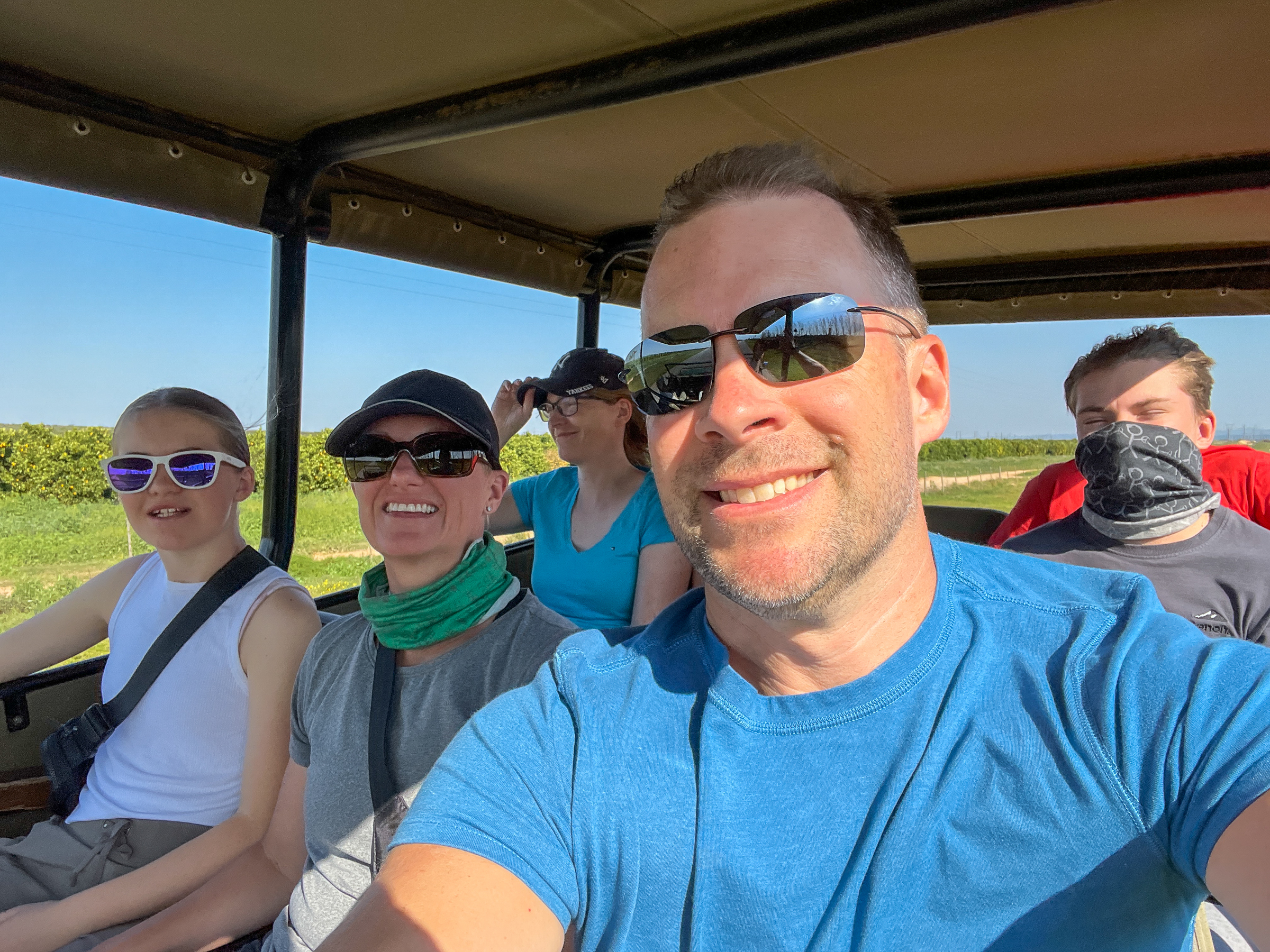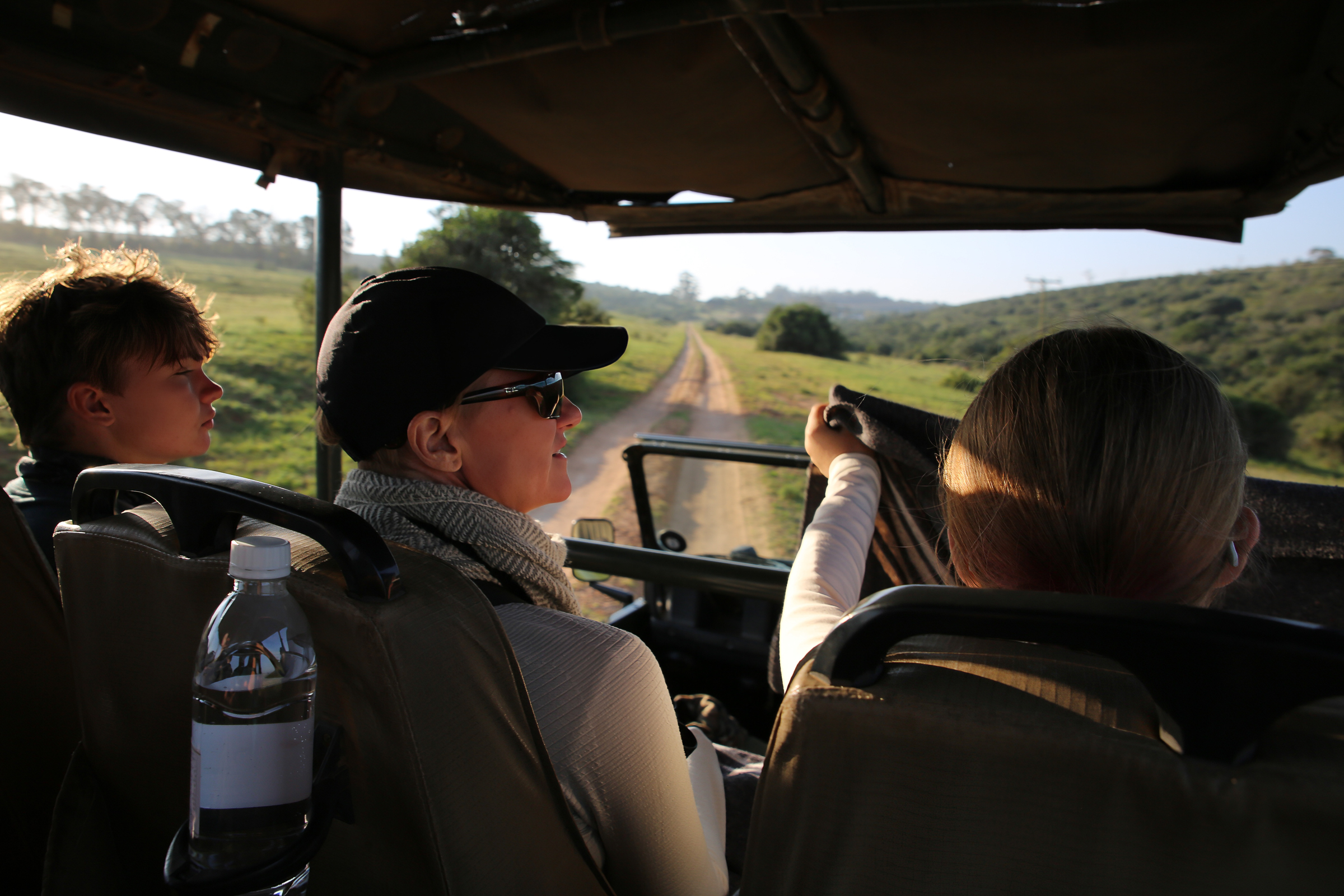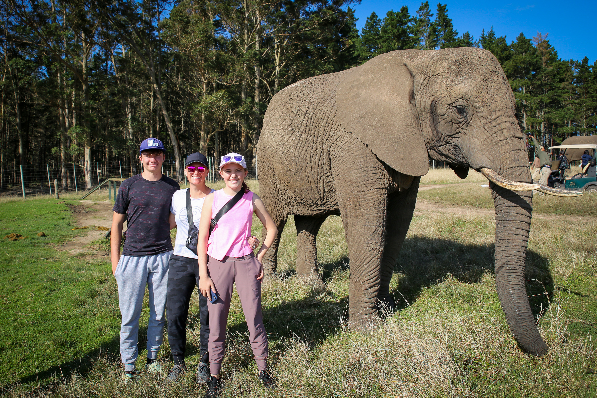 Addo National Park was wonderful, and before we moved on from the area we did an afternoon game drive at another nearby reserve – a private one this time – called Schotia. This area was smaller than Addo, we saw many of the same animals there but Schotia featured a few animals we had yet to see, such as a hippo (who put on a rare show for us) and some giraffes! And given that the reserve was private, our guide was able to go fully off-road where appropriate – which came in handy when we came across a Cape lion and followed him off the beaten path as he tried to evade some persistent females! The afternoon was remarkable, we finished off the day at Schotia with a braai (a bbq, but the food is cooked over wood or coals) featuring kudu steaks. After a quick mini game drive in the dark (Josh worked a floodlight and found lots of glowing eyes!) we were back at our hotel, where we had to get ready to fly back to Cape Town the next day to meet up with the Coozes.