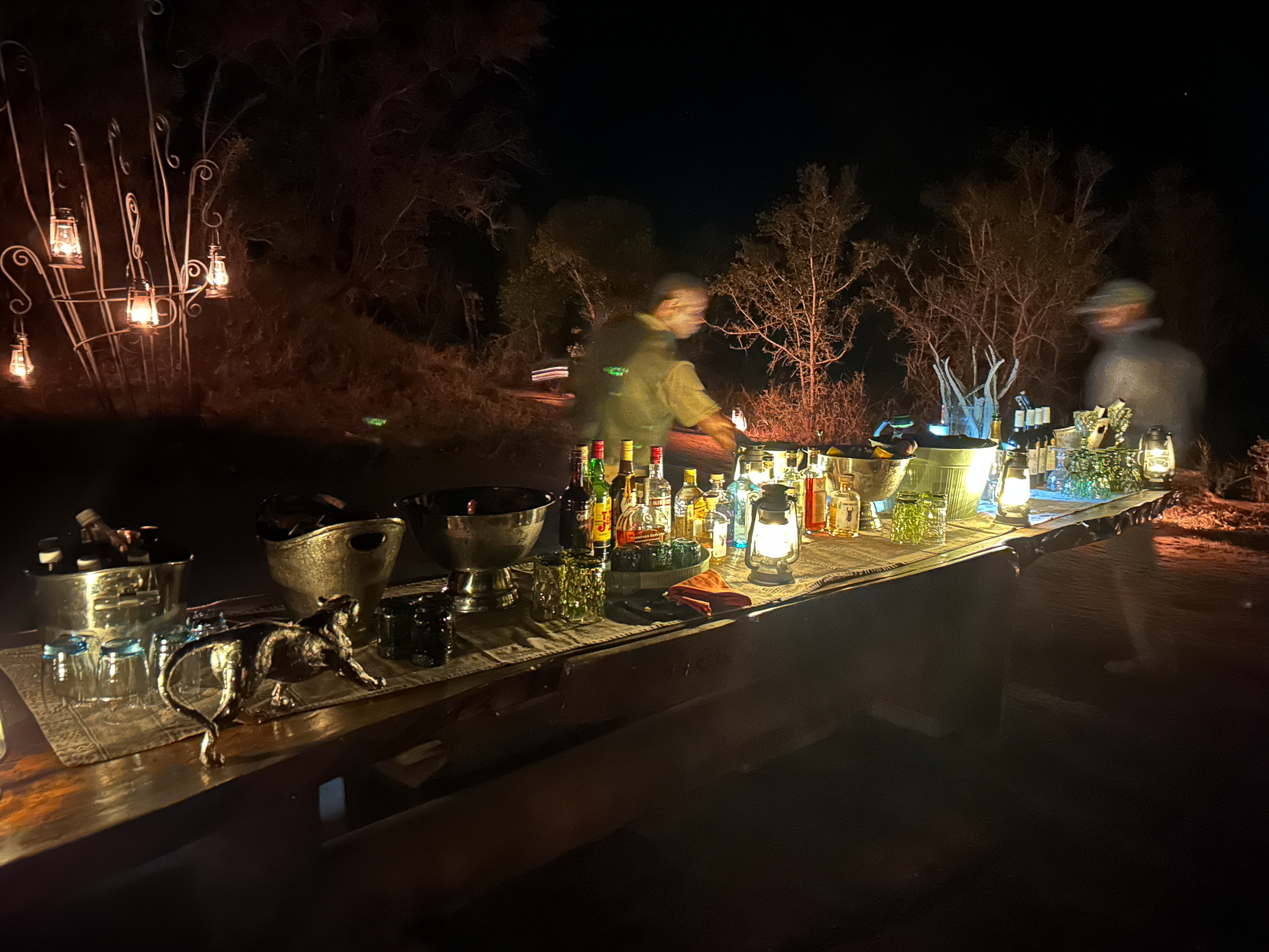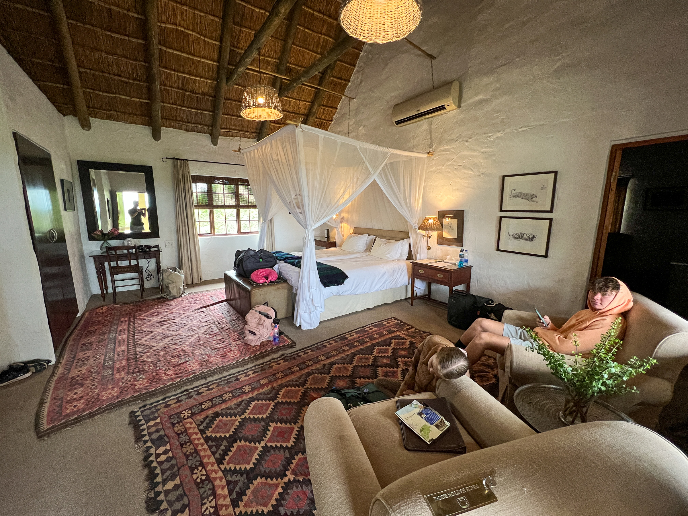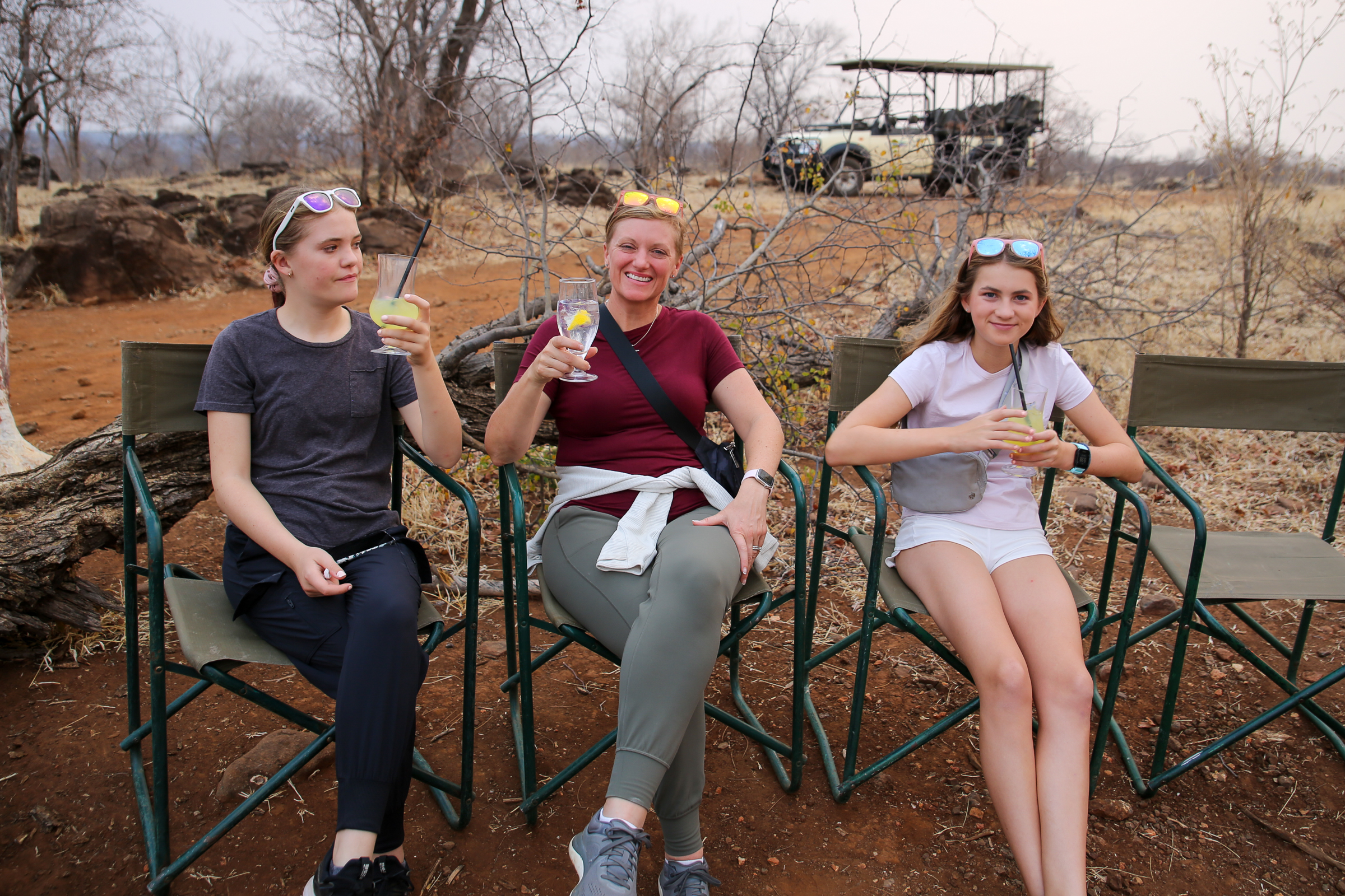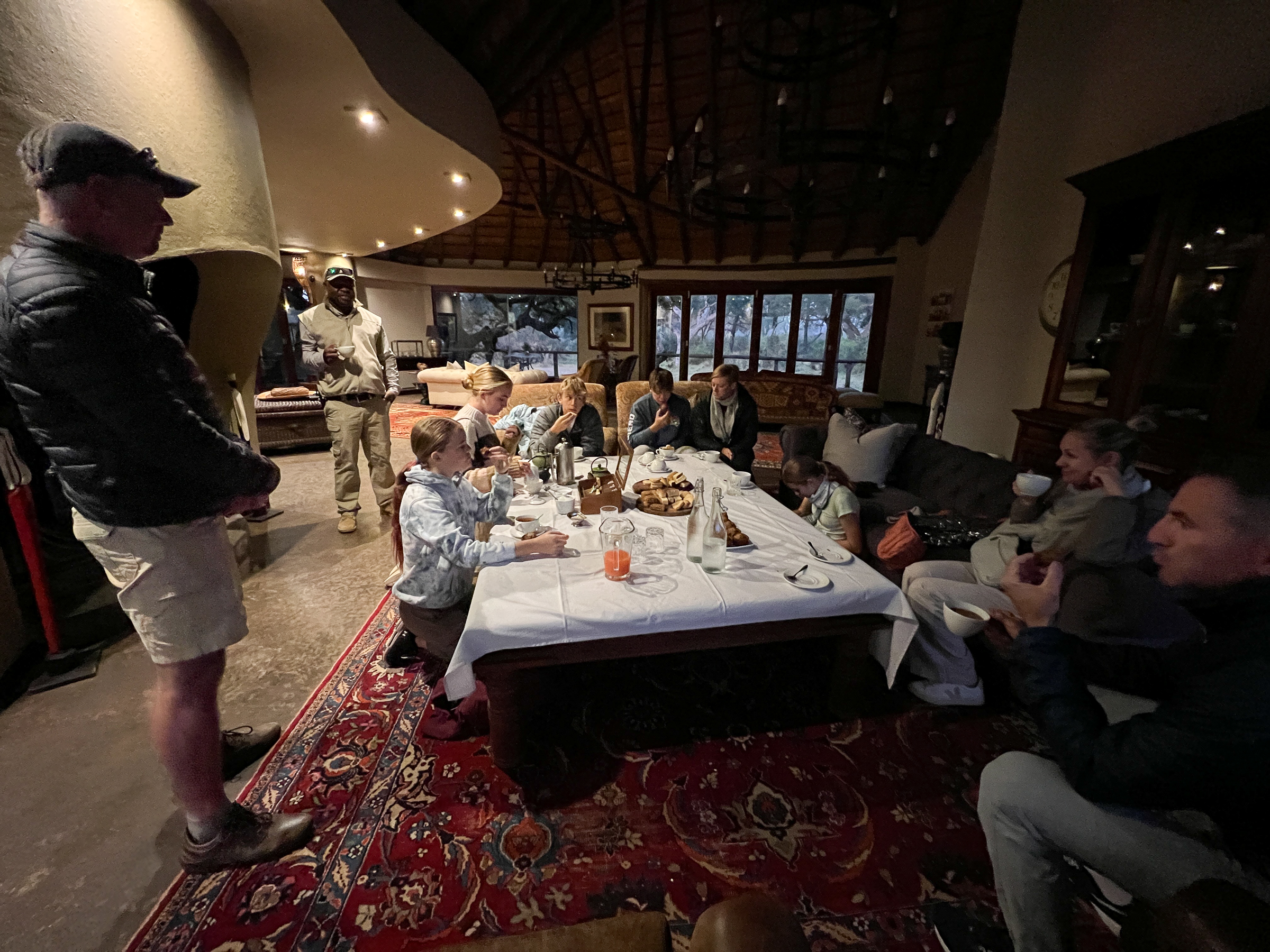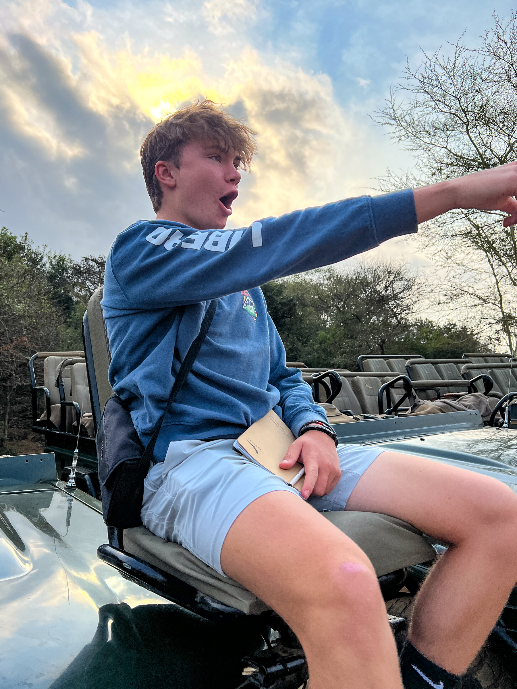 While at Phinda, our days typically went as follows: wake up at 5:30am, head to the Lodge for a pastry & drink at 6, on the game drive with Andrew & Joel no later than 6:30. Depending on what was happening, we’d stop for a hot chocolate / coffee (with Amarula!) somewhere around 9, then back to the Lodge around 10-10:30 for a proper breakfast. We’d hang out and relax for a few hours, then have lunch around 1pm and be ready to head out around 3:00 for our afternoon drive. We’d stop for a cocktail and leg stretch while enjoying the sunset, then continue on the drive, finishing around 6:30. We’d all sit down for a nice dinner in the Lodge around 7, then the kids would go off and ‘chill’ (phones!) for the evening while the adults would have a nightcap by the fire. Tough life I know – but come on, this is what vacations are for!