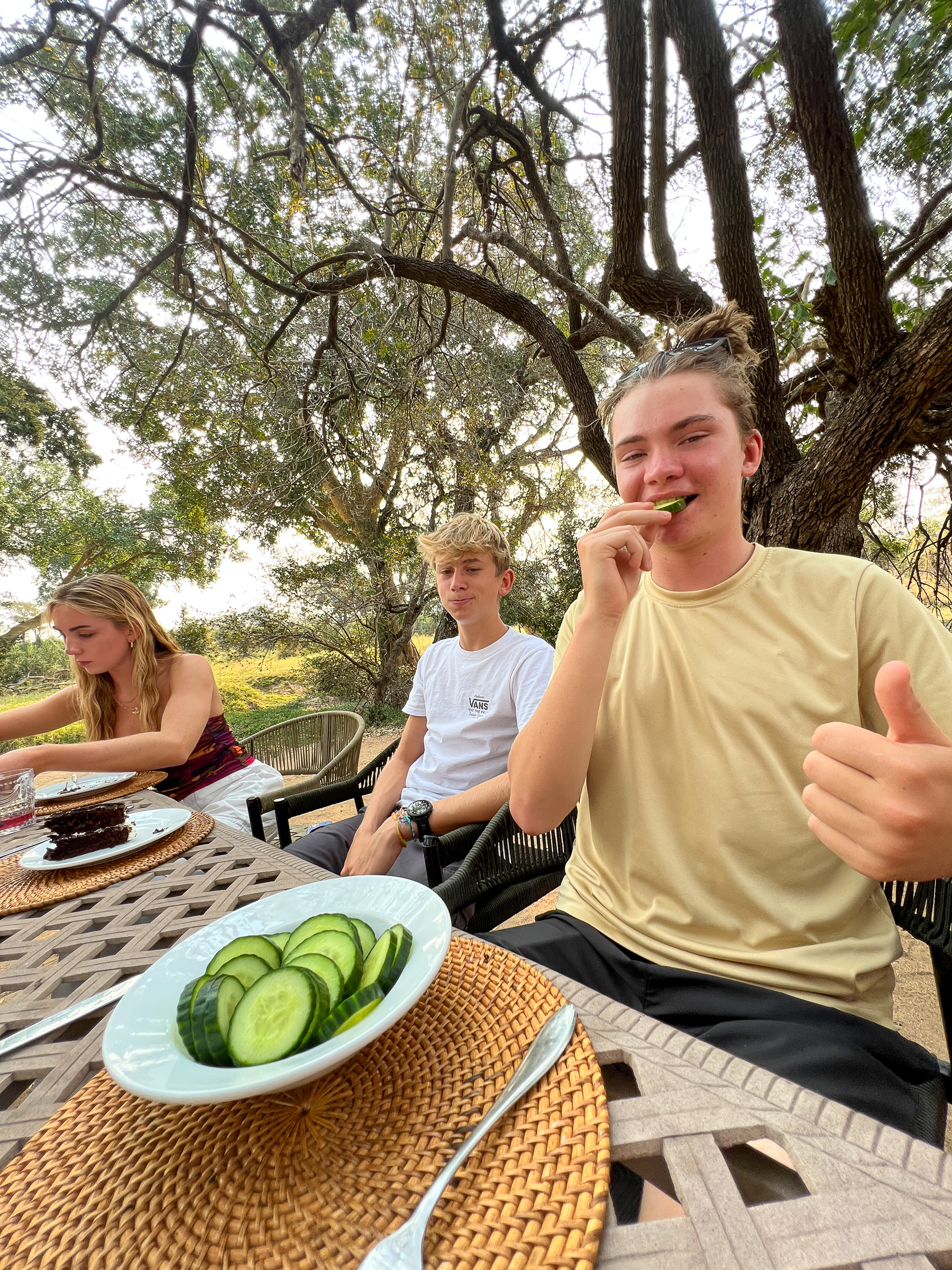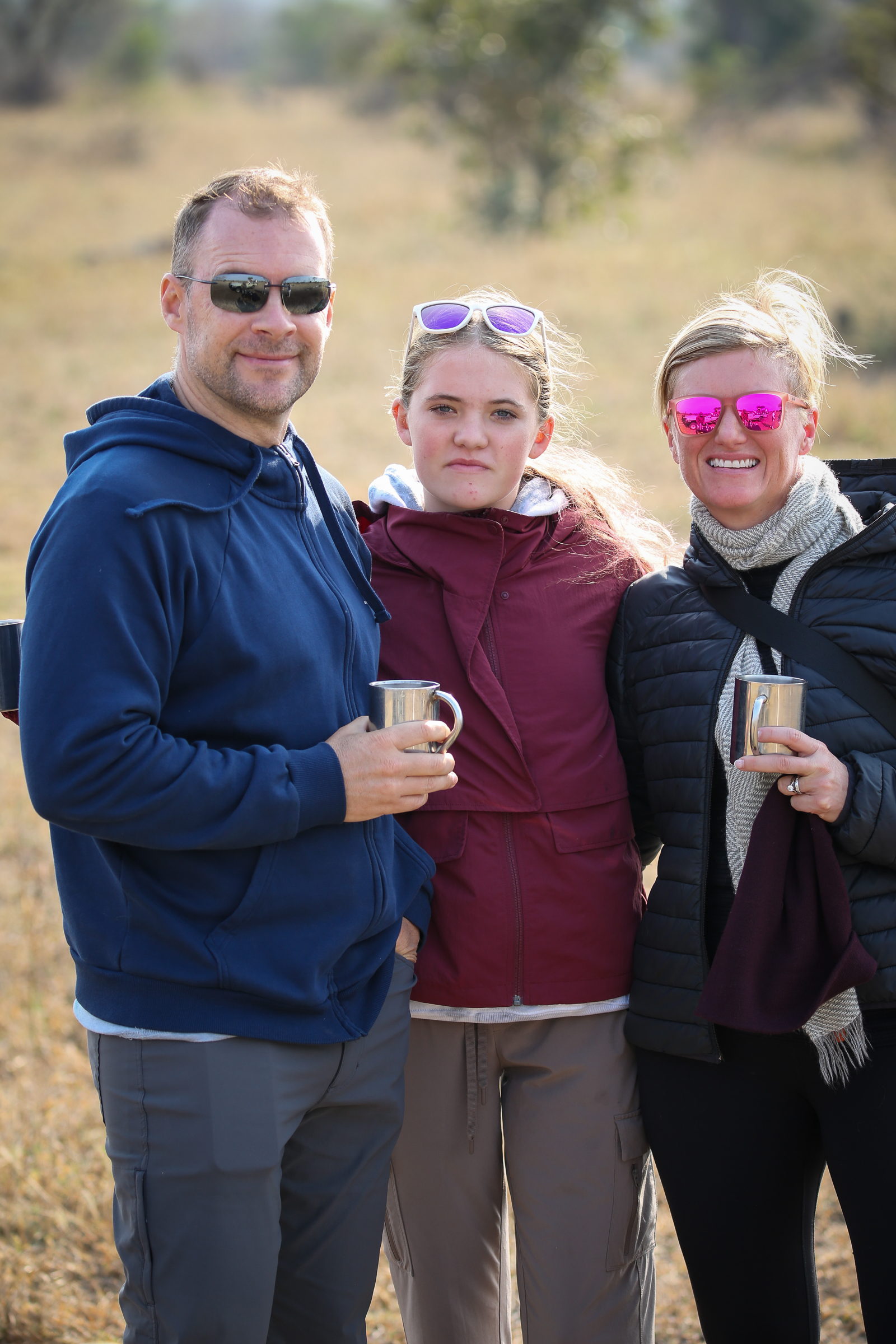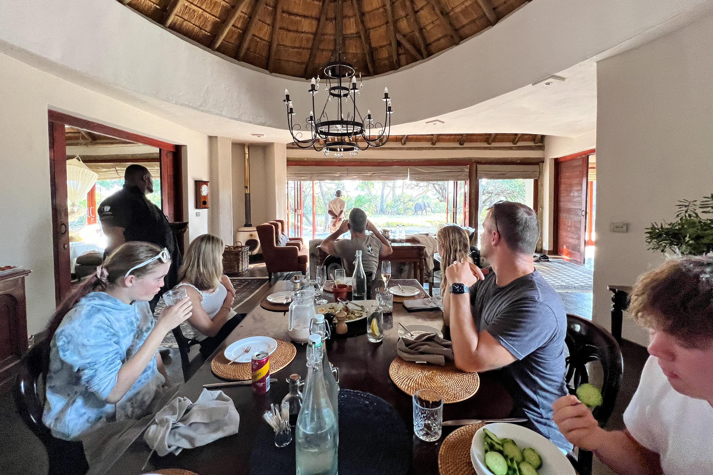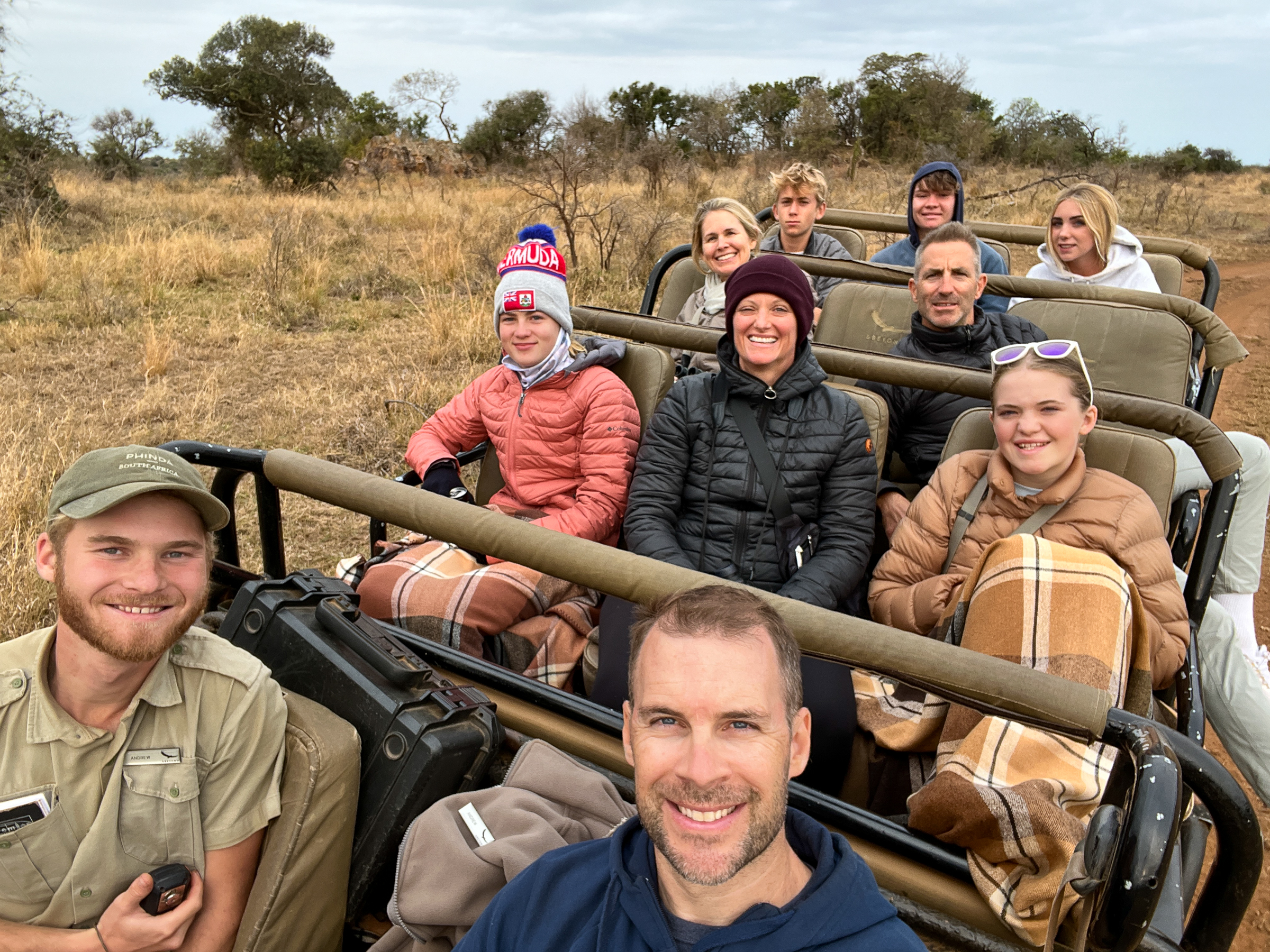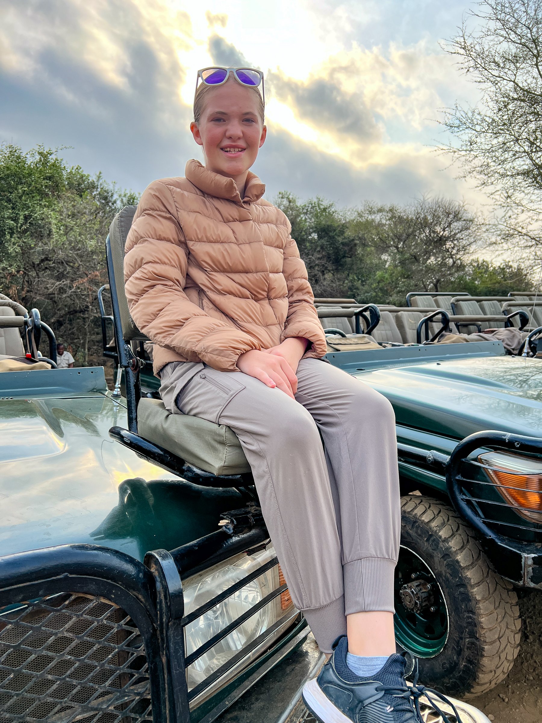While at Phinda, our days typically went as follows: wake up at 5:30am, head to the Lodge for a pastry & drink at 6, on the game drive with Andrew & Joel no later than 6:30. Depending on what was happening, we’d stop for a hot chocolate / coffee (with Amarula!) somewhere around 9, then back to the Lodge around 10-10:30 for a proper breakfast. We’d hang out and relax for a few hours, then have lunch around 1pm and be ready to head out around 3:00 for our afternoon drive. We’d stop for a cocktail and leg stretch while enjoying the sunset, then continue on the drive, finishing around 6:30. We’d all sit down for a nice dinner in the Lodge around 7, then the kids would go off and ‘chill’ (phones!) for the evening while the adults would have a nightcap by the fire. Tough life I know – but come on, this is what vacations are for!