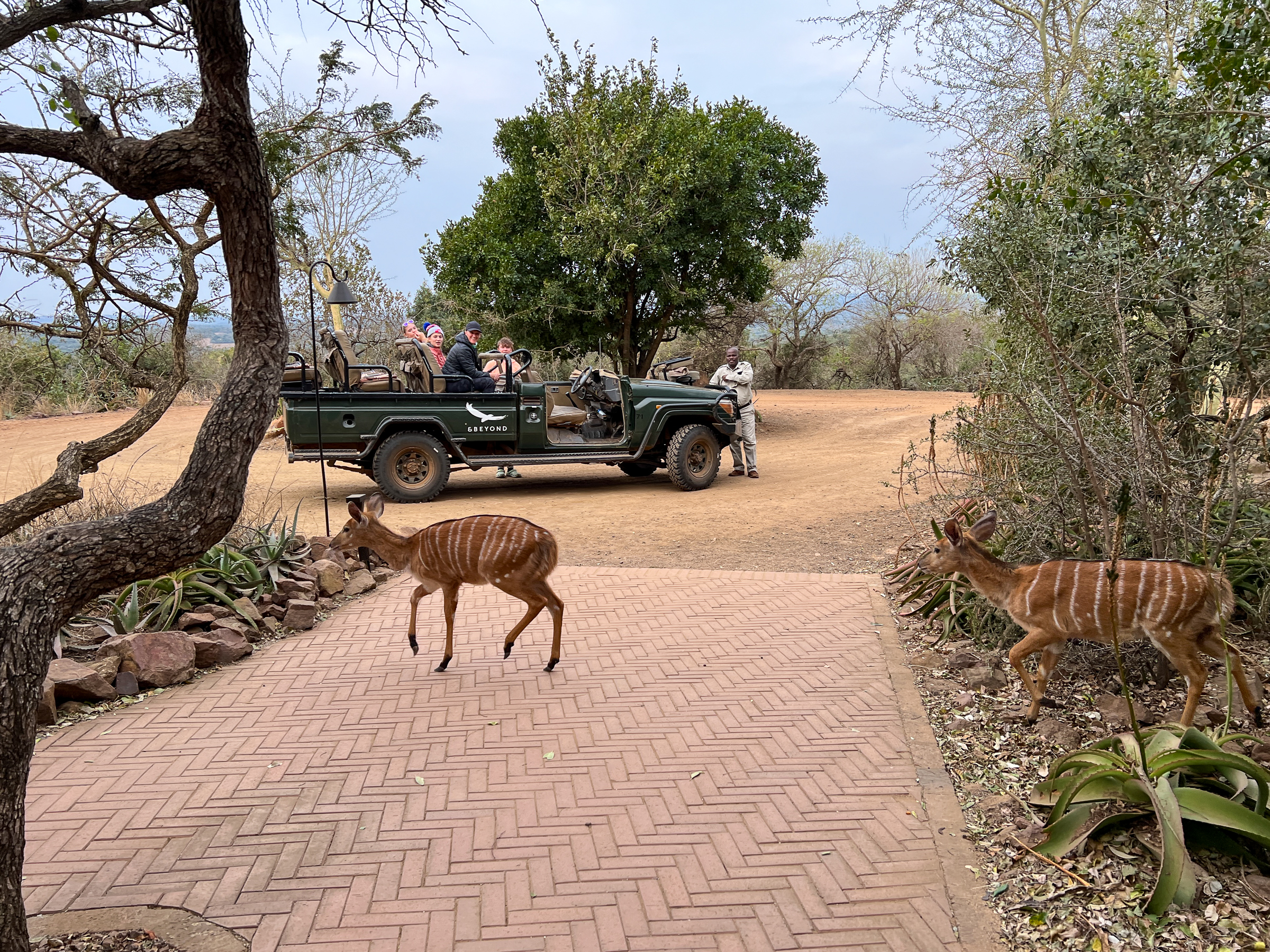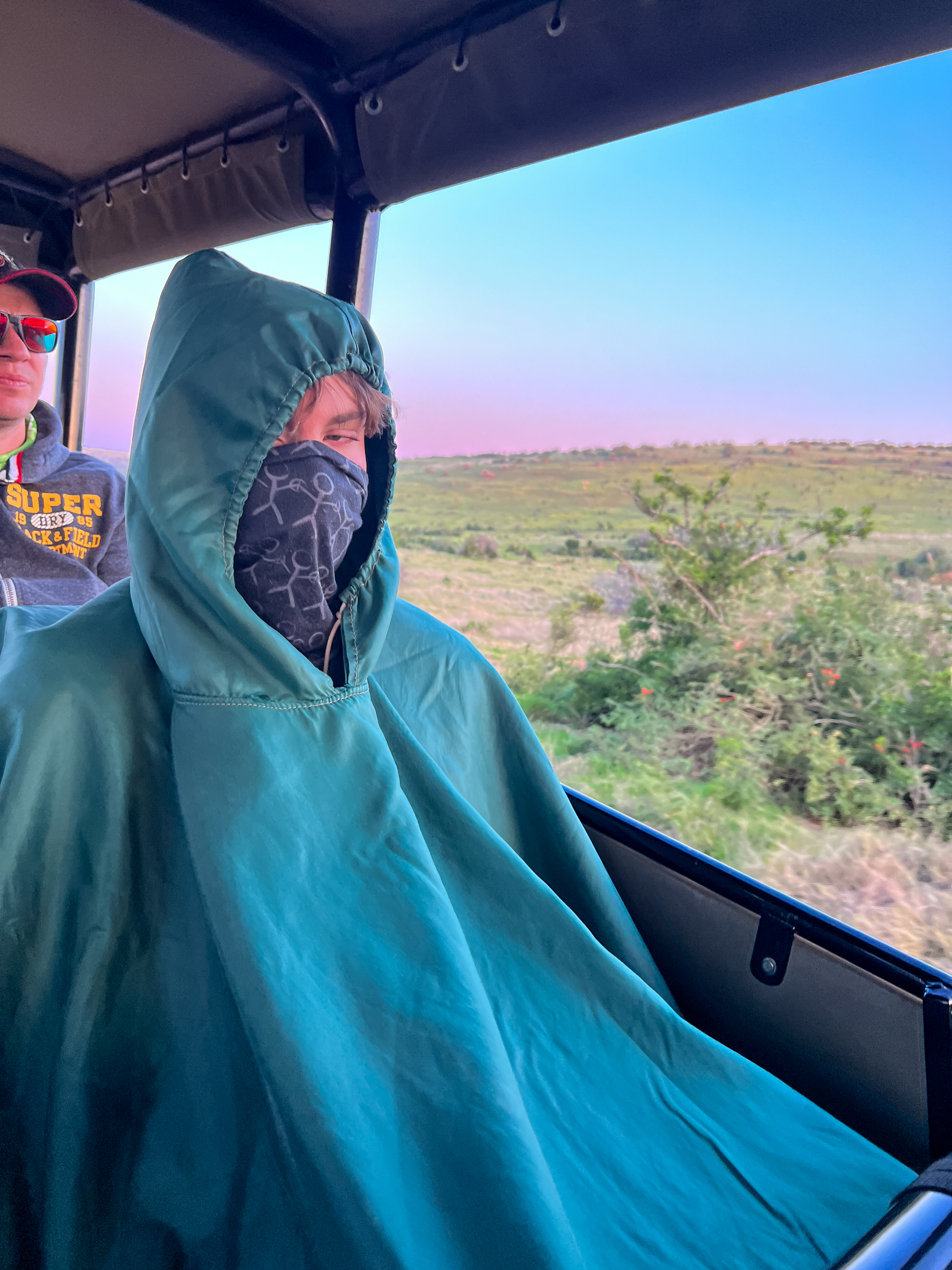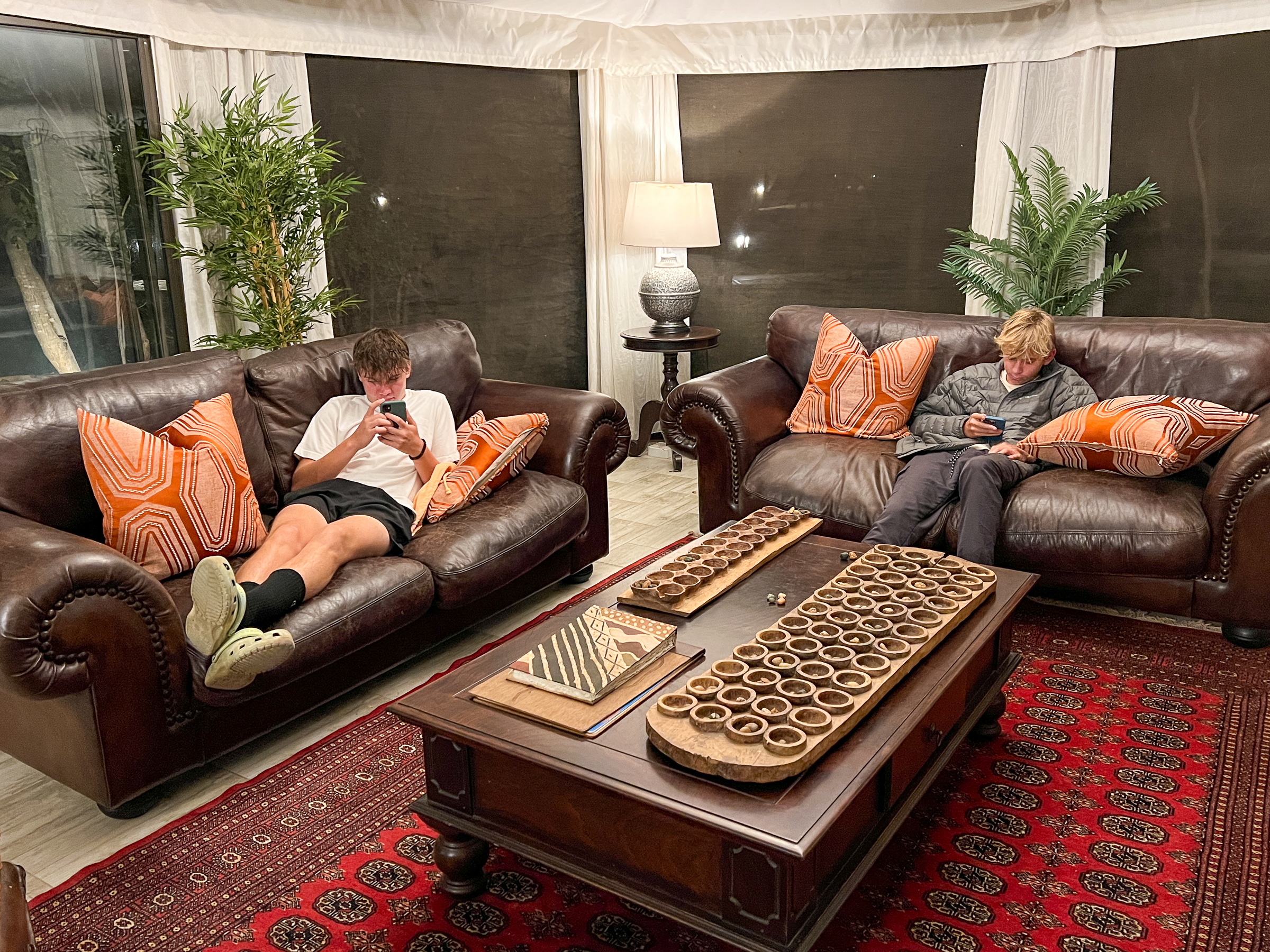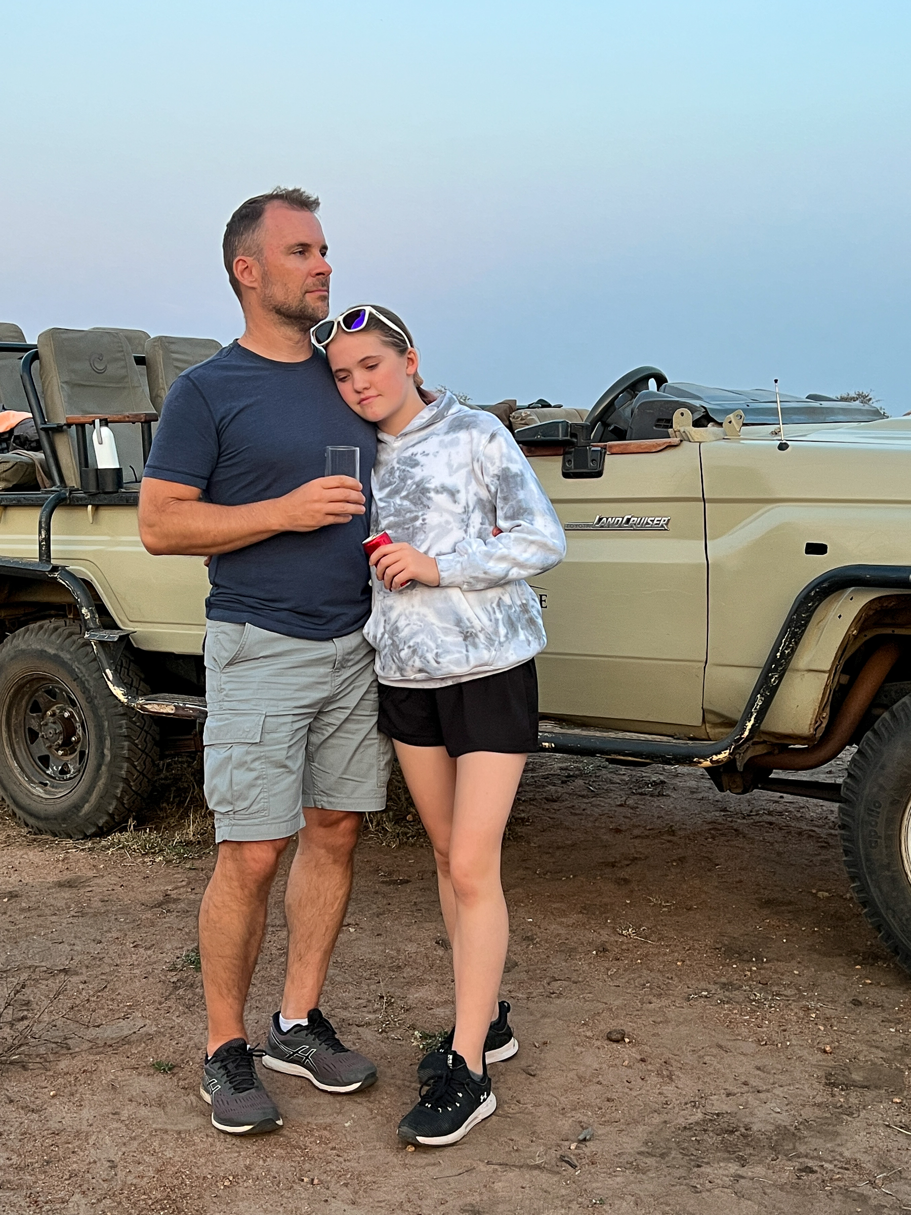 While at Phinda, our days typically went as follows: wake up at 5:30am, head to the Lodge for a pastry & drink at 6, on the game drive with Andrew & Joel no later than 6:30. Depending on what was happening, we’d stop for a hot chocolate / coffee (with Amarula!) somewhere around 9, then back to the Lodge around 10-10:30 for a proper breakfast. We’d hang out and relax for a few hours, then have lunch around 1pm and be ready to head out around 3:00 for our afternoon drive. We’d stop for a cocktail and leg stretch while enjoying the sunset, then continue on the drive, finishing around 6:30. We’d all sit down for a nice dinner in the Lodge around 7, then the kids would go off and ‘chill’ (phones!) for the evening while the adults would have a nightcap by the fire. Tough life I know – but come on, this is what vacations are for!