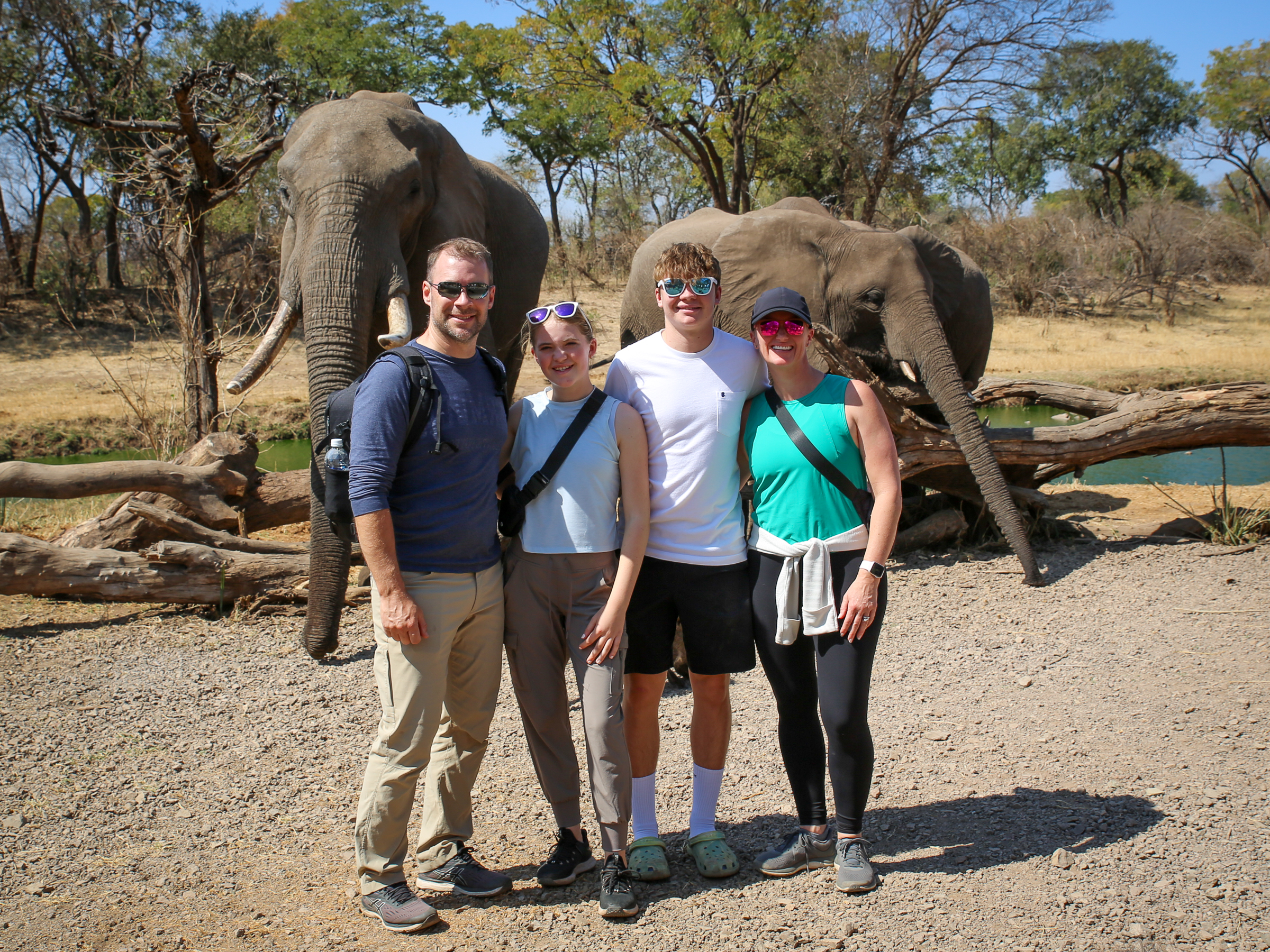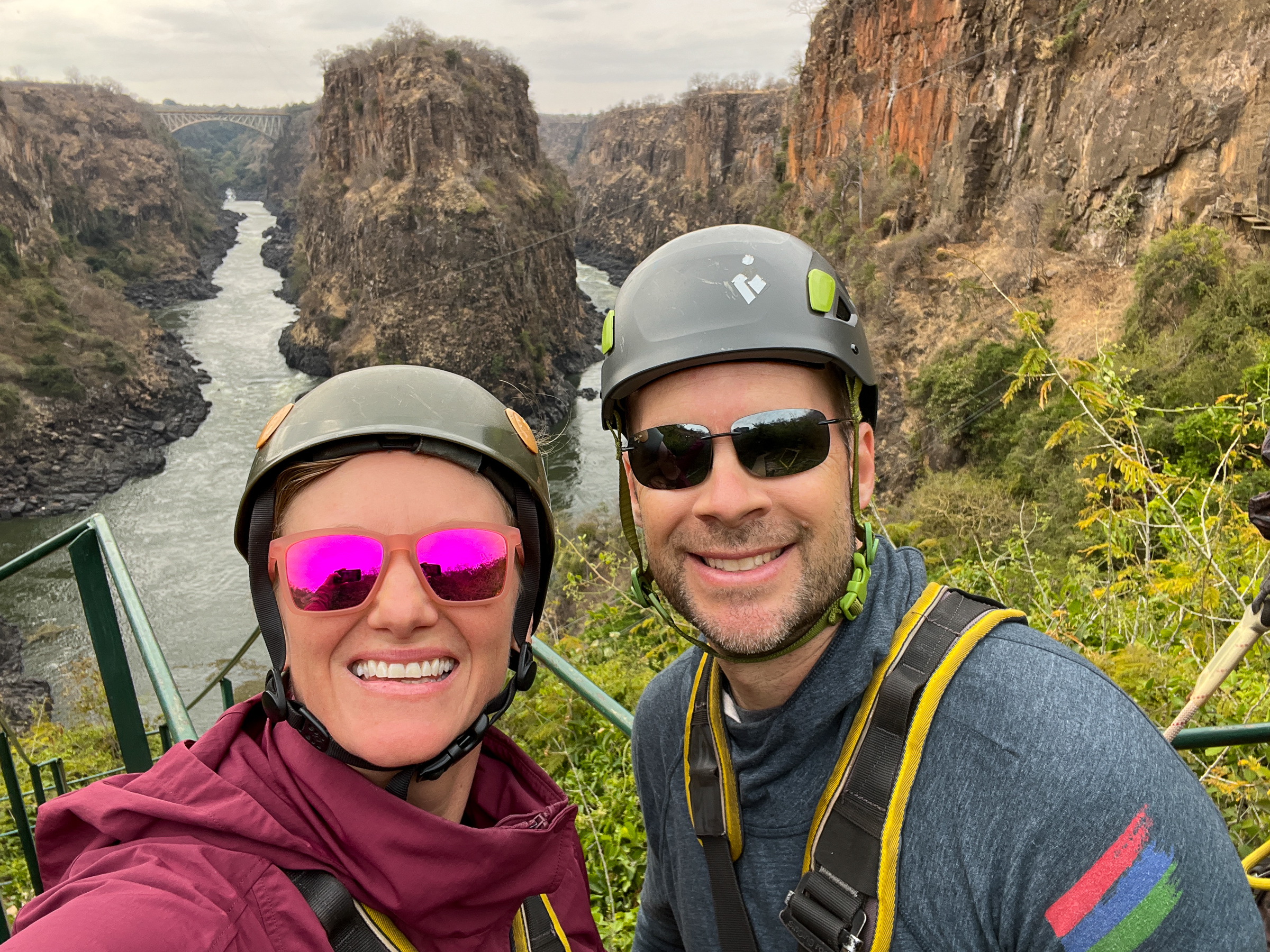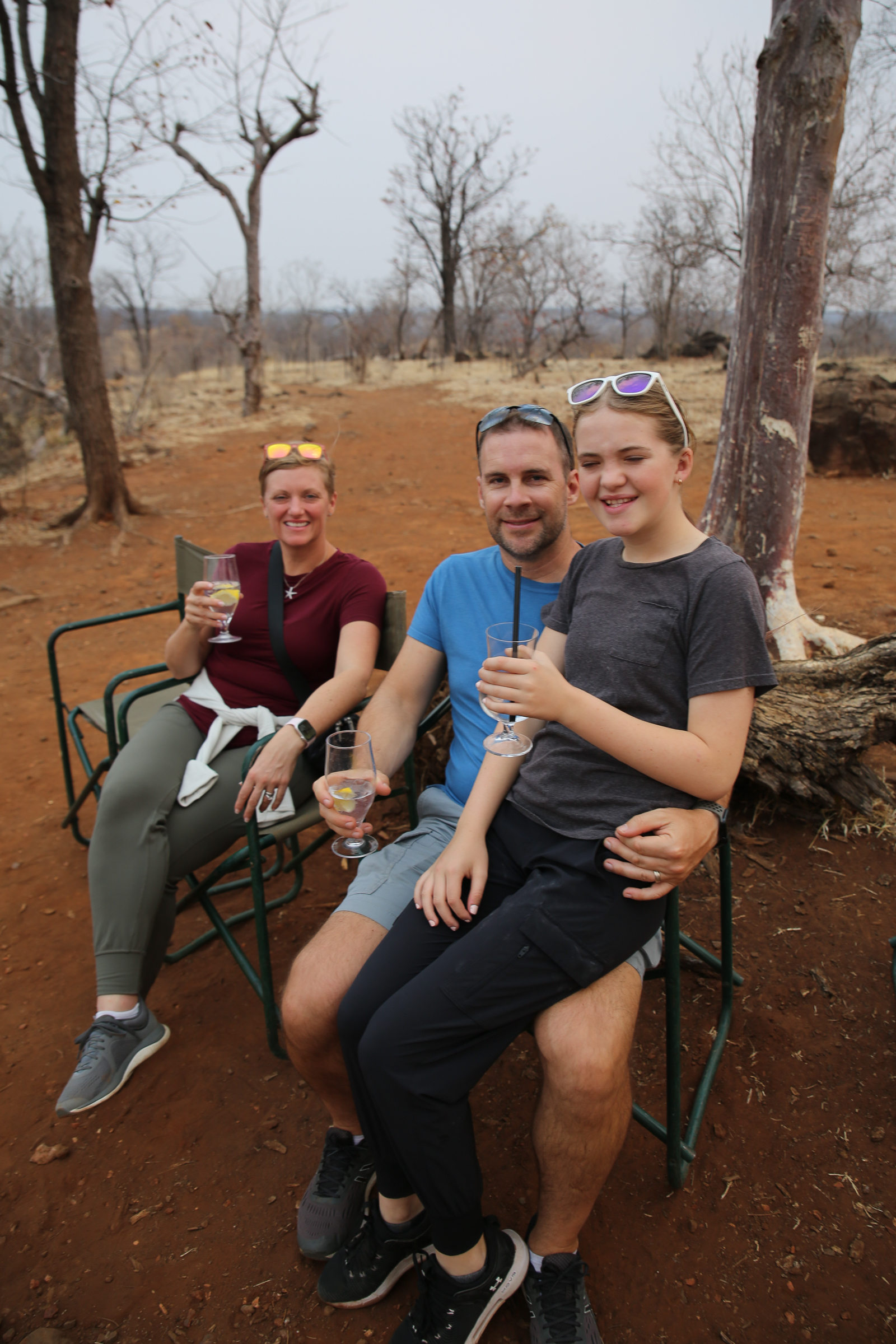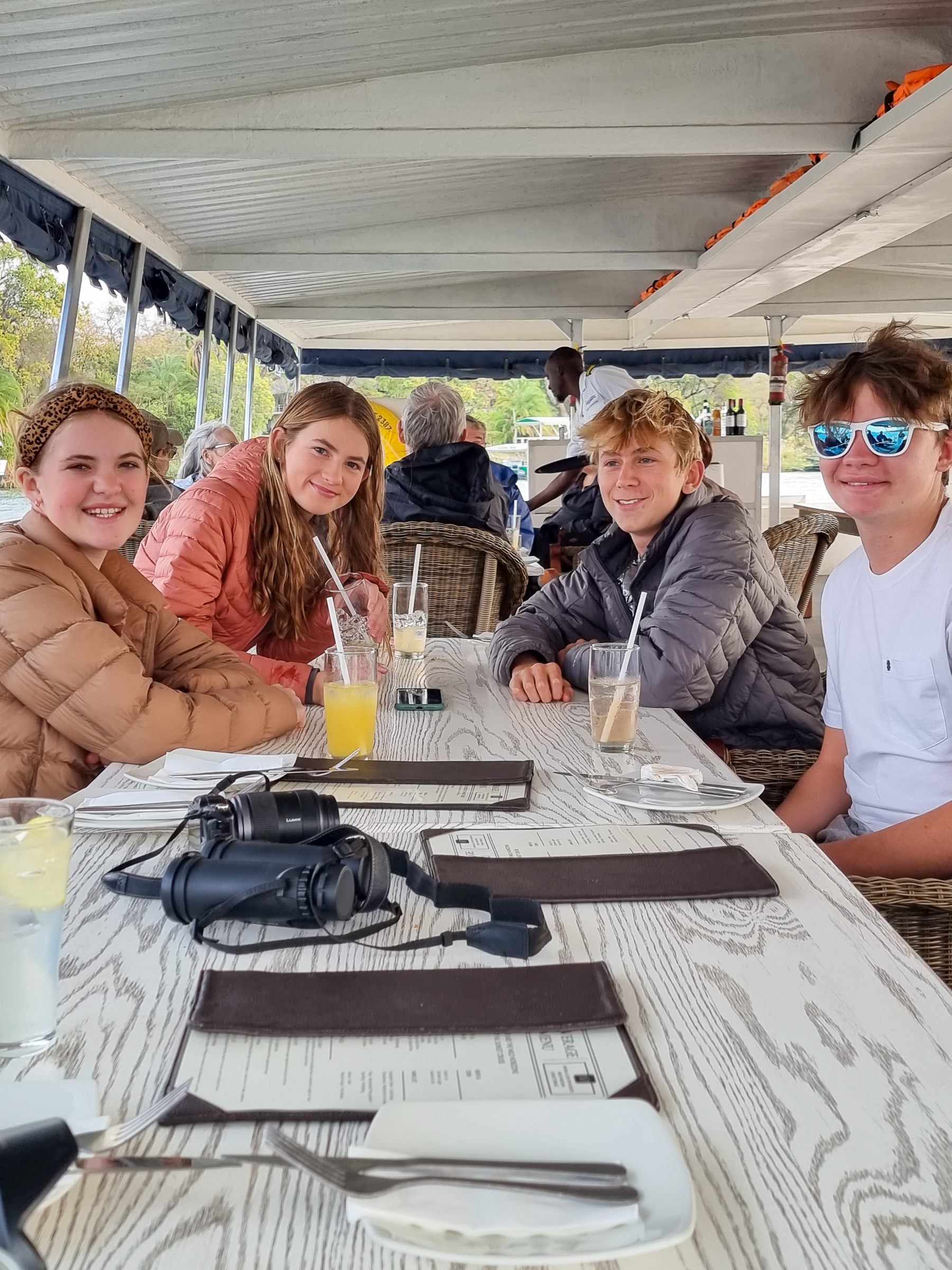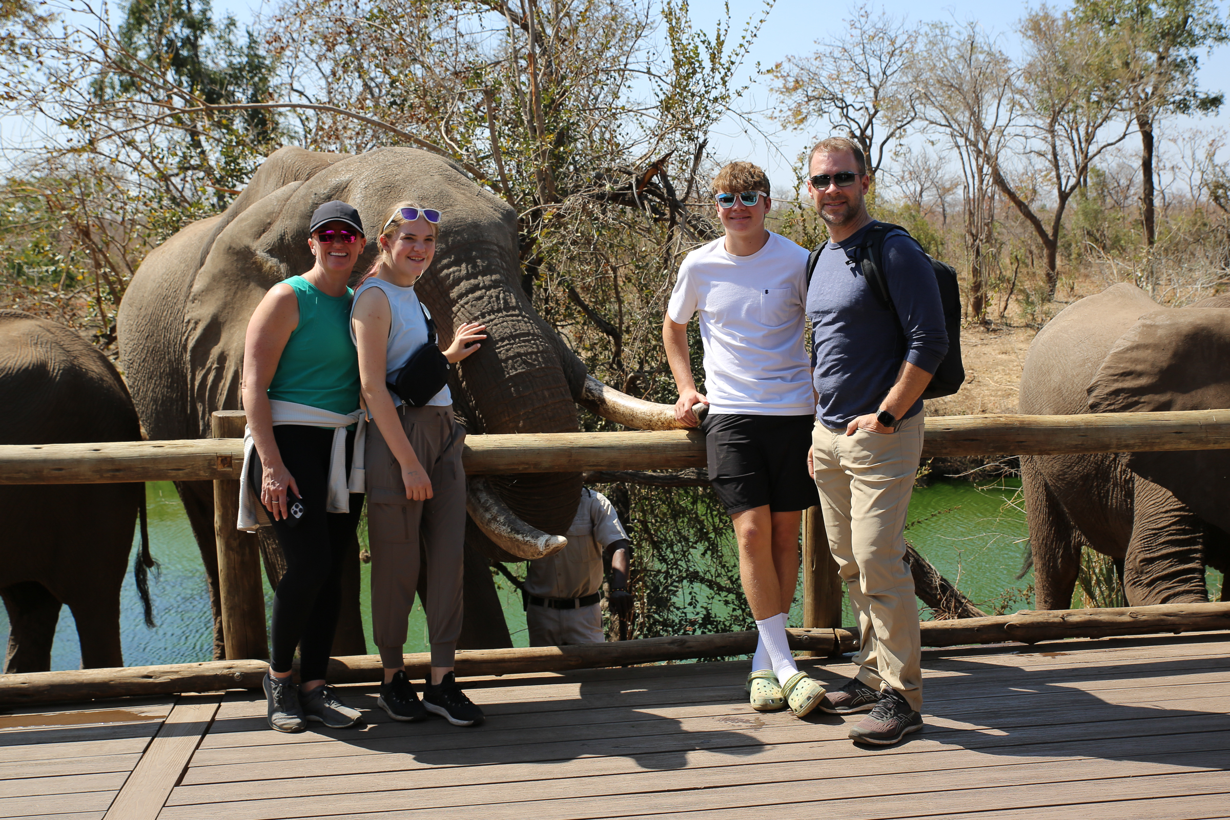As eluded to before, this was a less-than-straightforward process. The border crossing was much more chaotic and ultimately it took 2 hours and some ‘encouragement’ from our guide to get us across the border. Our final hotel was the Elephant Camp, only about 30 min drive south of Avani – all the buildings, including the main lodge area, were essentially tents (at least the roofs were) – gave it all a bit of a whimsical feel. Food and service were again great, there was just one other couple around so we more or less had a run on our side of the resort. As our vacation was winding down, we weren’t fussed about doing a whole lot (we already did all the things!), though we did do one last adventure to do a zip line canopy tour at the Lookout Cafe. The kids went one step further, with Ryley and Isla once again doing a tandem foefie slide (zip line with a big dip in the middle from where they need to be retrieved), and Josh doing a scary-looking gorge swing (basically drop towards the water / rocks below, then swing way out)! We also did a walking tour back to Victoria Falls to see them from the Zimbabwe side. Otherwise, our activities were a little more low-key: a sunset boat cruise, having drinks in the bush (a la game drive) overlooking a gorge, a shopping trip into town (to find some gin that we liked), enjoying a bonfire at the resort in the evening, or playing a spirited game of Wildlife or Mancala in the lodge. We did one final elephant feeding nearby at another part of our resort (strangely enough the only time we saw elephants at the ‘Elephant Camp’).