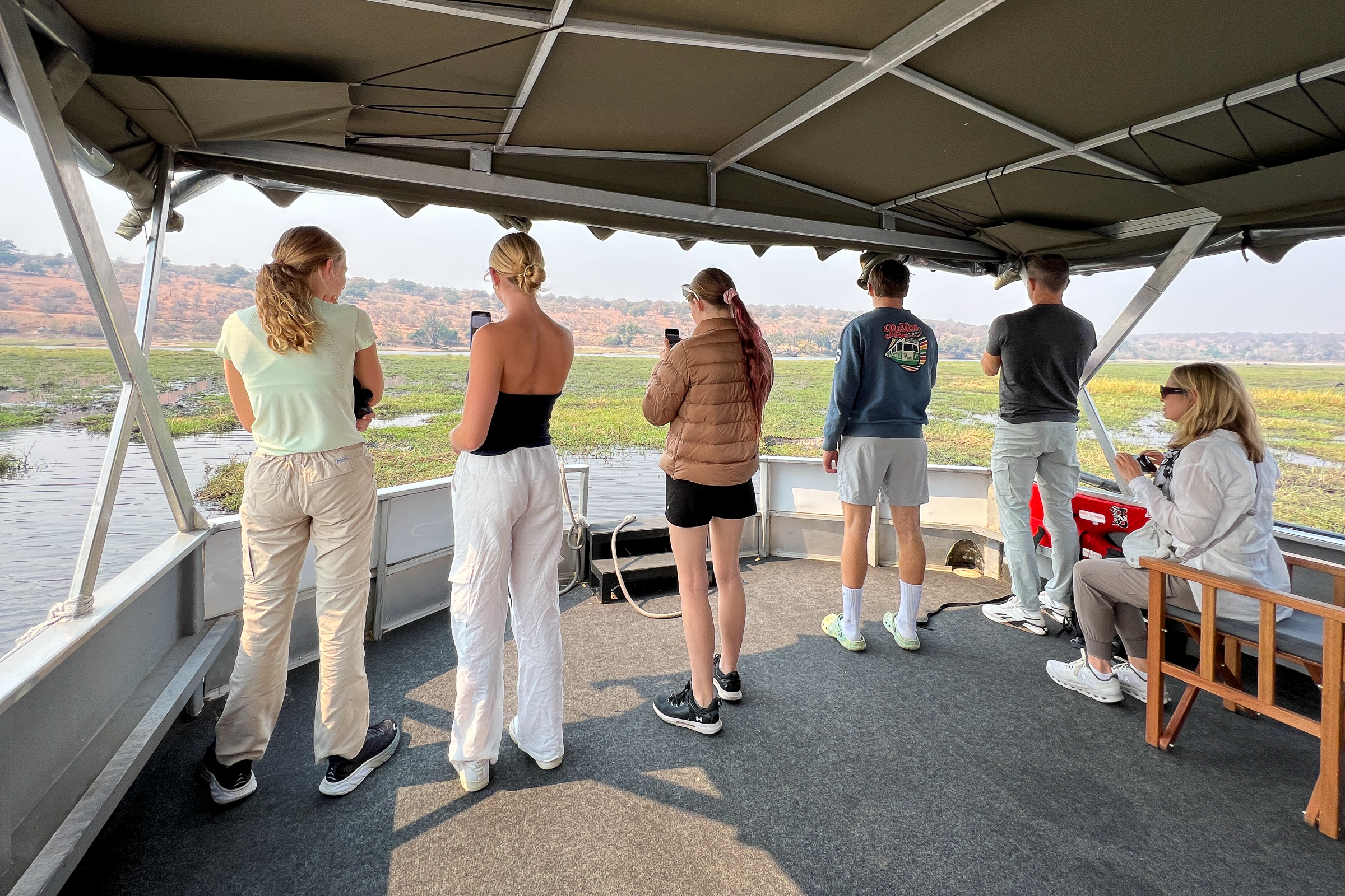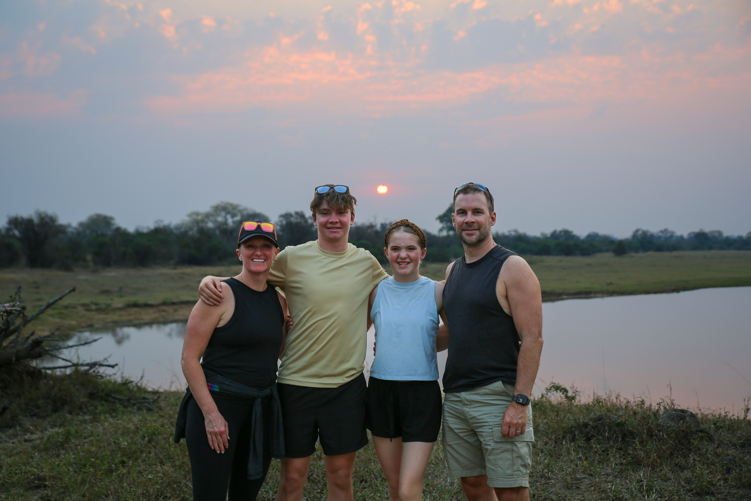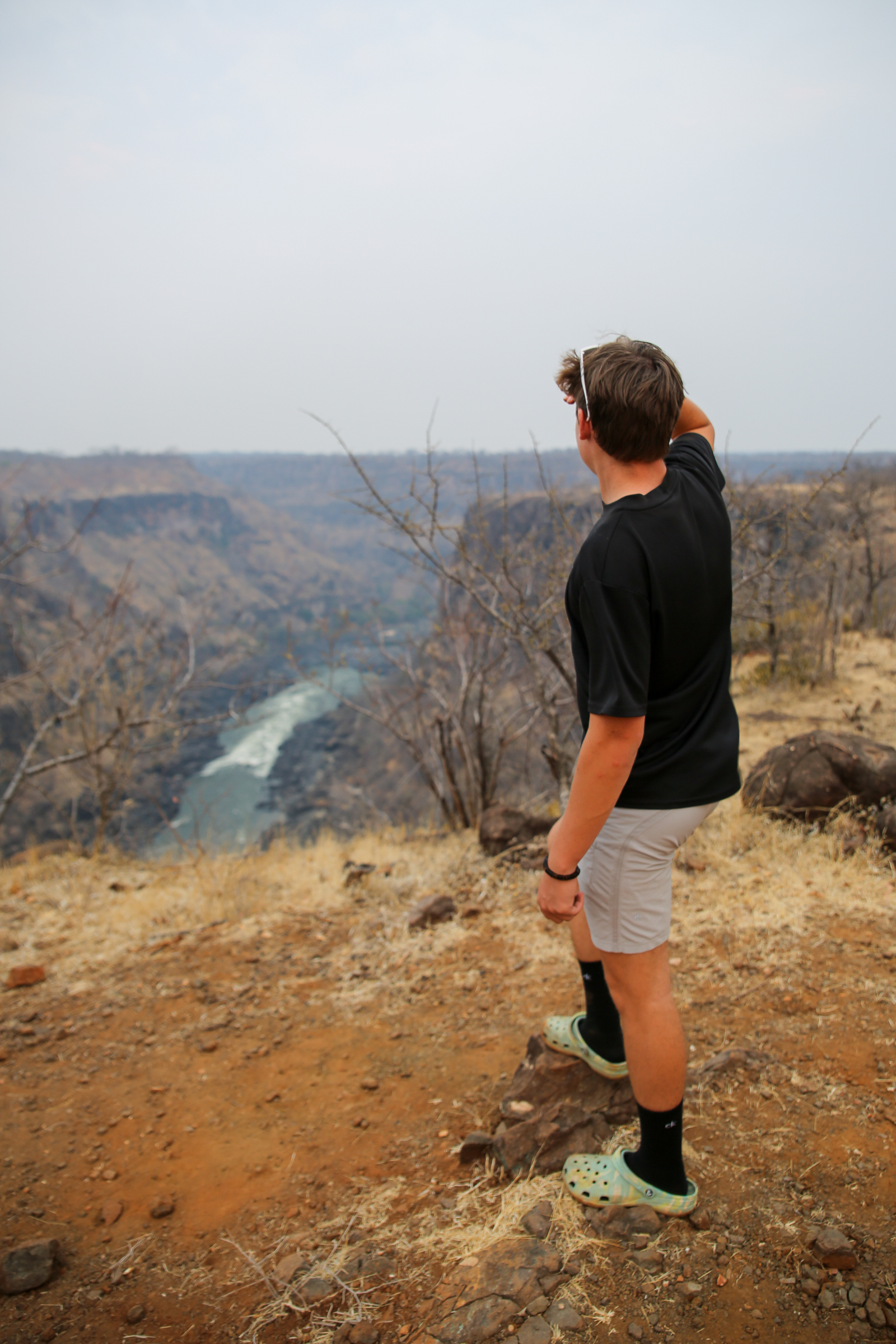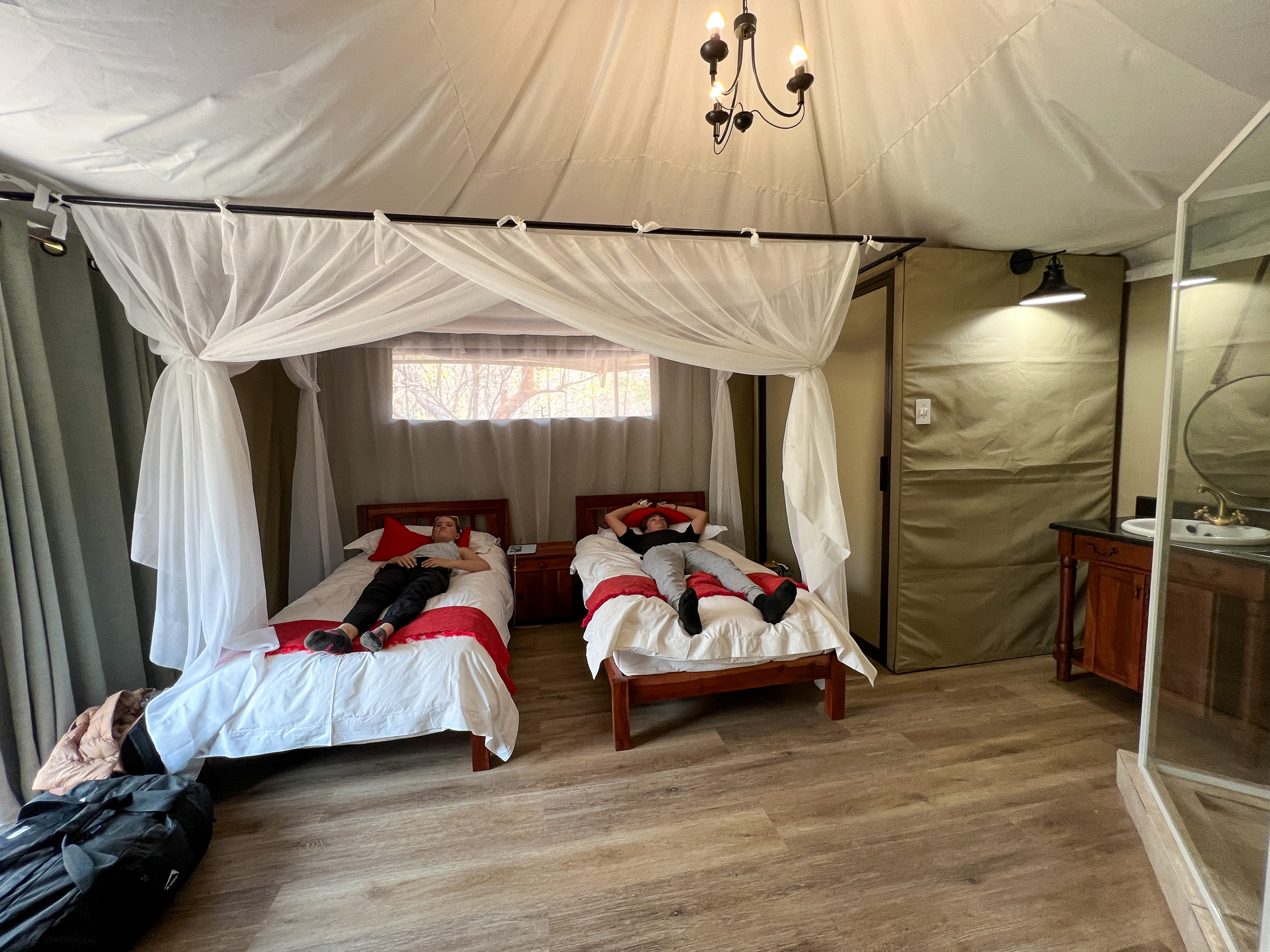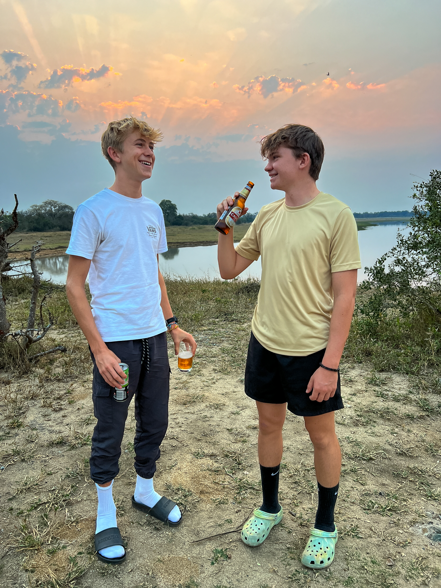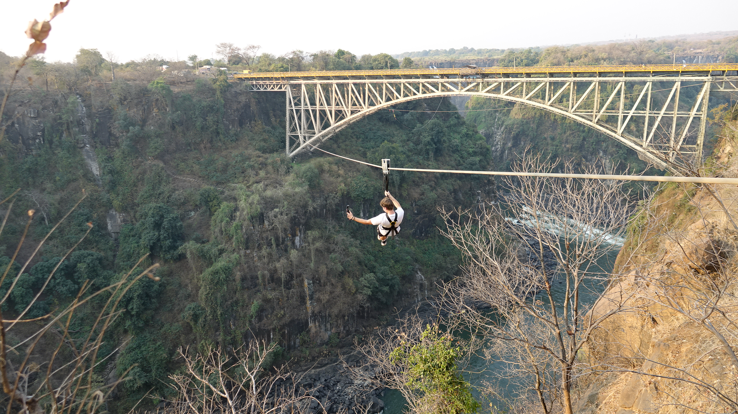 As eluded to before, this was a less-than-straightforward process. The border crossing was much more chaotic and ultimately it took 2 hours and some ‘encouragement’ from our guide to get us across the border. Our final hotel was the Elephant Camp, only about 30 min drive south of Avani – all the buildings, including the main lodge area, were essentially tents (at least the roofs were) – gave it all a bit of a whimsical feel. Food and service were again great, there was just one other couple around so we more or less had a run on our side of the resort. As our vacation was winding down, we weren’t fussed about doing a whole lot (we already did all the things!), though we did do one last adventure to do a zip line canopy tour at the Lookout Cafe. The kids went one step further, with Ryley and Isla once again doing a tandem foefie slide (zip line with a big dip in the middle from where they need to be retrieved), and Josh doing a scary-looking gorge swing (basically drop towards the water / rocks below, then swing way out)! We also did a walking tour back to Victoria Falls to see them from the Zimbabwe side. Otherwise, our activities were a little more low-key: a sunset boat cruise, having drinks in the bush (a la game drive) overlooking a gorge, a shopping trip into town (to find some gin that we liked), enjoying a bonfire at the resort in the evening, or playing a spirited game of Wildlife or Mancala in the lodge. We did one final elephant feeding nearby at another part of our resort (strangely enough the only time we saw elephants at the ‘Elephant Camp’).