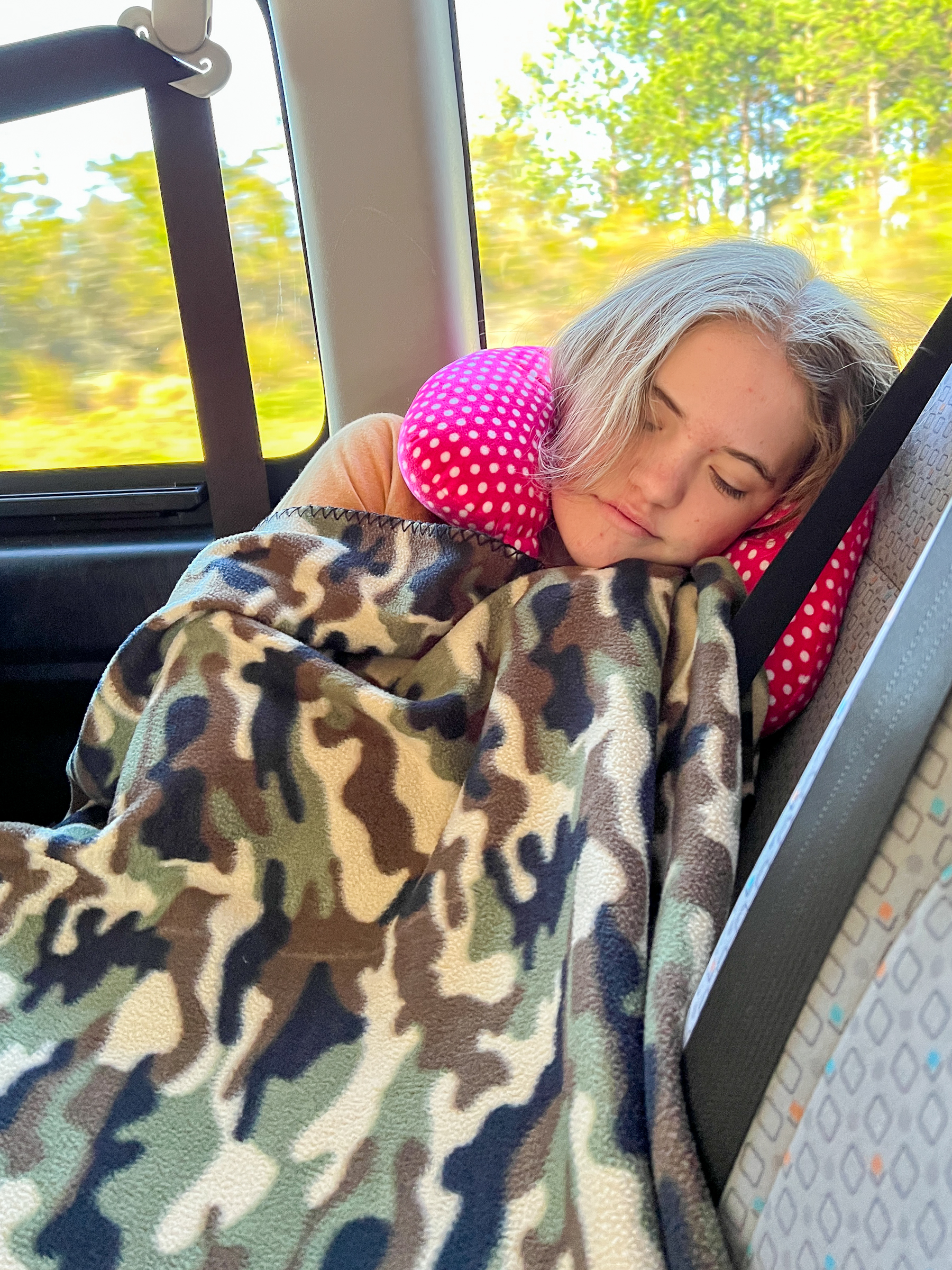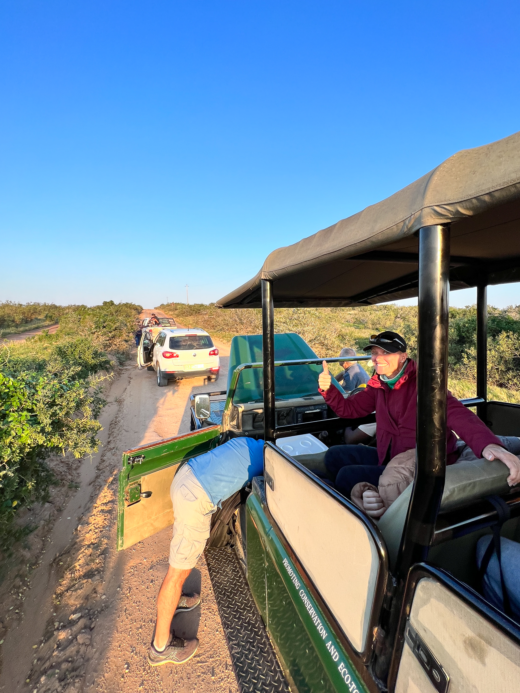 As for the animals, we were certainly not disappointed. We did 6 game drives while in Phinda – on the very first one (the day we arrived) we saw a cheetah with her two cubs, plus a white rhino, neither of which we had seen yet. Another time, we saw a bull elephant in musth strutting towards us on a road as we carefully backed up. We found a bloat of hippos, including babies playing with their dad. A field full of buffalo at first light. The adults did a walking tour in the bush one afternoon and came across four giraffes, who stared us down as it was likely odd for them to see people outside of a safari vehicle! We only saw one sleeping male lion, but it was cool to see him right beside an empty fresh carcass of a wildebeest! (We had so many great sightings, these were just a few examples.) The only one of the big 5 that eluded us before we left was the leopard – we spent the better part of a day or so looking for one known to the area but she was well hidden.