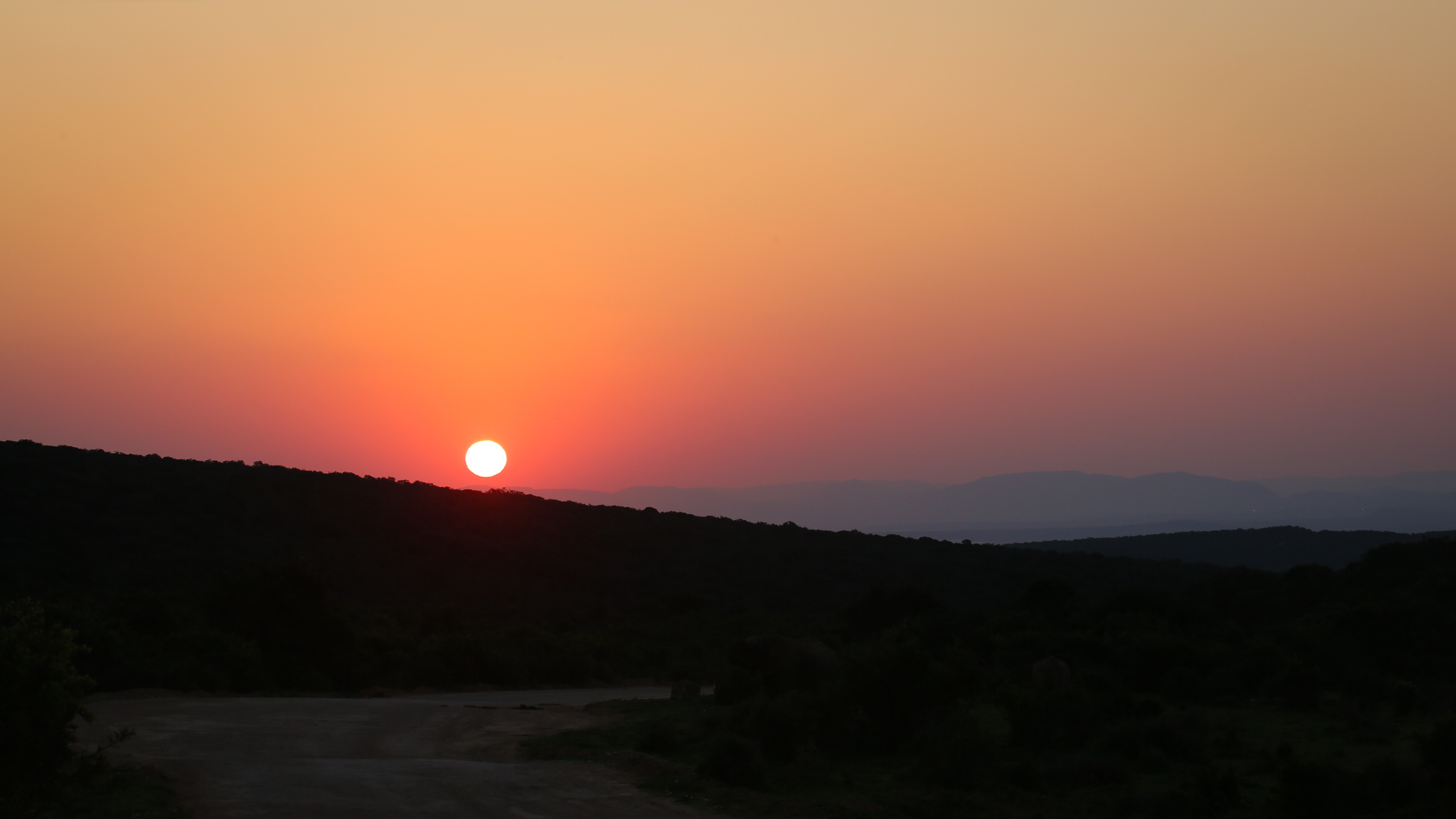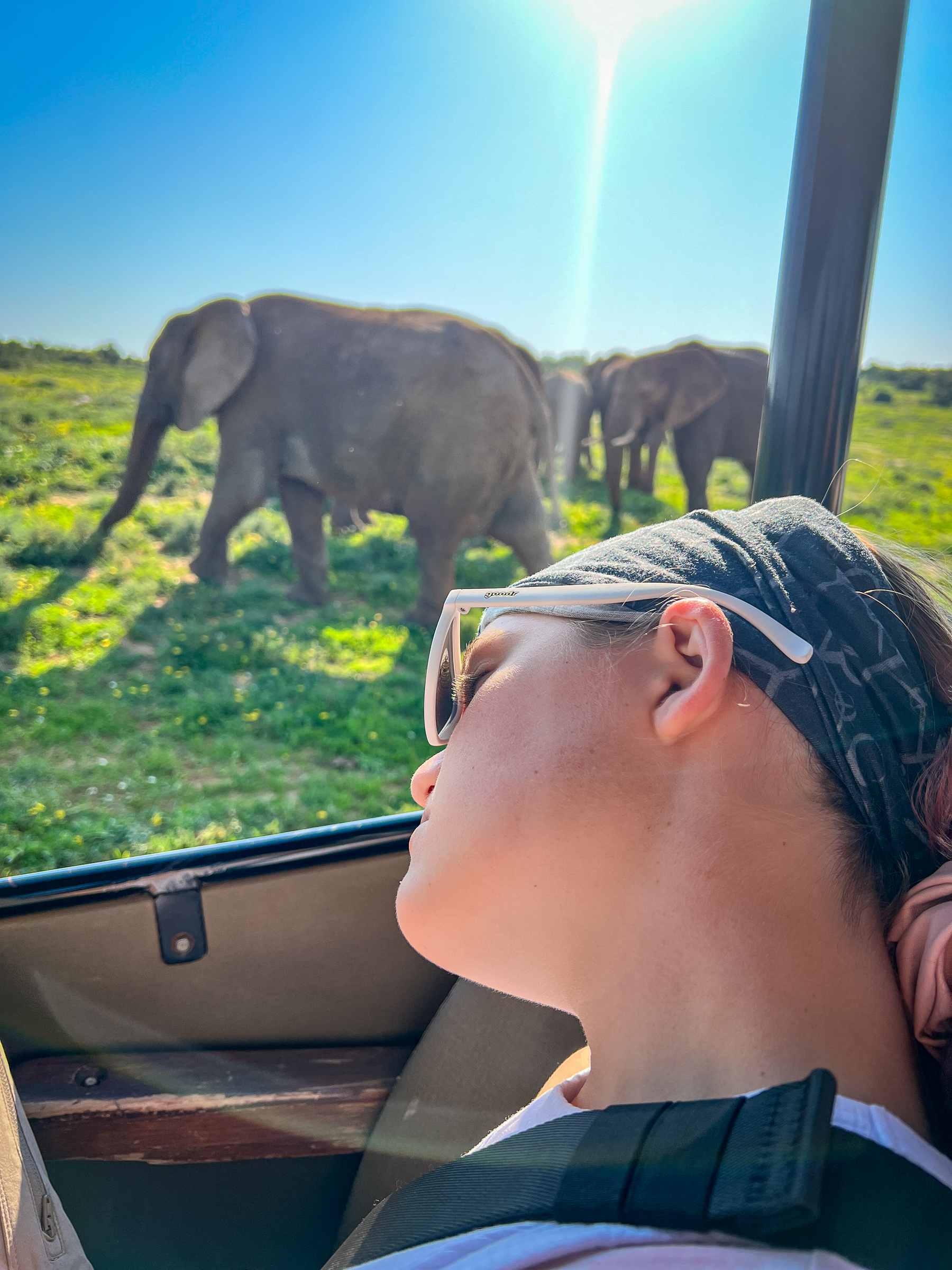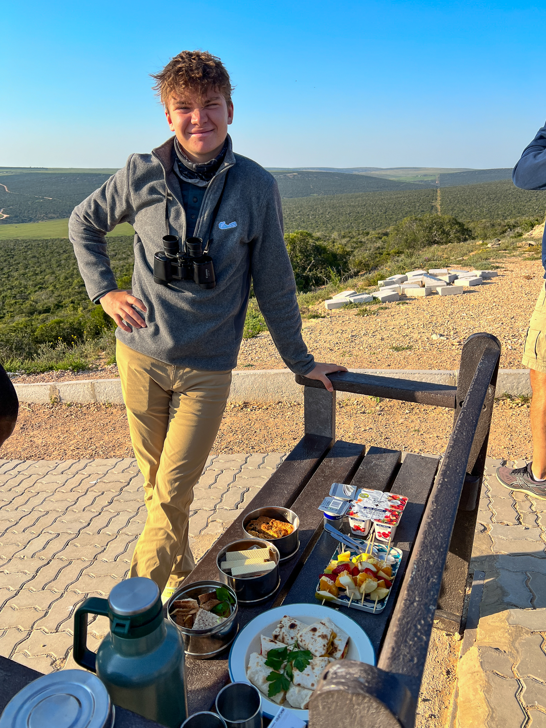 We Wilson’s aren’t idle for long, however – after breakfast the next morning, we hit the road with Irma at the wheel, heading further east about 3.5 hours to Elephant House in Addo, our home for another two days. Our timing was bang on as we had about a half hour to check in, get refreshed, and get back in an awaiting open-air safari vehicle for our first real game drive! (Ryley unfortunately wasn’t feeling 100% after her seafood & lemon feast plus the long car ride… so she came along but slept through most of this first one.) We were a little rushed but it was totally worth it, the game drive was marvelous. We saw lots of different animals like zebras, warthogs, and kudus, amongst about a million elephants! We even saw a few dung beetles. Then, just before a gorgous sunset, we found a small pride of lions! So amazing. The only not-great thing was that our Land Rover broke down just before we saw the lions – and while we were able to get the vehicle going again to get back to the hotel, we’d have to switch to a decidedly more uncomfortable closed-in vehicle for our morning game drive the next day. We did get a fun, snacky breakfast while out for our drive early the next morning, however; we stopped on a hill with an breathtaking view for miles around.