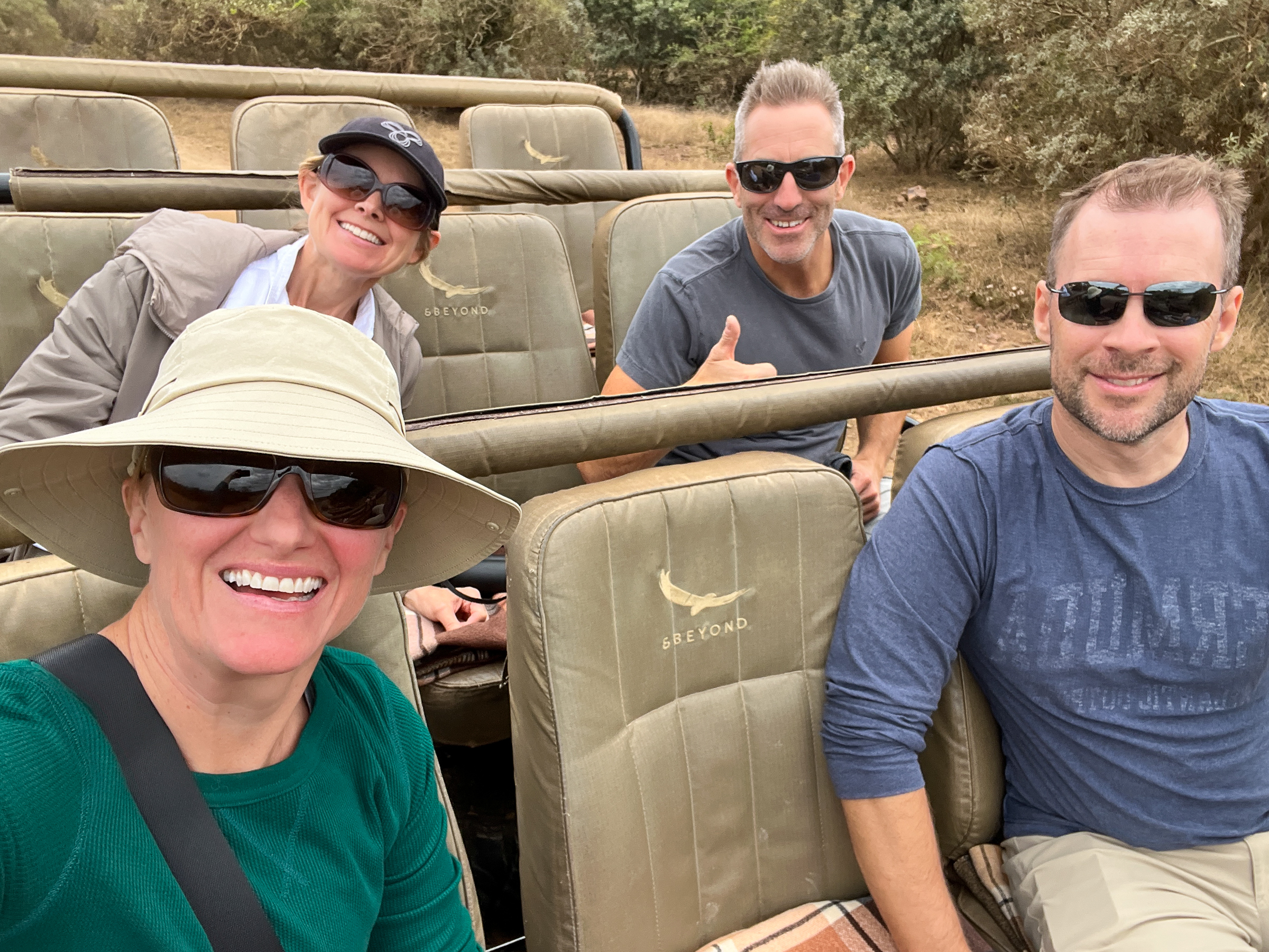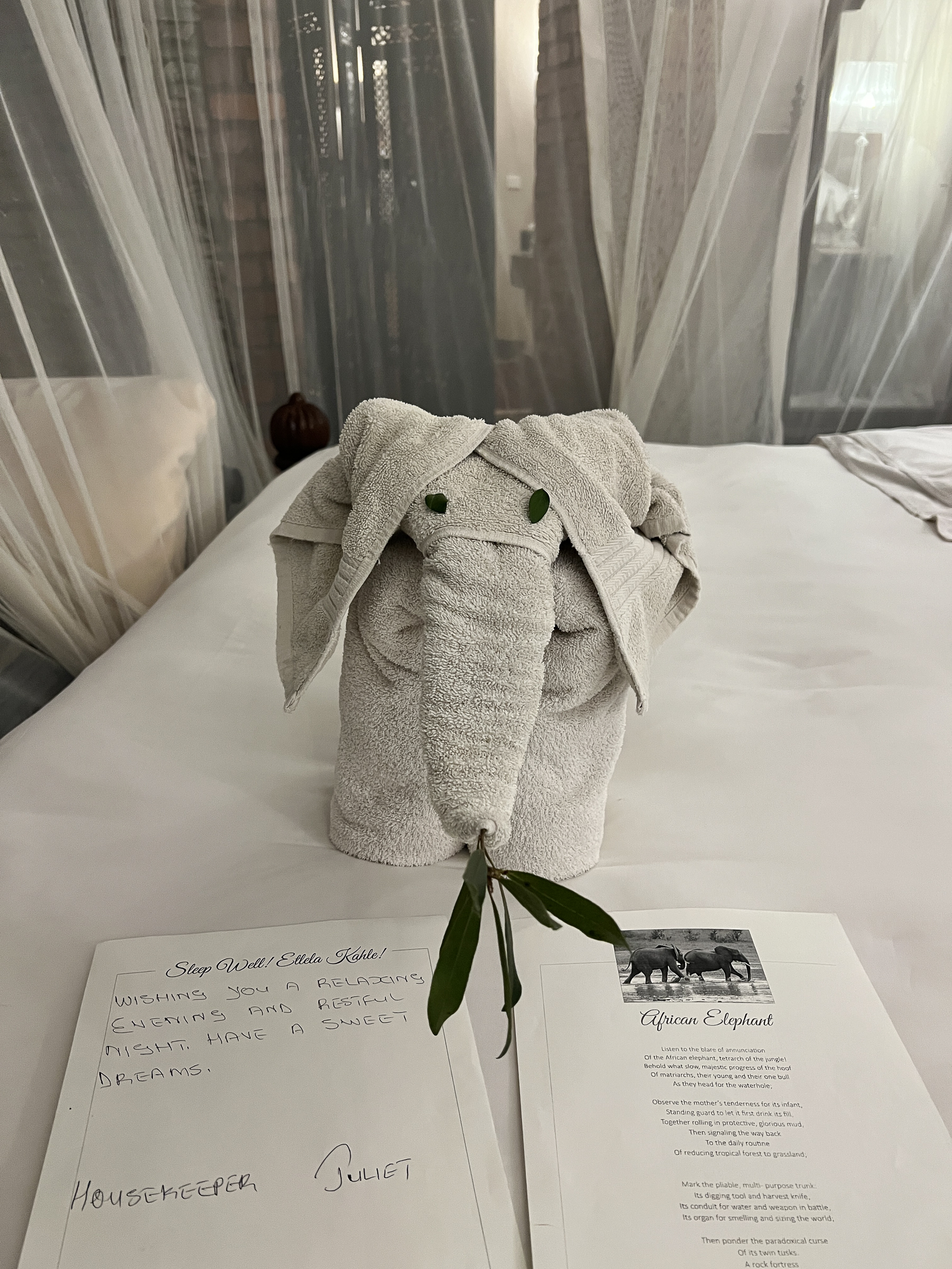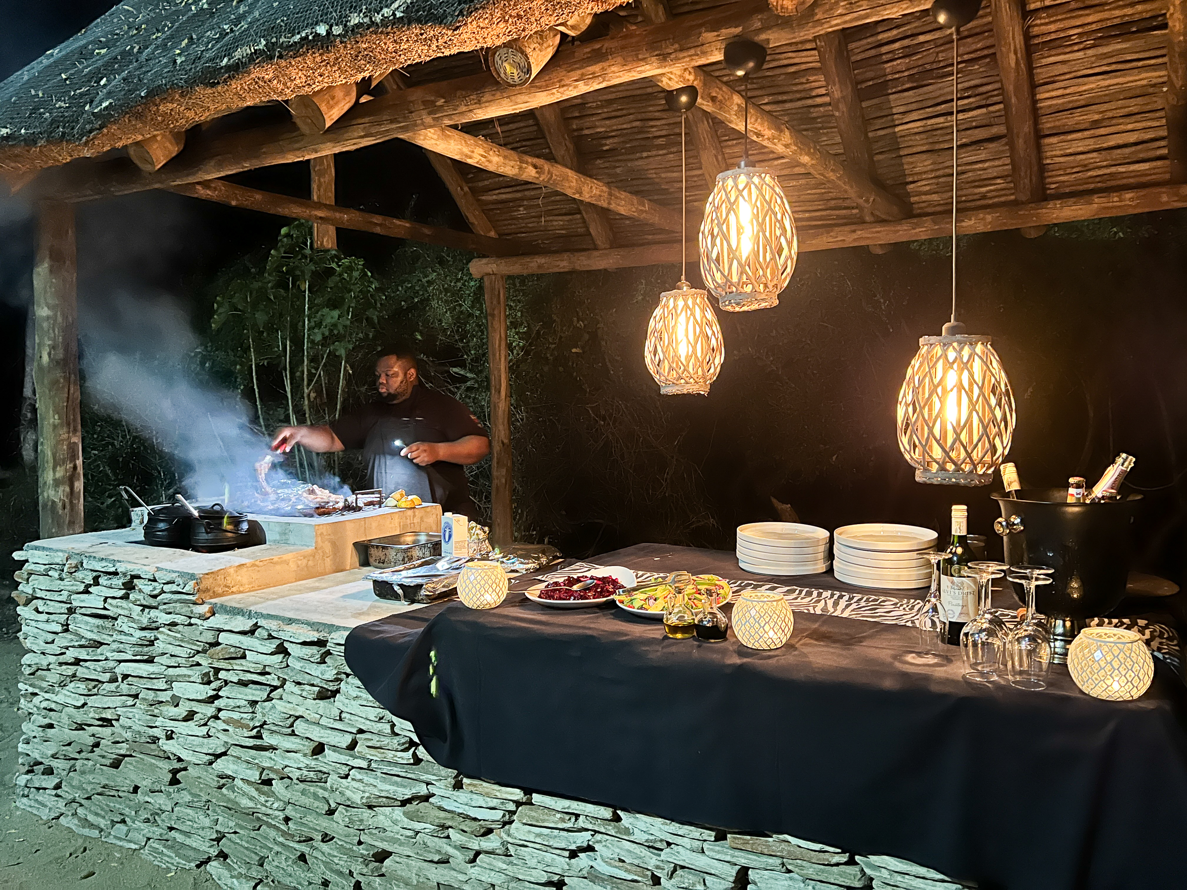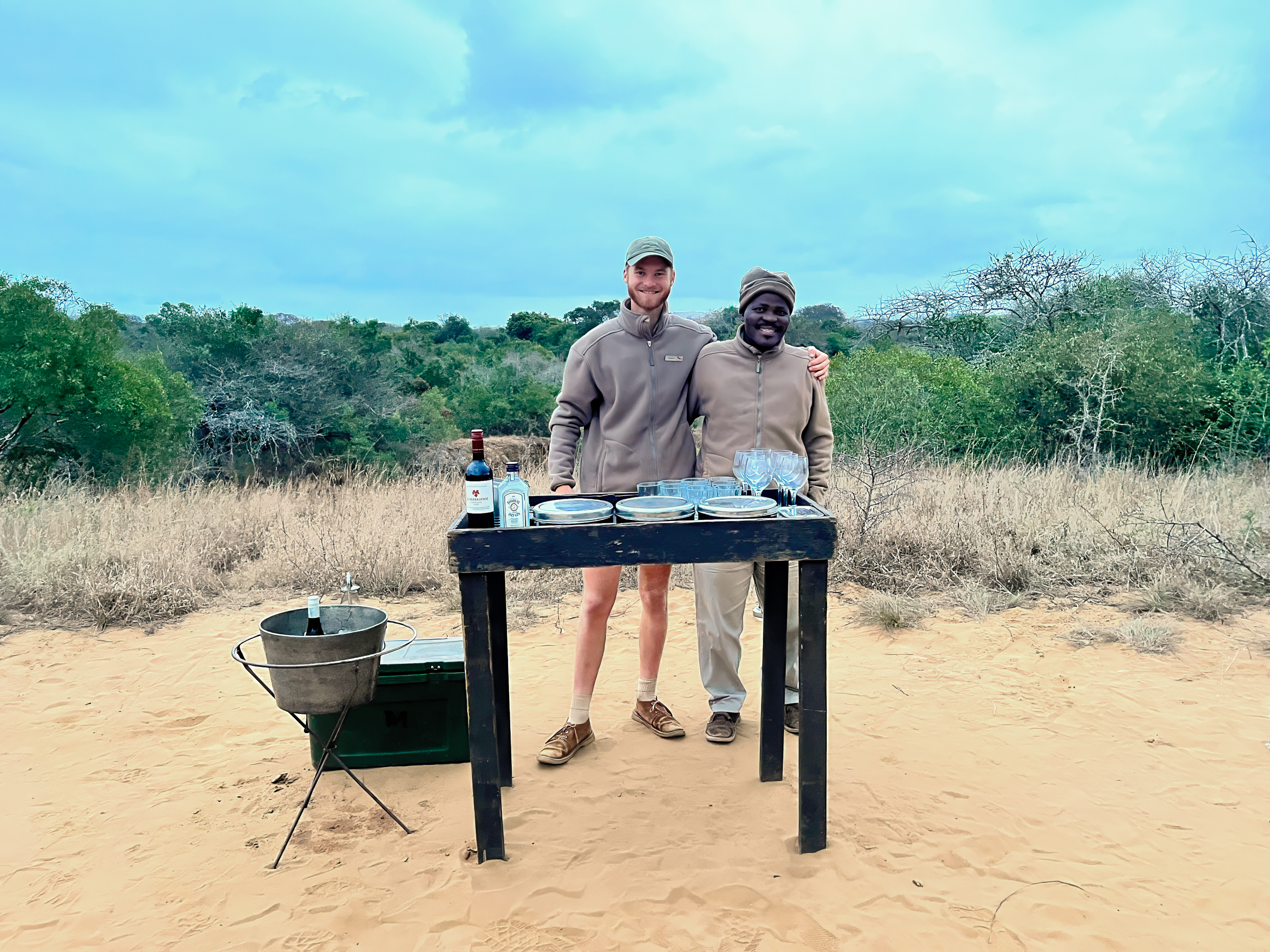 Besides the main attraction – the animals – there were lots of little things that made our stay in Phinda memorable. The lodge itself was beautiful, as were our rooms (thatched-roof shacks for two, typically). The food was exceptional, as was the service – every time we returned from a drive there was someone waiting for us with a hot (or cool) towel and a delicious drink! Dinner one evening was a ‘boma dinner’ – which was a braai (BBQ) in a boma (enclosure like a fenced-in area), the food and ambiance were both amazing. Andrew and Joel were a great team as well, finding animals all over – never a dull moment. We also enjoyed their setting up snacks while making our morning drinks or afternoon cocktails while in the bush! All so, so good.