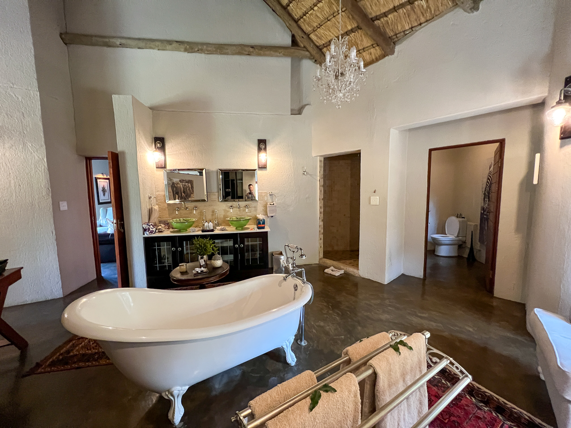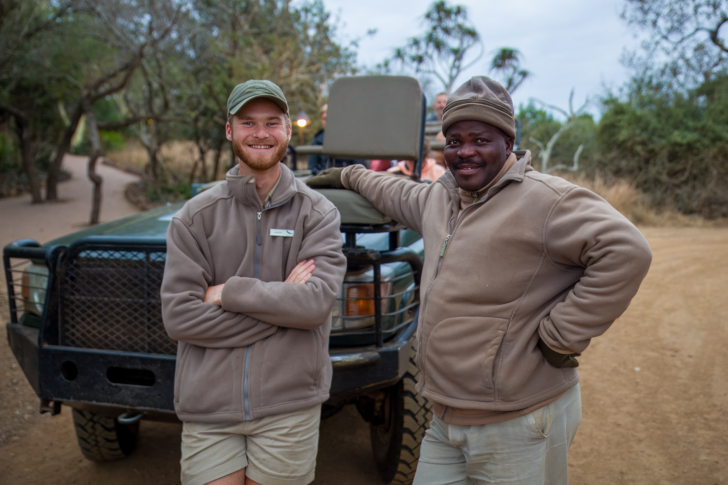 We have many fond memories of our stay here. The food was out of this world, and there was so much – substantial tea was always quite, well, substantial, and we’d always be served a full cake (which we would eat most of – we actually had to ask Mo to make less food as we felt bad leaving so much!) The rooms themselves were awesome, each complete with a plunge pool and a view to an open corridor behind where we often found animals like elephants or baboons strolling by. The Presidential suite had it’s own boma and firepit out back, so Mo did up a full-on braai one evening and the staff came by to sing and dance for us – even Mo and Lonic joined in, it was awesome (plus some Hyenas came by in the dark afterwards to clean up the grill, we could see their eyes glowing in our flashlights… eerie!). We were surprised with a full-on cooked breakfast out in the bush one morning, and another time they surprised us again with a full bar and appetizers around a bonfire in the bush (with other guests this time) after an evening game drive. As at Phinda, our guides were really great, were super knowledgable, and were always happy to stop for us to take a photo (or ten). (Interesting side note – our guide, Mike, has a daughter named Kira that was working at Phinda, we met her briefly when we were there – apparently she called him after we left to give him the low down on us as she knew we were heading his way next… small world!) Such an amazing place, we were sad to have to leave!