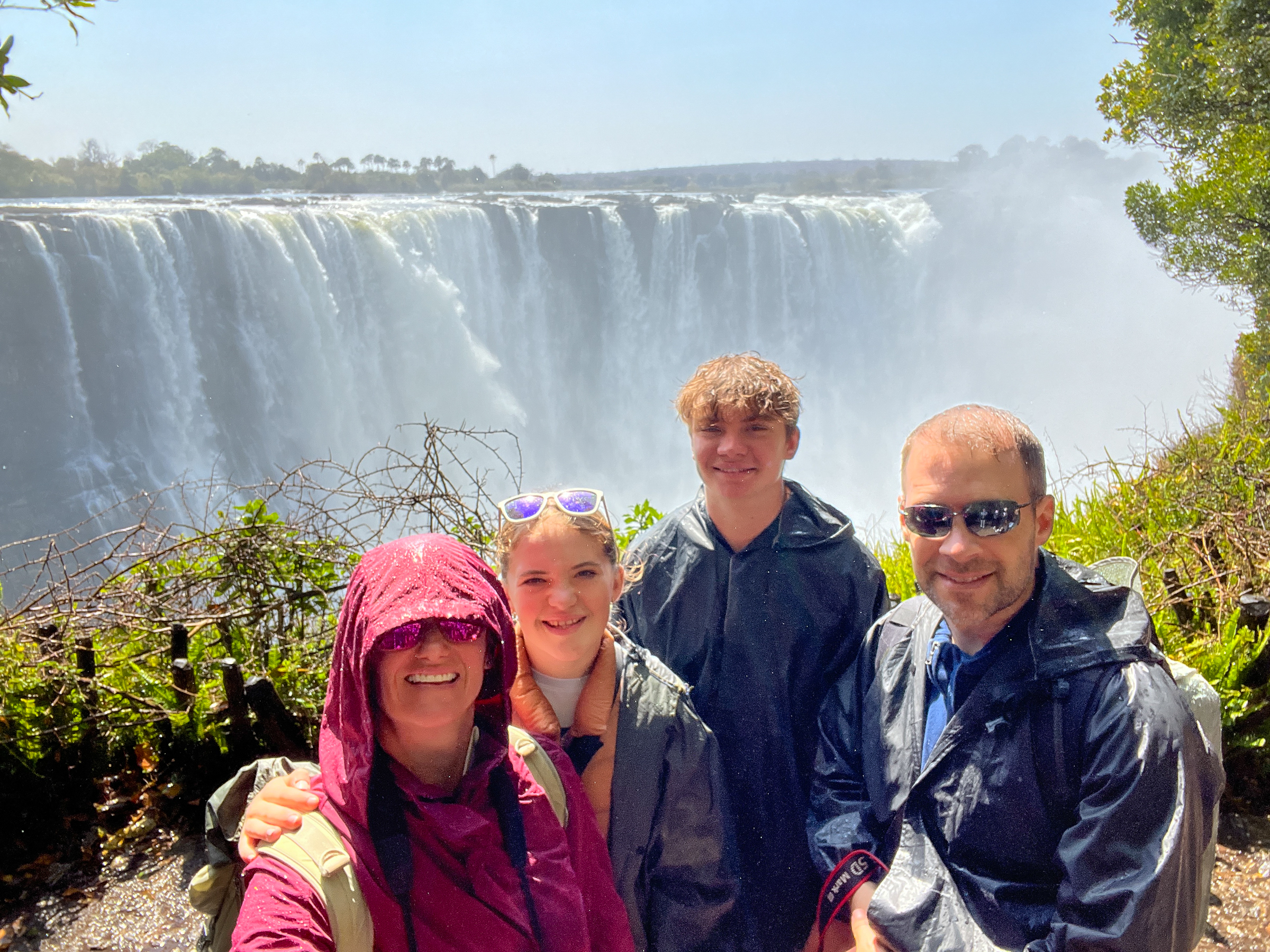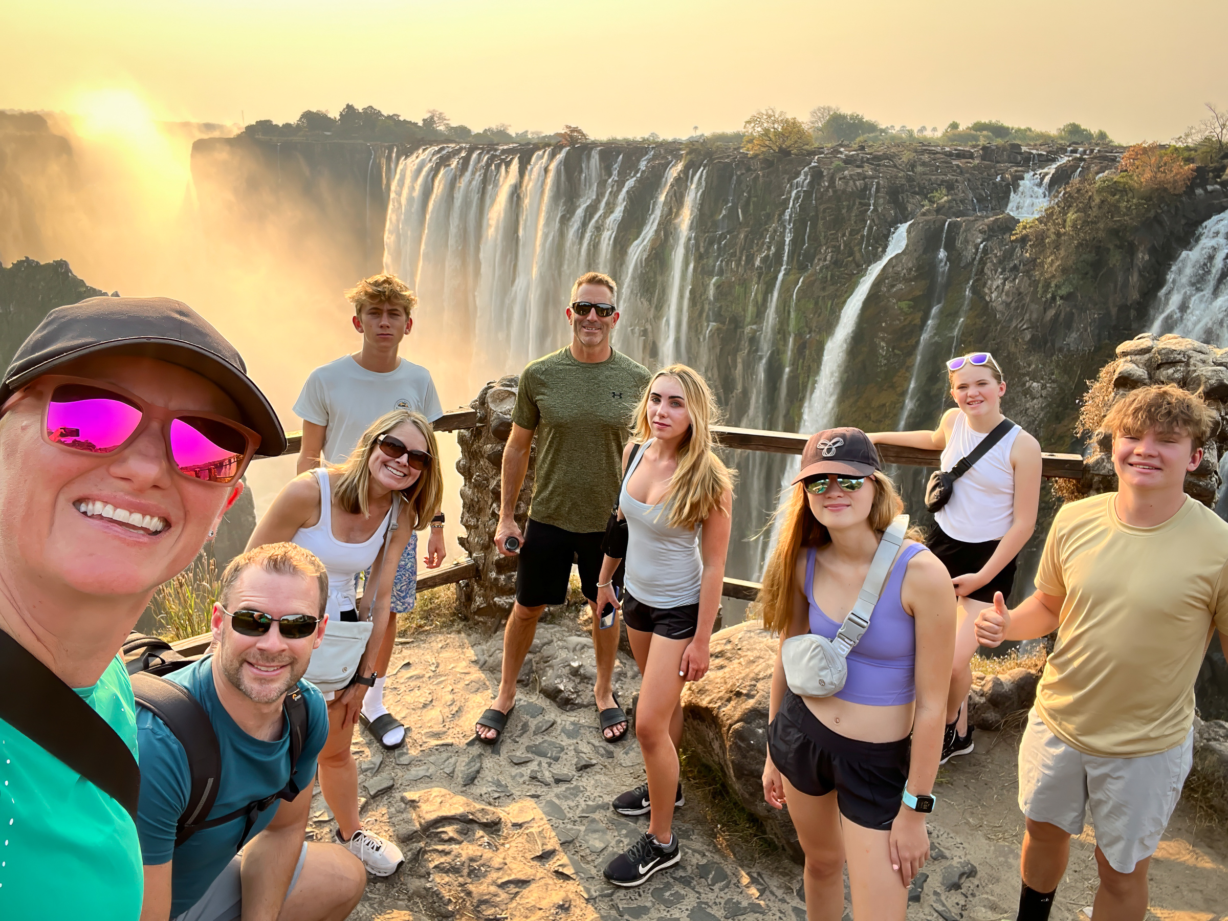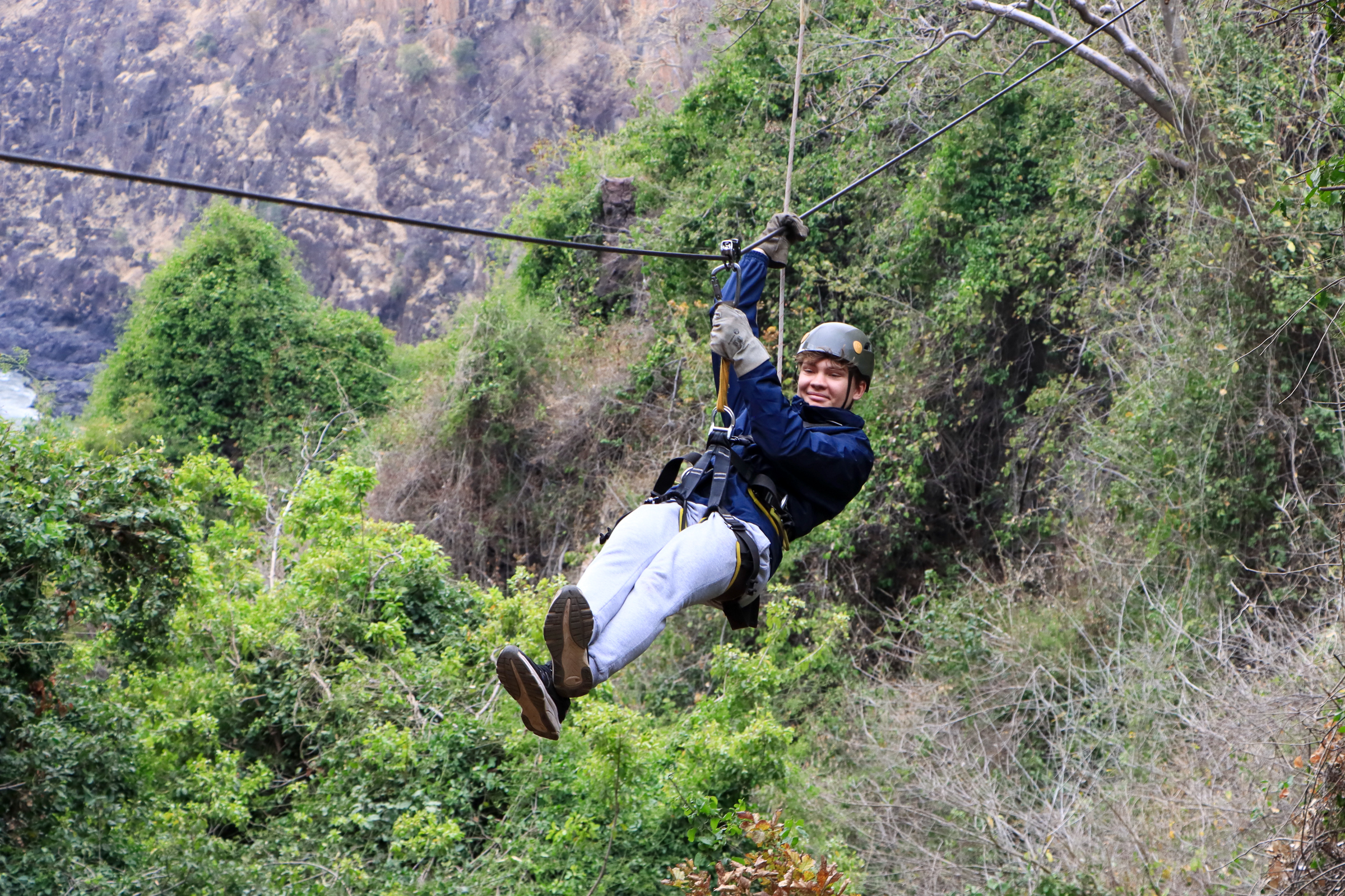 Alas, on day 18 of our vacation (a Thursday), we had to move on to yet another destination. We arrived at the penultimate stop of our African vacation, Avani resort at Victoria Falls in Zambia (after another “private” plane ride back to Kruger then a boring regular plane north to Livingstone, plus a 20 minute drive to the resort). Avani was decent – we knew Phinda and Tintswalo would be the highlights of the trip – everything from here on out was gravy. We wanted to tick the box and see Victoria Falls, so we walked over right after we arrived at the resort and dropped our bags in our rooms. It didn’t disappoint; it was pretty amazing at sunset, even if it wasn’t in full flow this time of year! The next day we adventured around in the area; the boys went quadding, the girls went shopping in nearby Livingstone, then we went on a jet boat ride up the river (through rapids, too!) to the Elephant Cafe to feed some of the gentle giants. We squeezed in a zip line at the Victoria Falls bridge, too – Ryley and Isla got to go tandem, which was pretty cool!