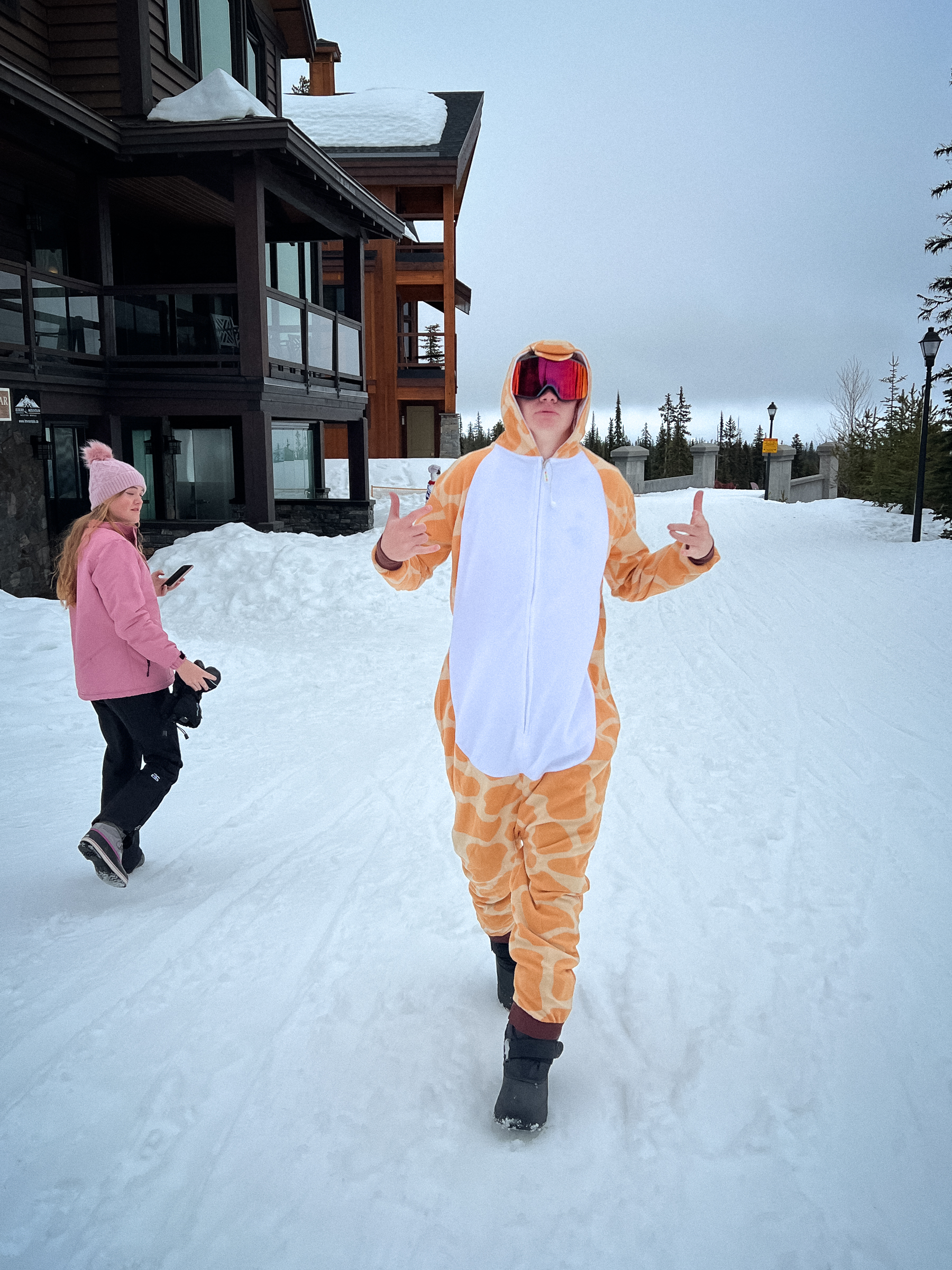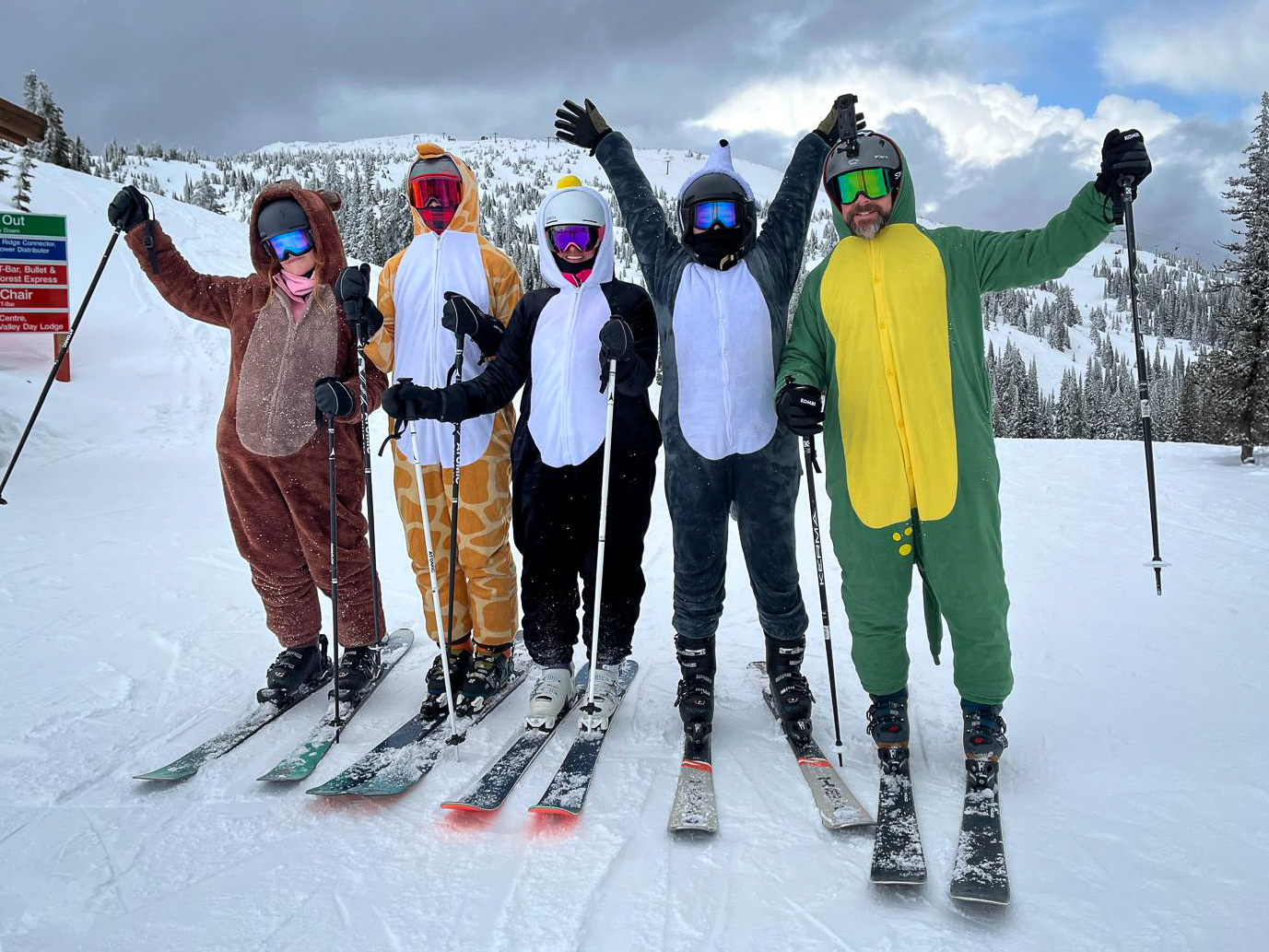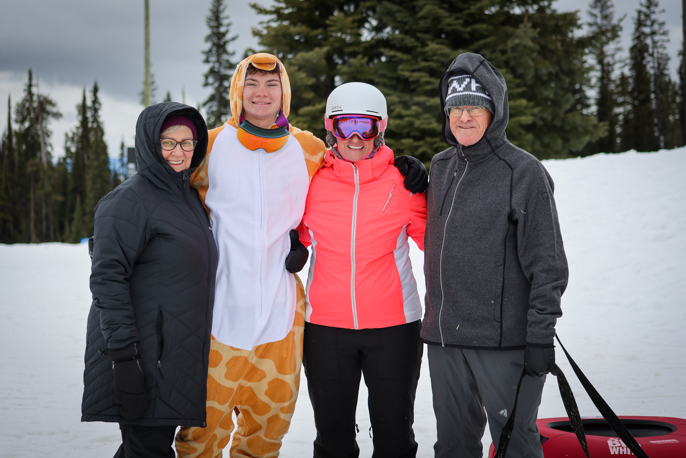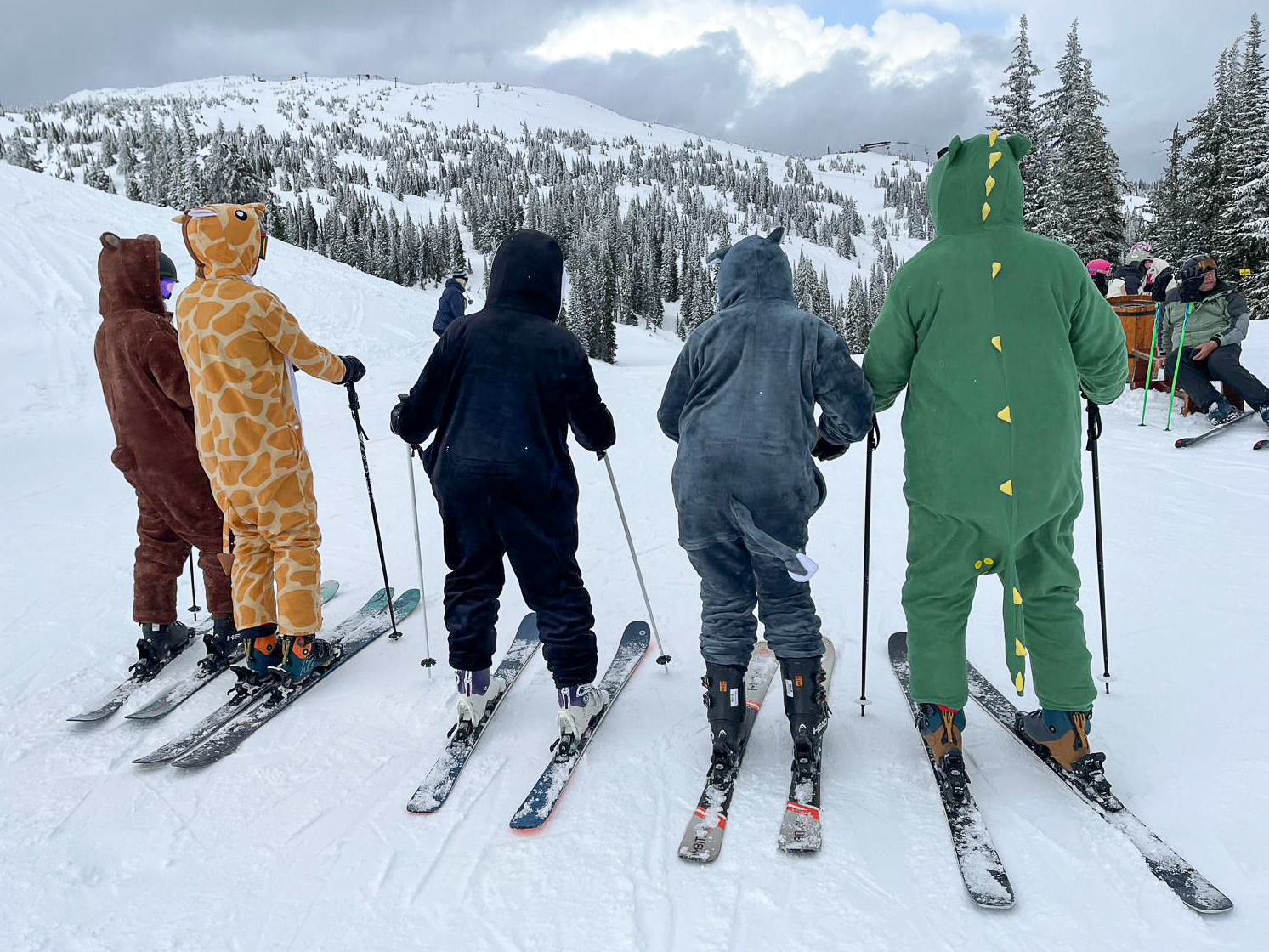 Again, we ticked all the usual boxes – Easter egg hunt, lots of great meals, Josh making churros, making puzzles, tubing in Happy Valley… and we added a few new ones, like attending the last Quiz Night of the season (we didn’t win 🙁 ), having a few apres ski sessions at the Woods pub in the village, and we managed to visit a bit with a few friends we don’t normally see like the Matthews, Suzy & Jim, the Orchards, and the Carrs (all have a current or former connection to Bermuda). Some of us also skiied in a few areas we hadn’t before, like the Cliff and a secret spot with a beer can Christmas tree… Jenn also mixed it up a bit with a few sessions of cross-country skiing to keep her fitness up for an upcoming trip to Japan! One other fun addition was that we wore some silly costumes on the ski hill for a day, it was dino-mite! 😉