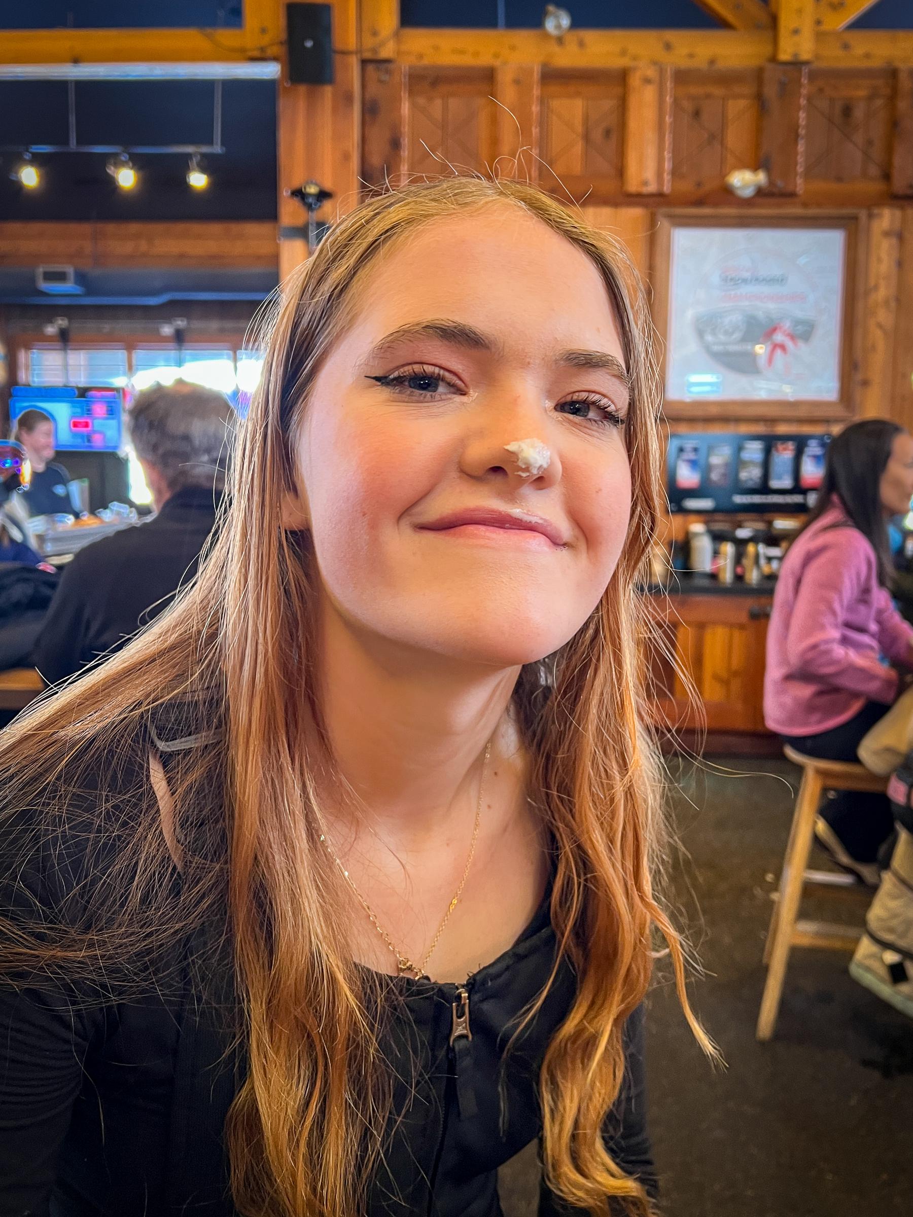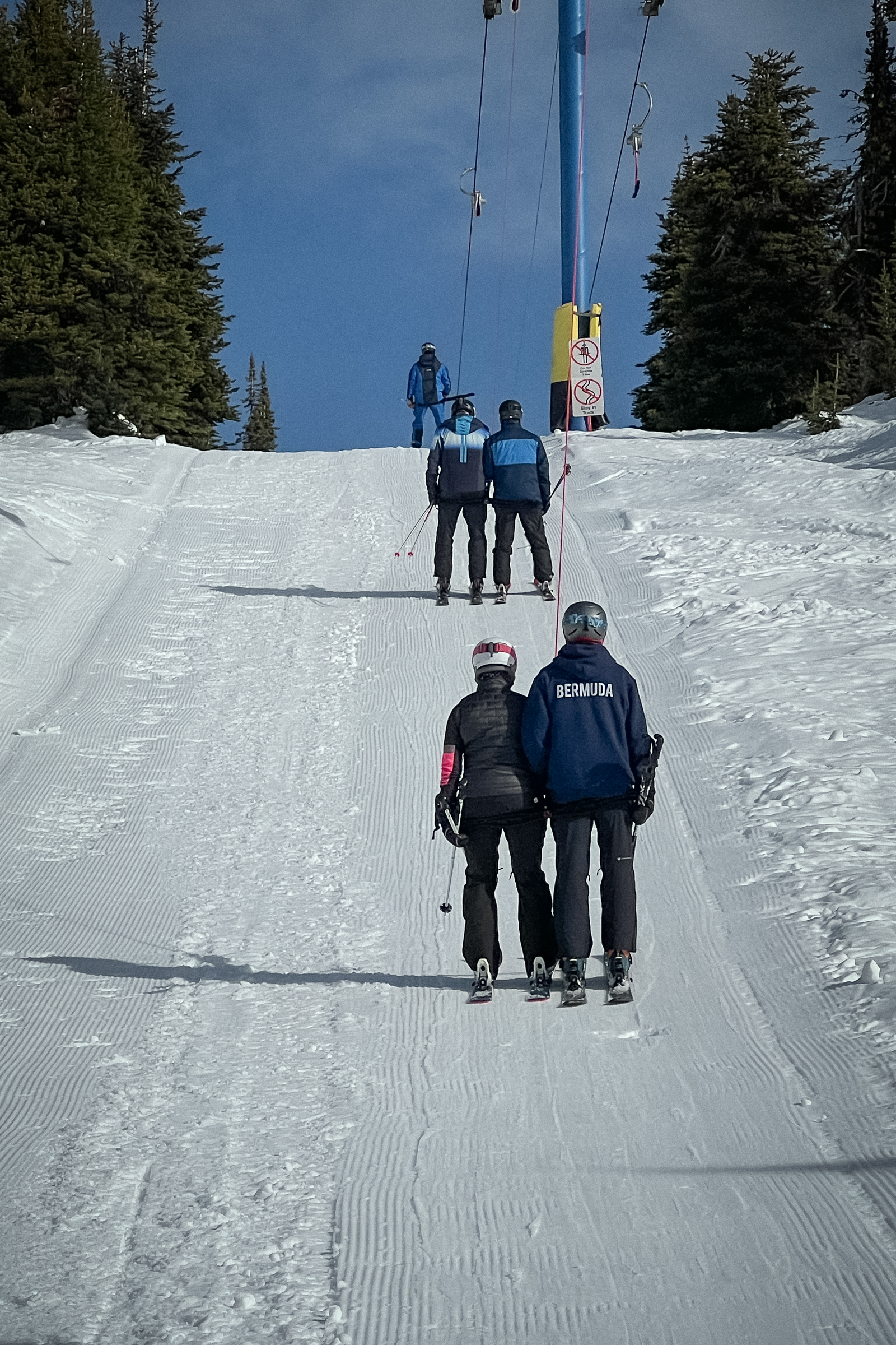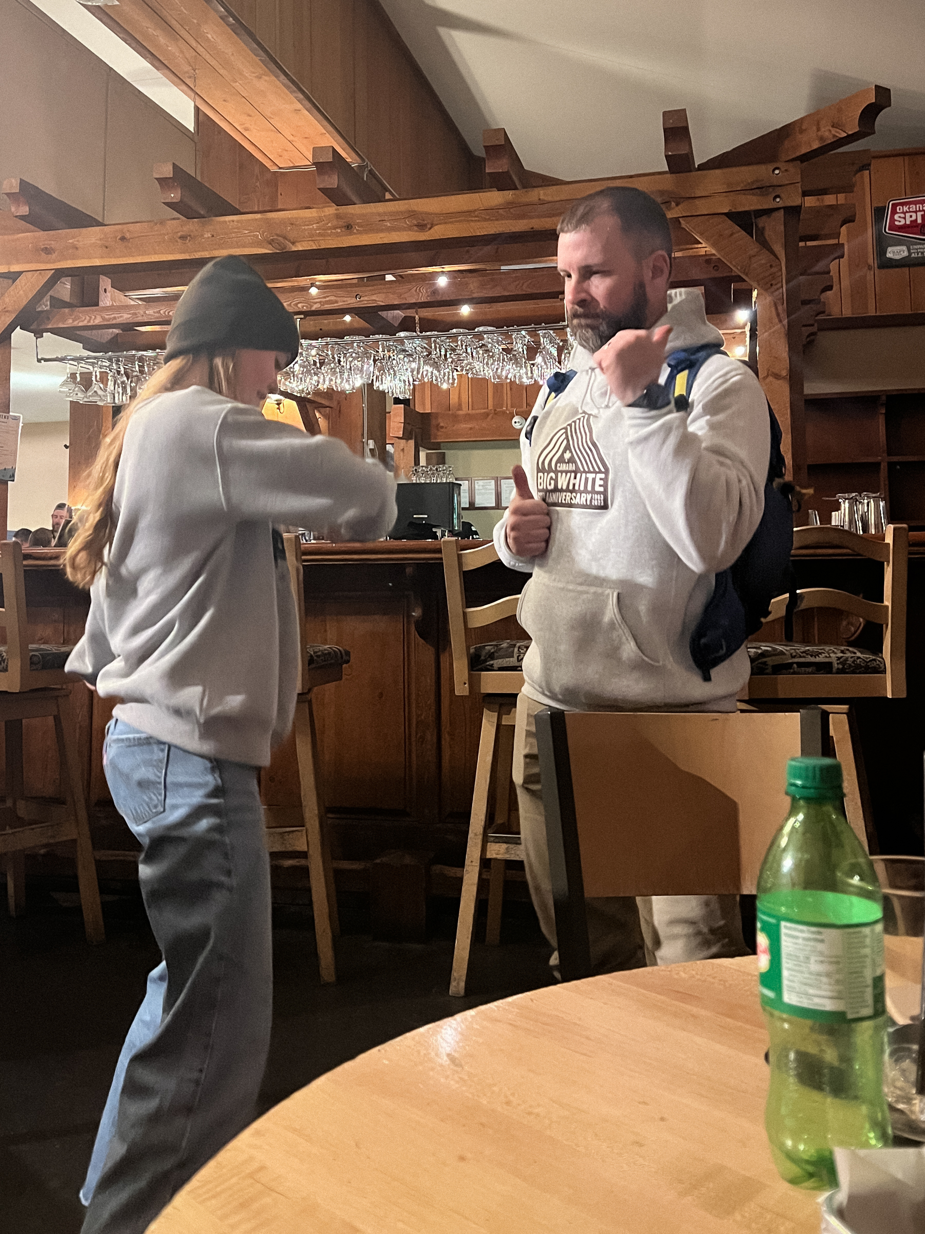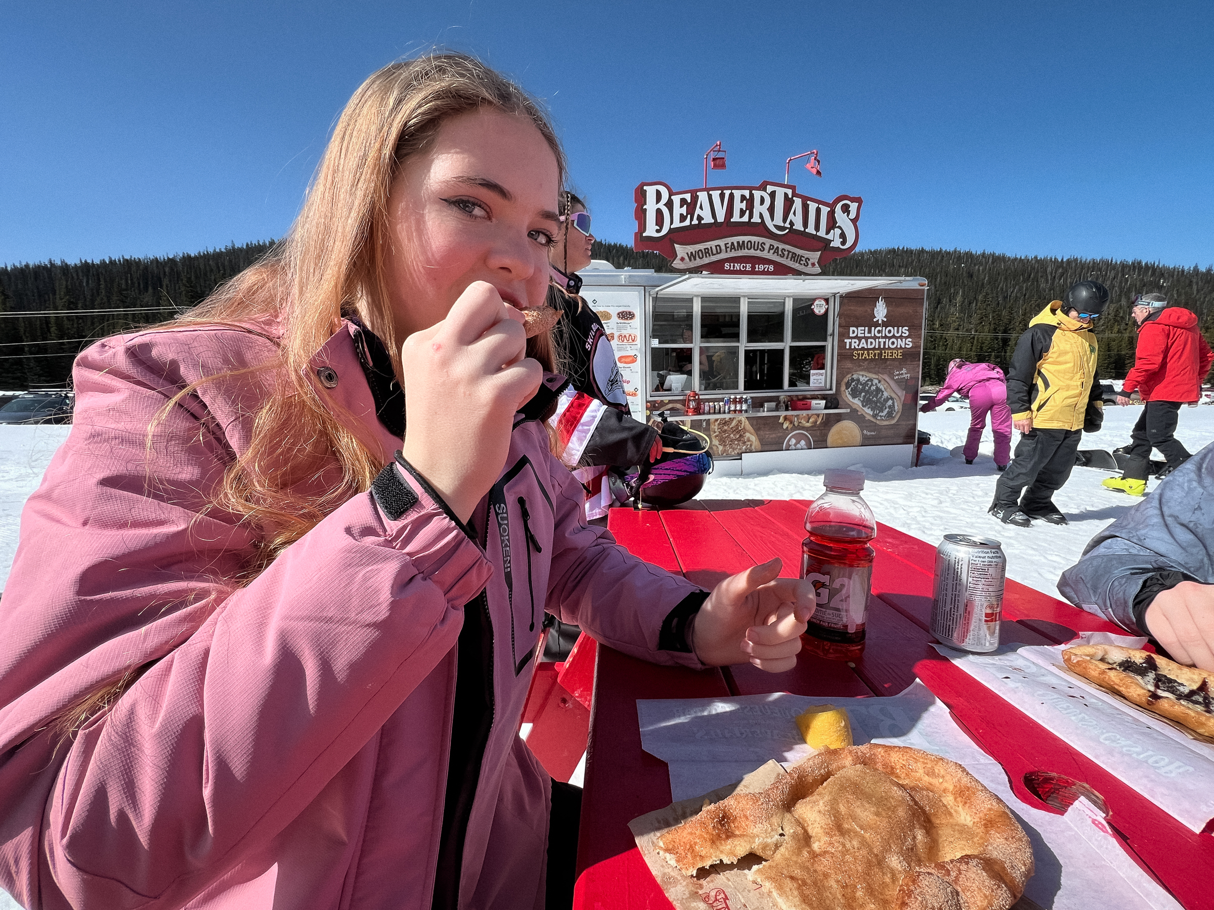 Again, we ticked all the usual boxes – Easter egg hunt, lots of great meals, Josh making churros, making puzzles, tubing in Happy Valley… and we added a few new ones, like attending the last Quiz Night of the season (we didn’t win 🙁 ), having a few apres ski sessions at the Woods pub in the village, and we managed to visit a bit with a few friends we don’t normally see like the Matthews, Suzy & Jim, the Orchards, and the Carrs (all have a current or former connection to Bermuda). Some of us also skiied in a few areas we hadn’t before, like the Cliff and a secret spot with a beer can Christmas tree… Jenn also mixed it up a bit with a few sessions of cross-country skiing to keep her fitness up for an upcoming trip to Japan! One other fun addition was that we wore some silly costumes on the ski hill for a day, it was dino-mite! 😉