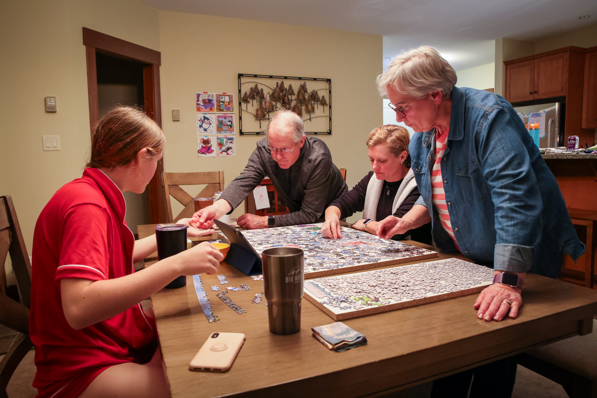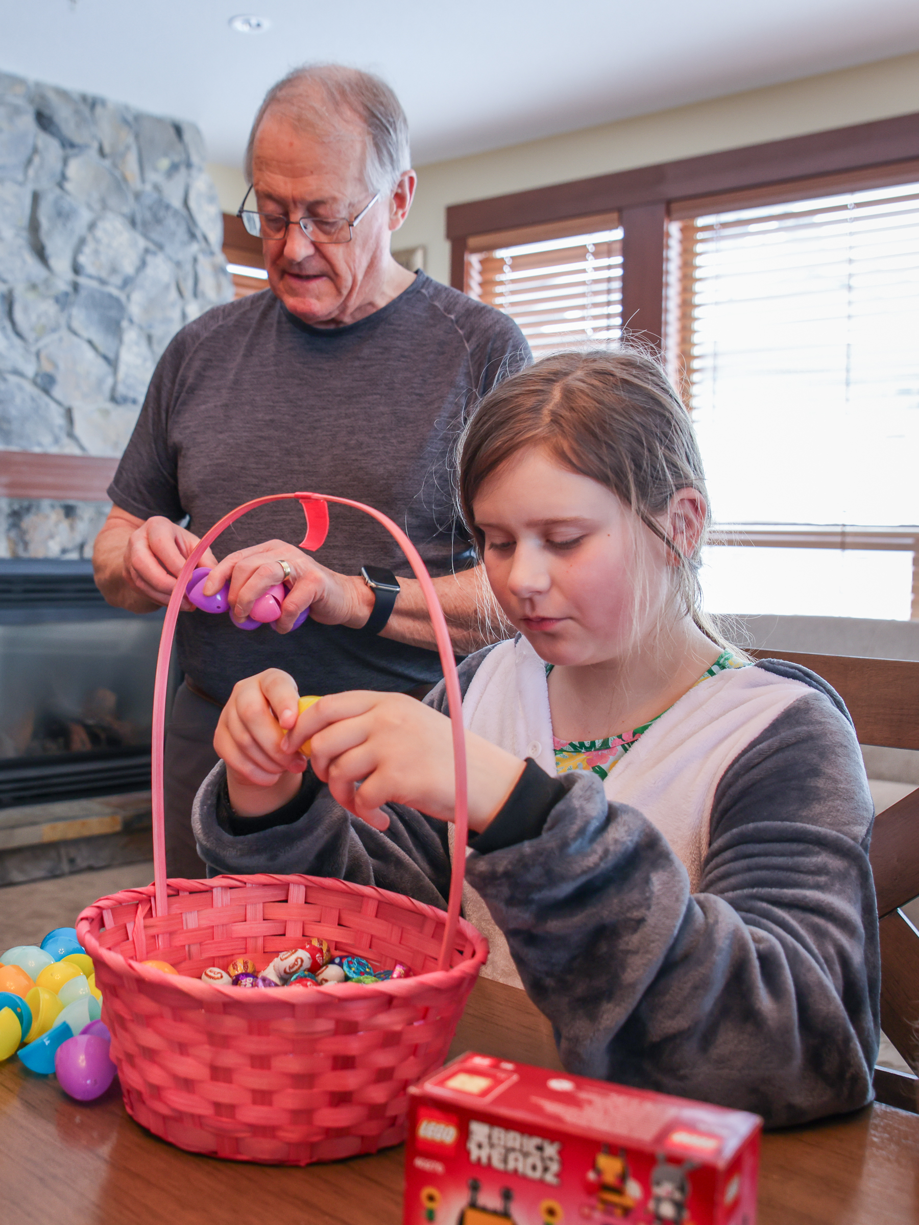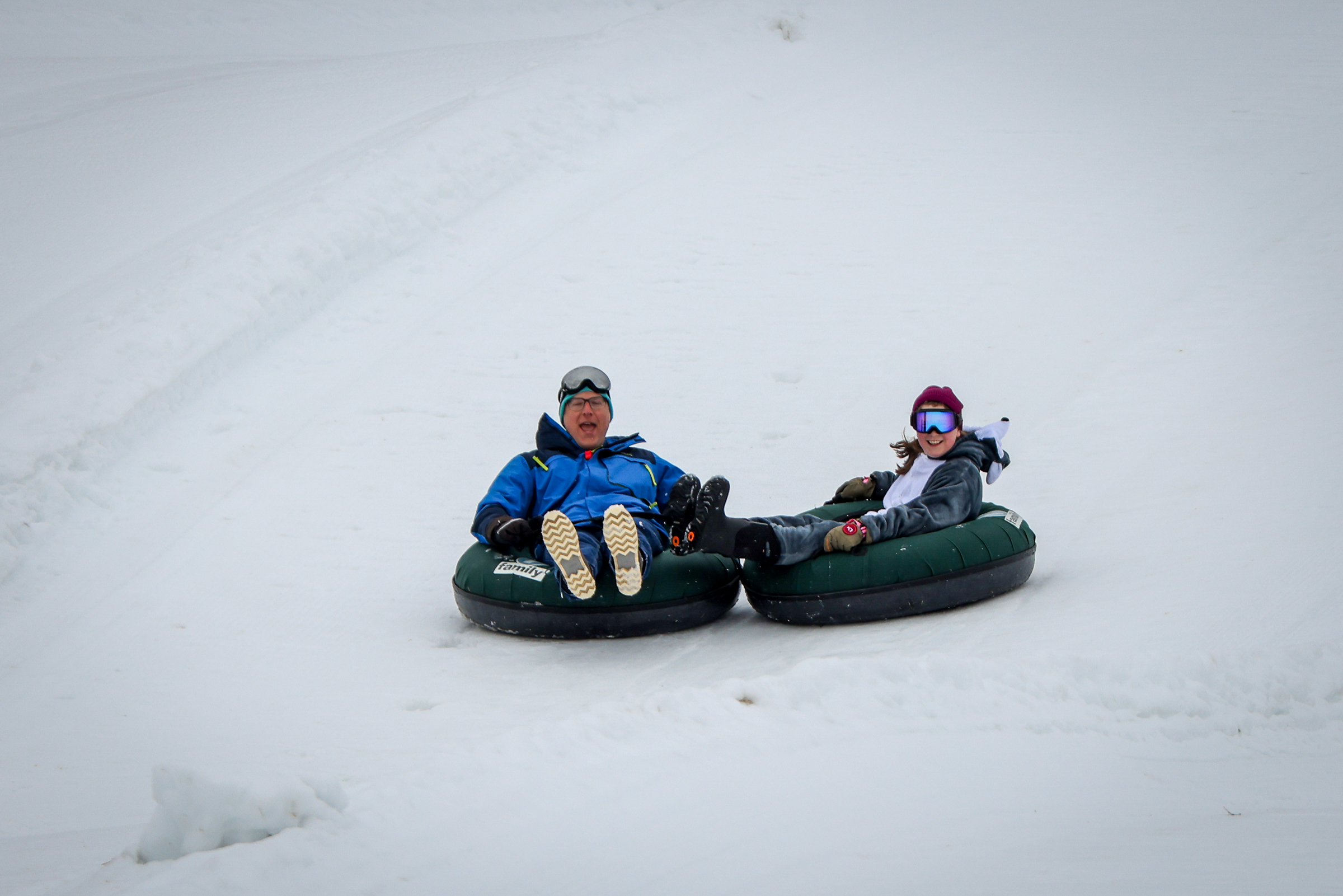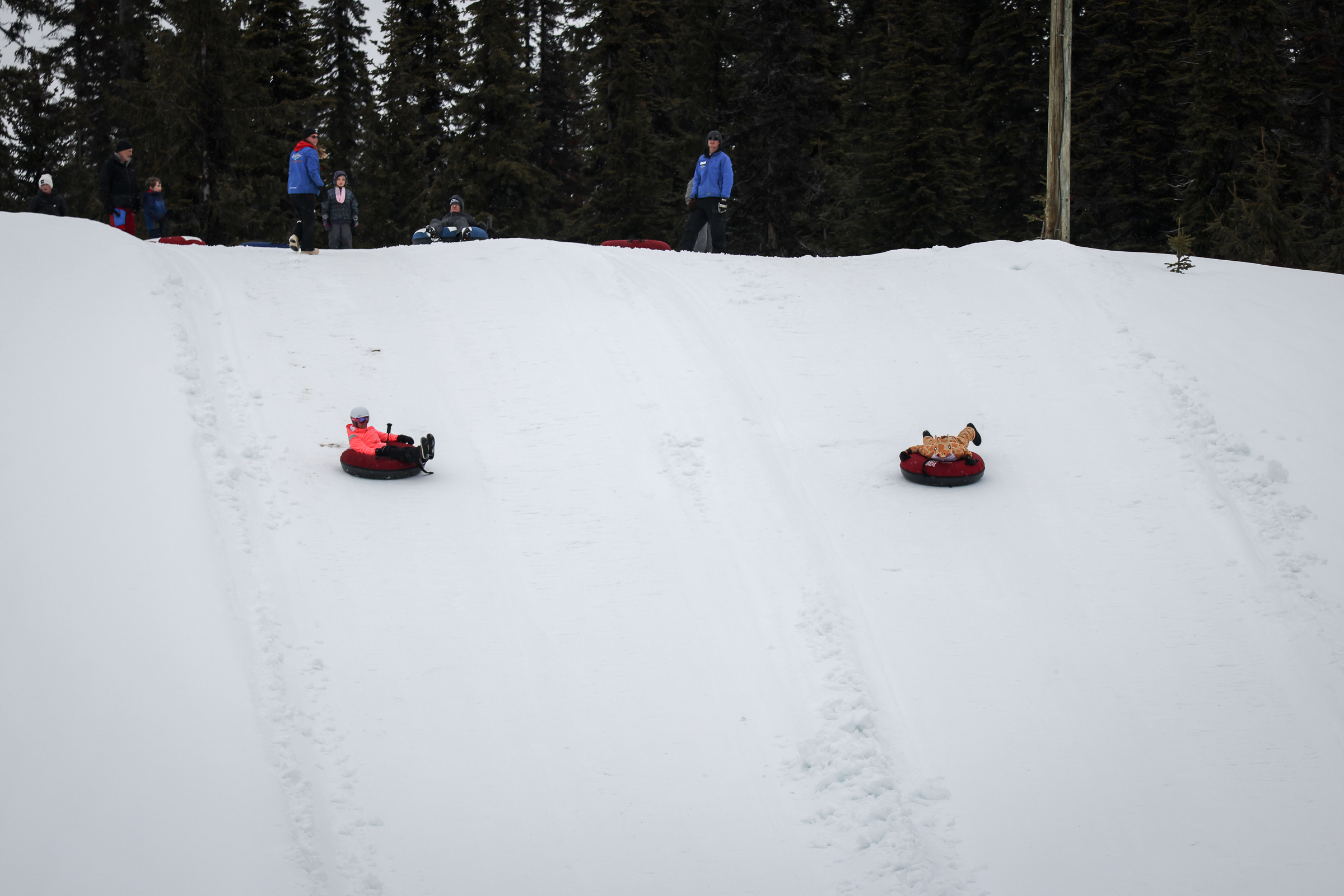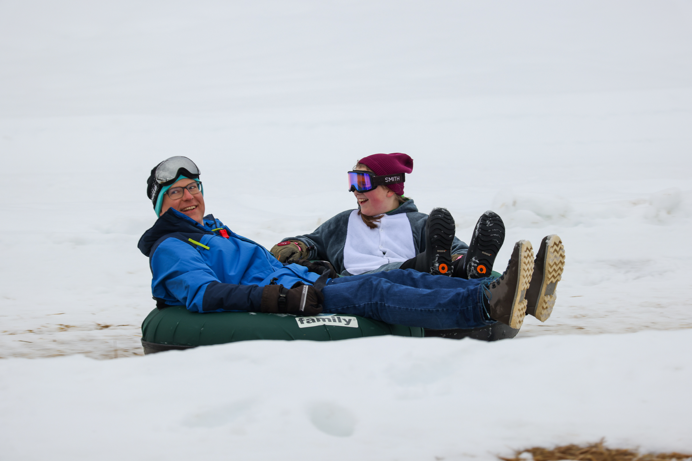 Again, we ticked all the usual boxes – Easter egg hunt, lots of great meals, Josh making churros, making puzzles, tubing in Happy Valley… and we added a few new ones, like attending the last Quiz Night of the season (we didn’t win 🙁 ), having a few apres ski sessions at the Woods pub in the village, and we managed to visit a bit with a few friends we don’t normally see like the Matthews, Suzy & Jim, the Orchards, and the Carrs (all have a current or former connection to Bermuda). Some of us also skiied in a few areas we hadn’t before, like the Cliff and a secret spot with a beer can Christmas tree… Jenn also mixed it up a bit with a few sessions of cross-country skiing to keep her fitness up for an upcoming trip to Japan! One other fun addition was that we wore some silly costumes on the ski hill for a day, it was dino-mite! 😉